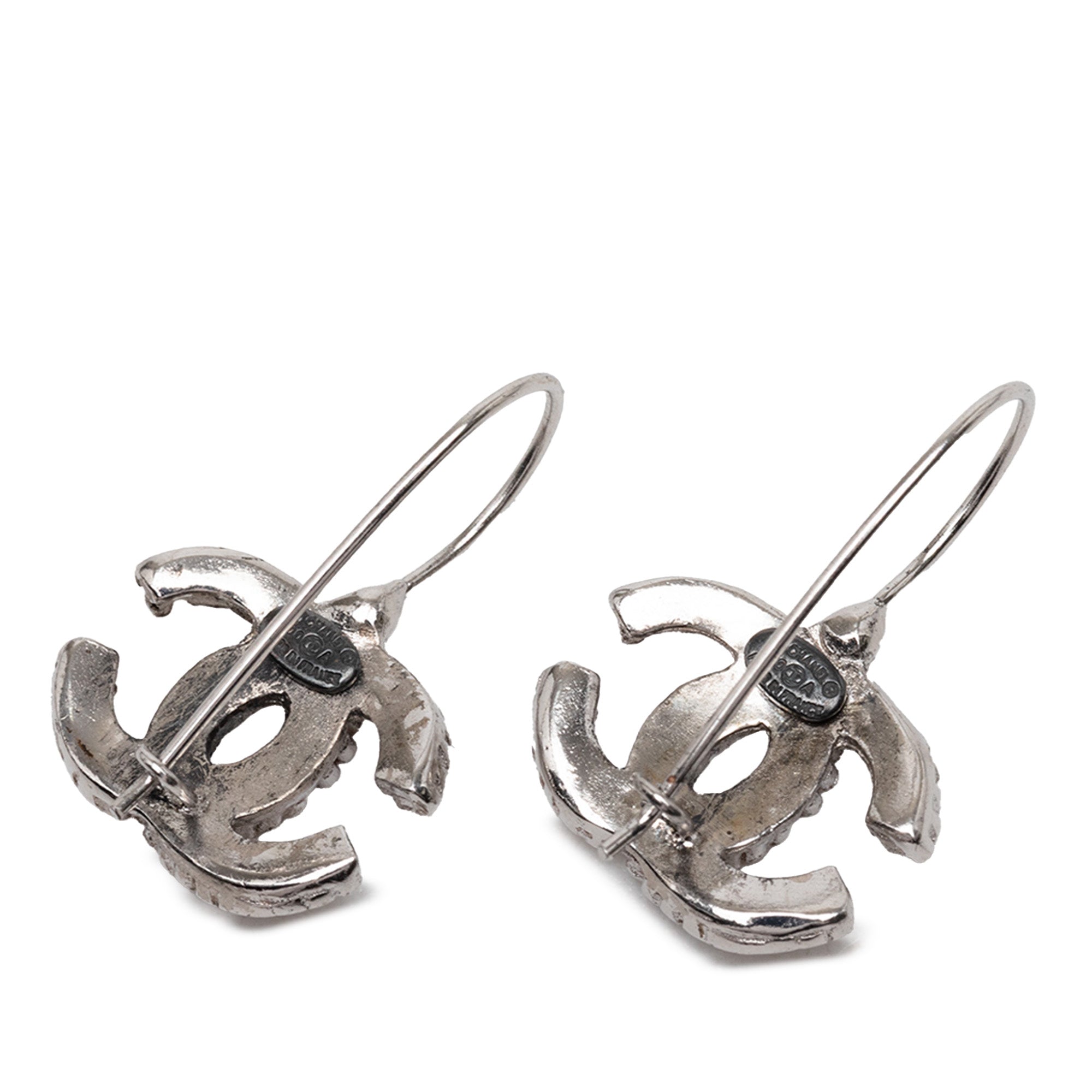 Product Details: Silver Chanel Silver Plated CC Hook Earrings. These earrings feature silver-tone metal bodies and hook closures. 0.9" L x 0.6" W x 0" D. Serial number 00A.