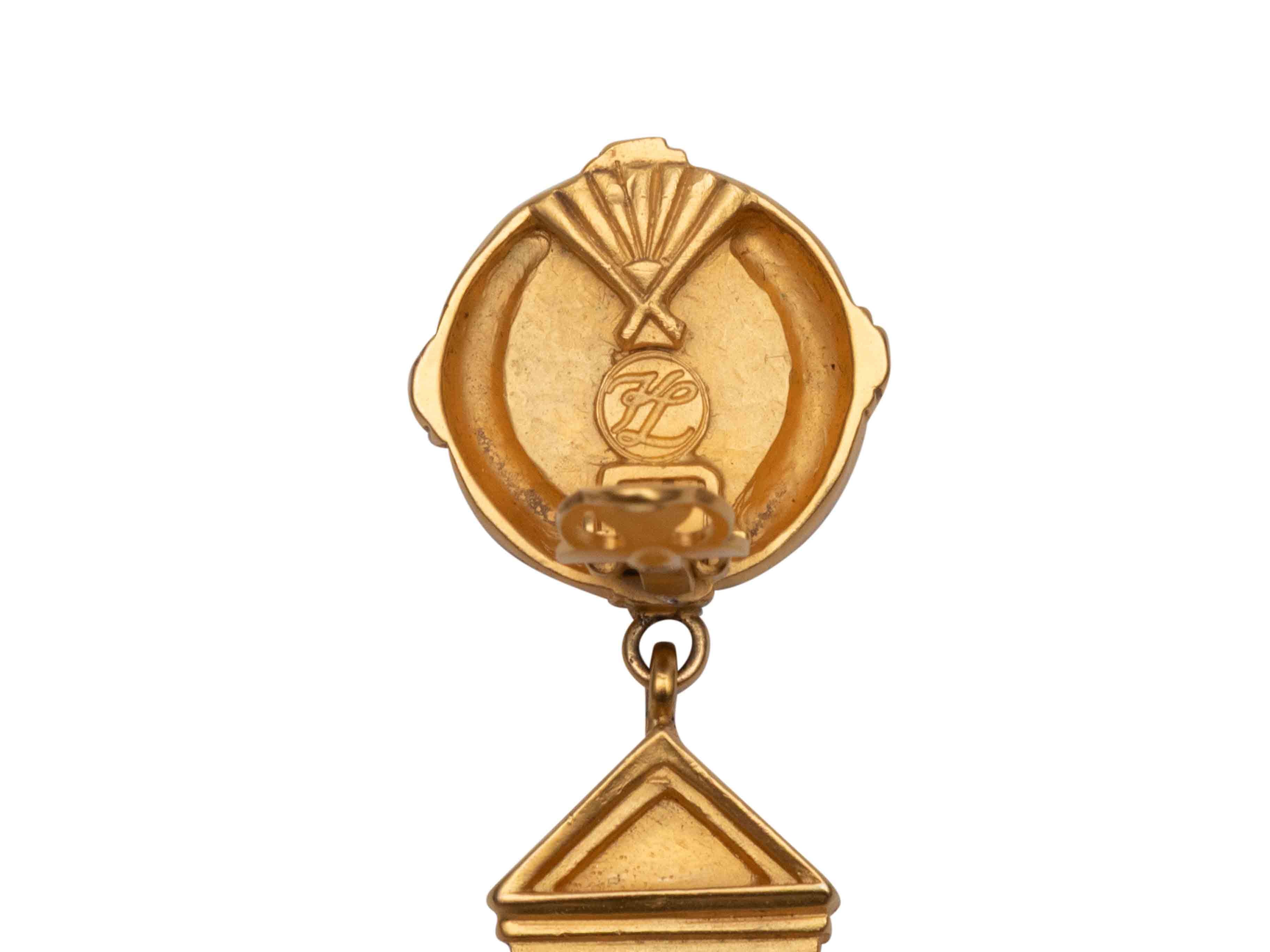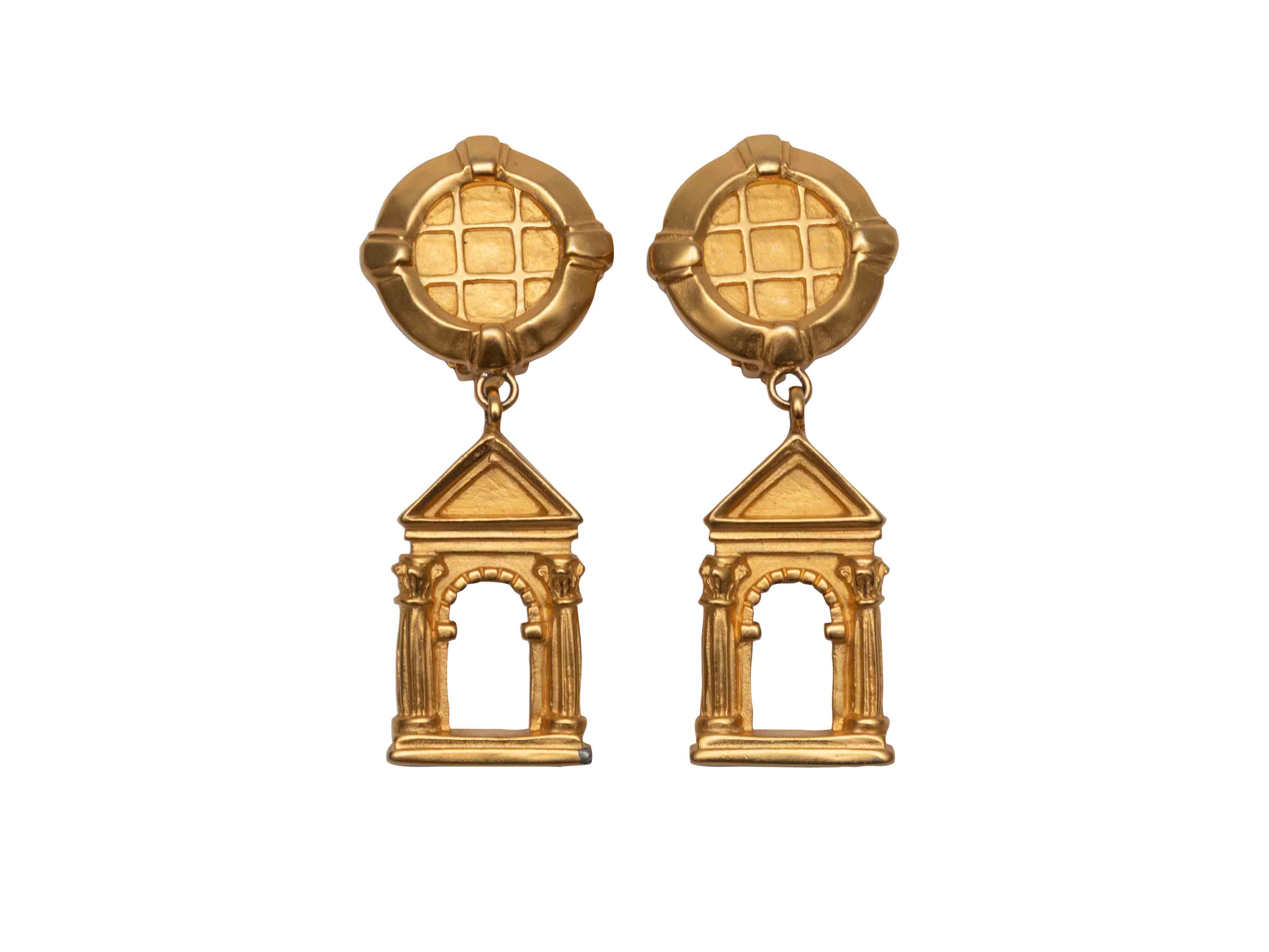 Product Details: Vintage gold-tone metal clip-on archway drop earrings by Karl Lagerfeld. 1" width, 2.5" length.