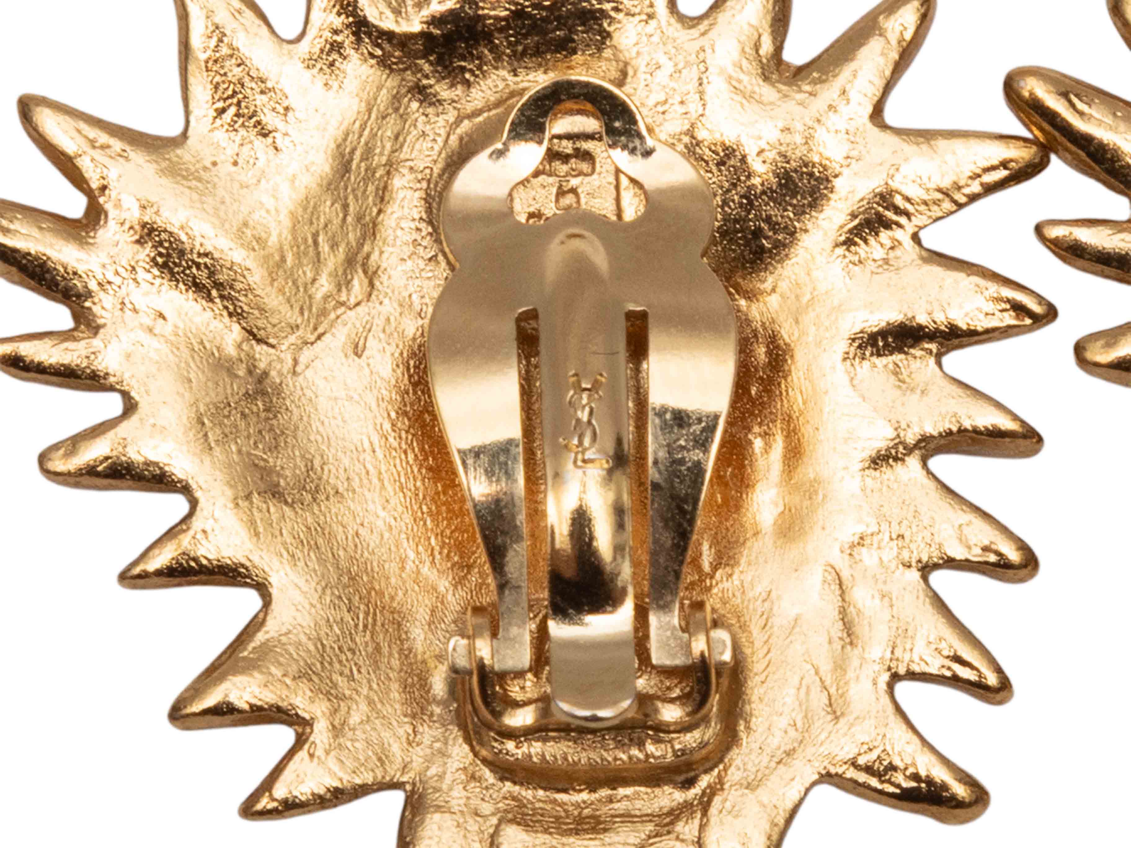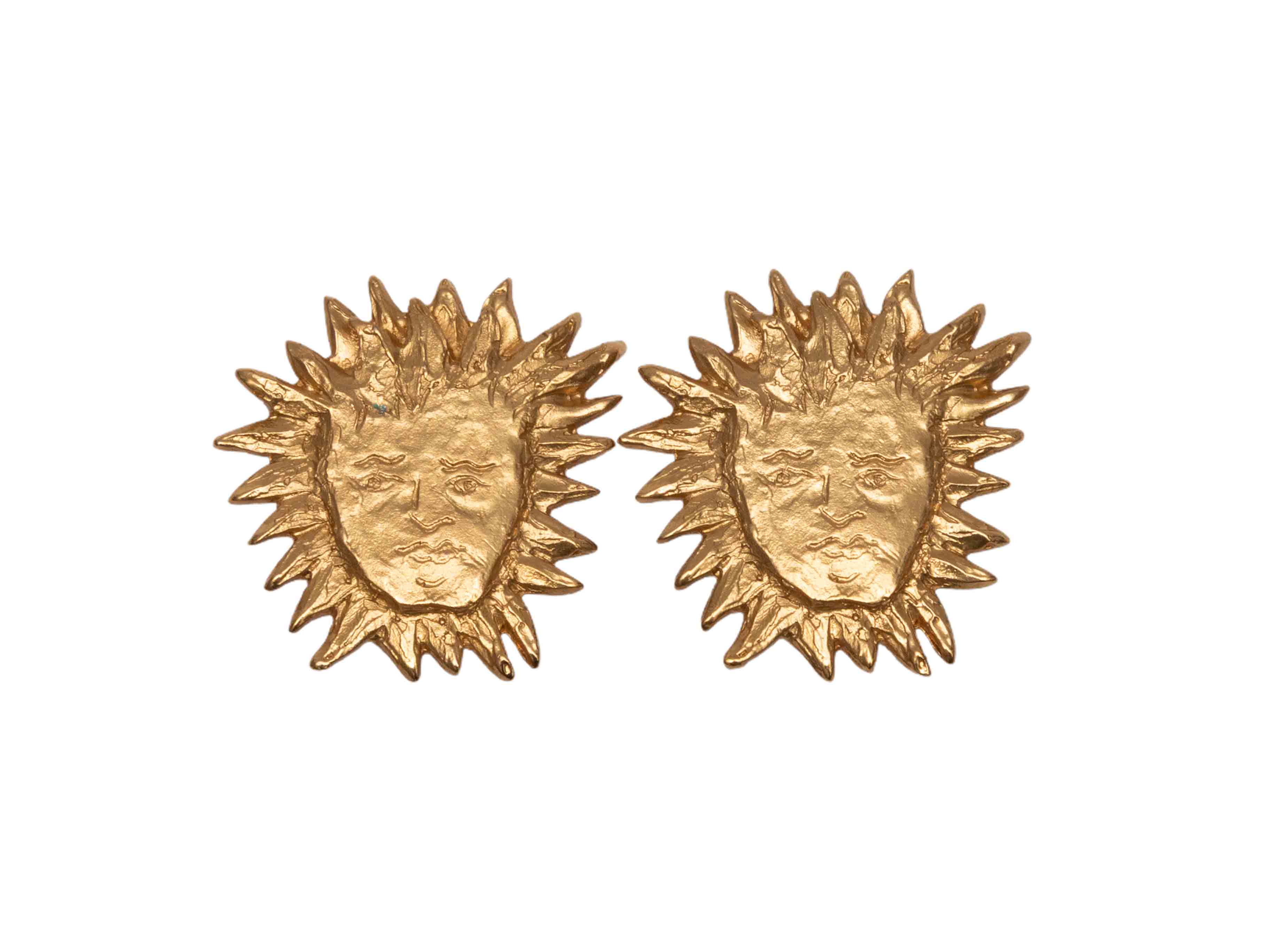 Product Details: Vintage gold-tone metal Sun King clip-on earrings by Yves Saint Laurent. 1.25" width, 1.25" length.