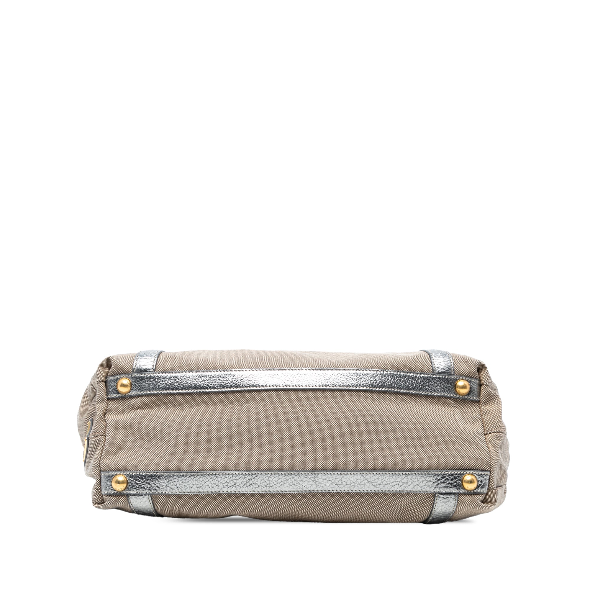 Product Details: Beige Prada Canvas Canapa Logo Tote. This tote features a canvas body with leather trim, flat leather straps, an open top with snap closure, and interior zip and slip pockets. 10.4" L x 13" W x 5.1" D.