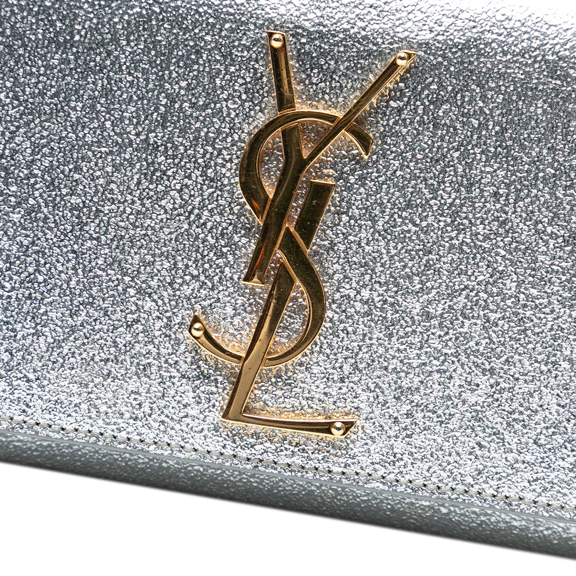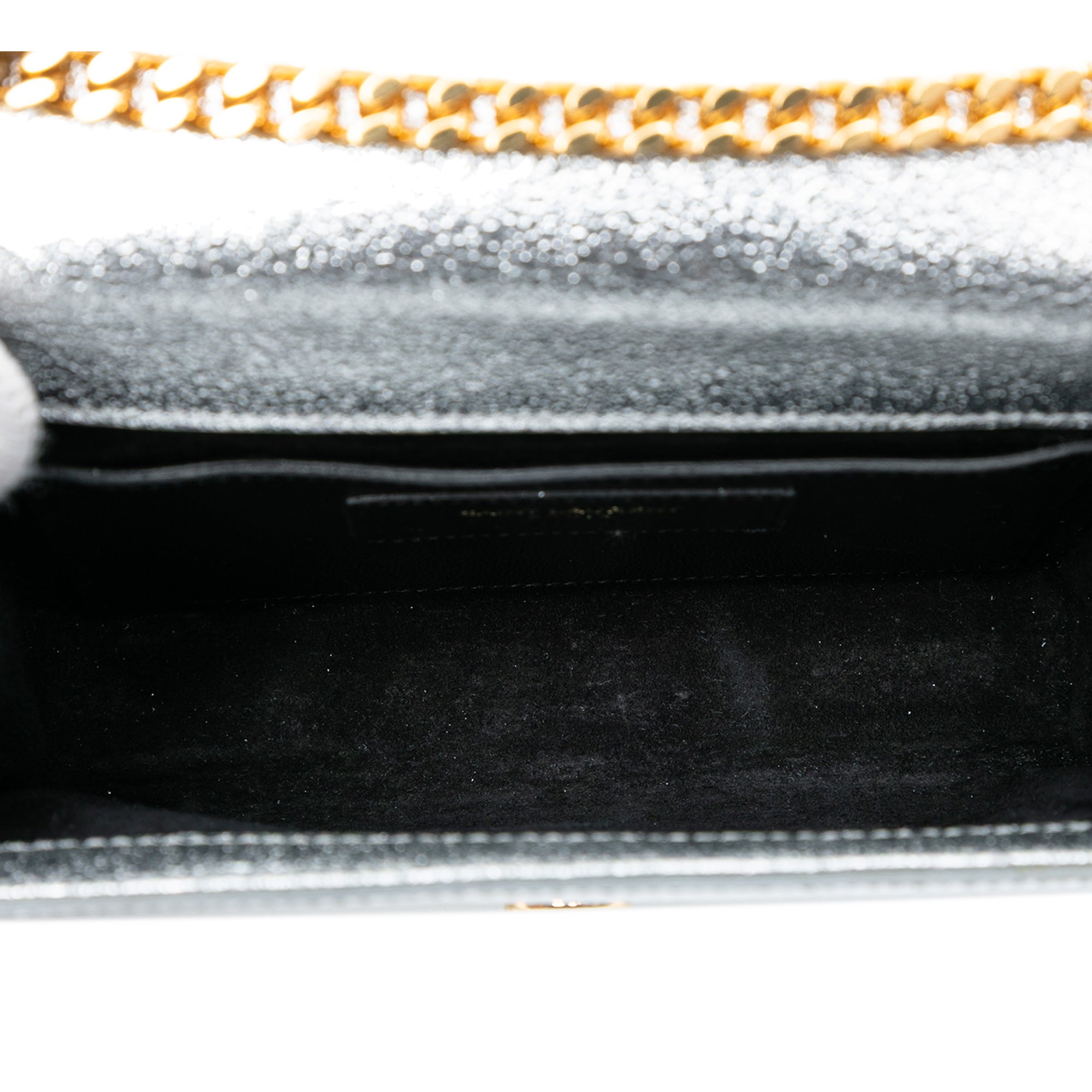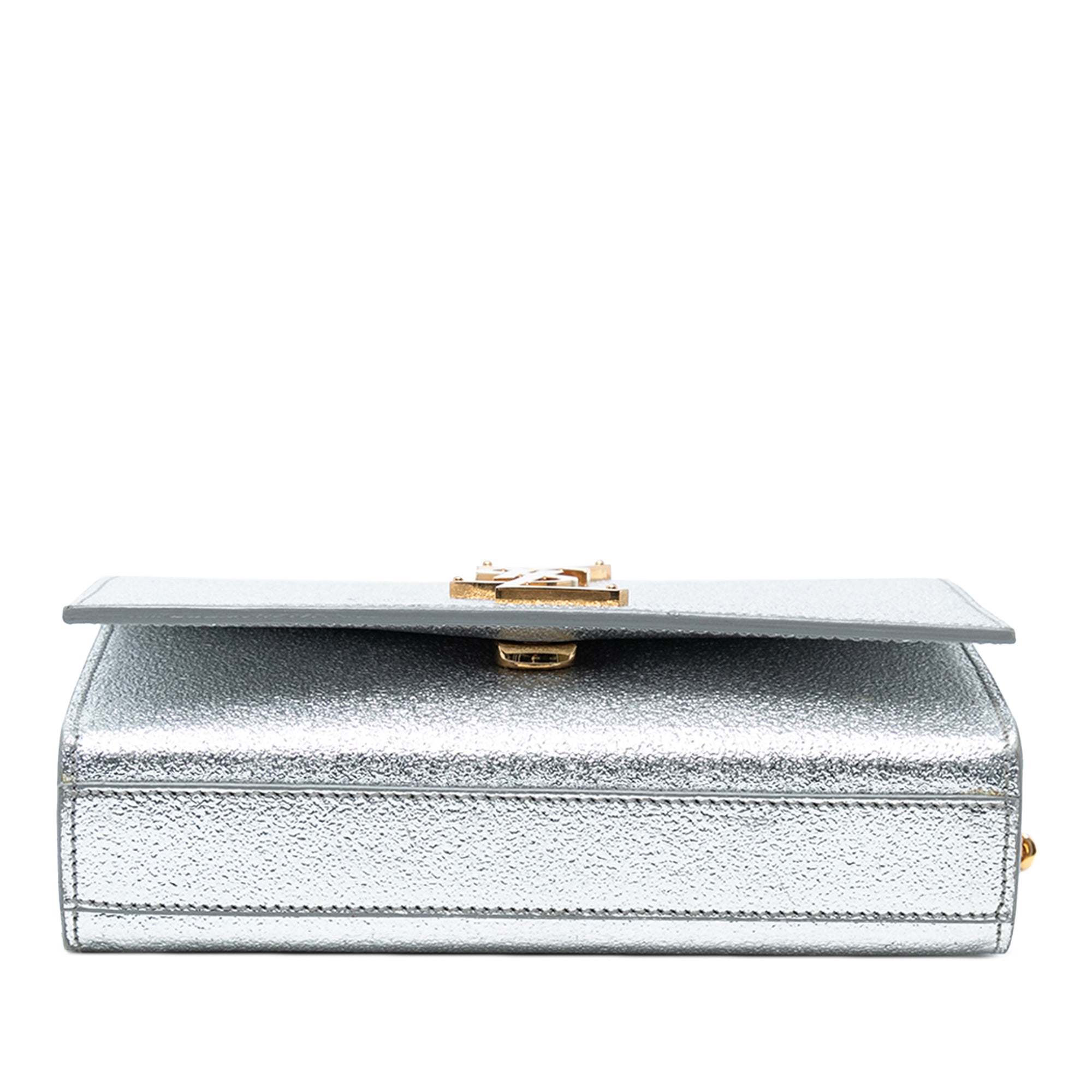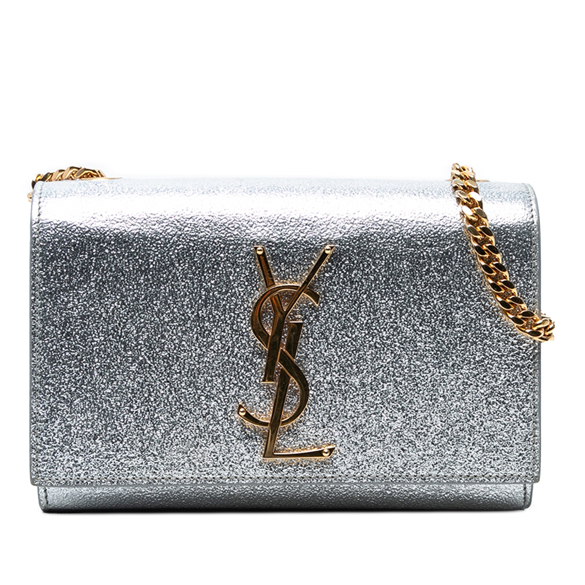 Product Details: Silver Saint Laurent Small Metallic Calfskin Classic Monogram Kate Crossbody. The Kate crossbody bag features a leather body, a gold-tone chain link shoulder strap, a front flap with a metal YSL logo and magnetic closure, and an interior slip pocket. 4.7" L x 6.7" W x 1.6" D.