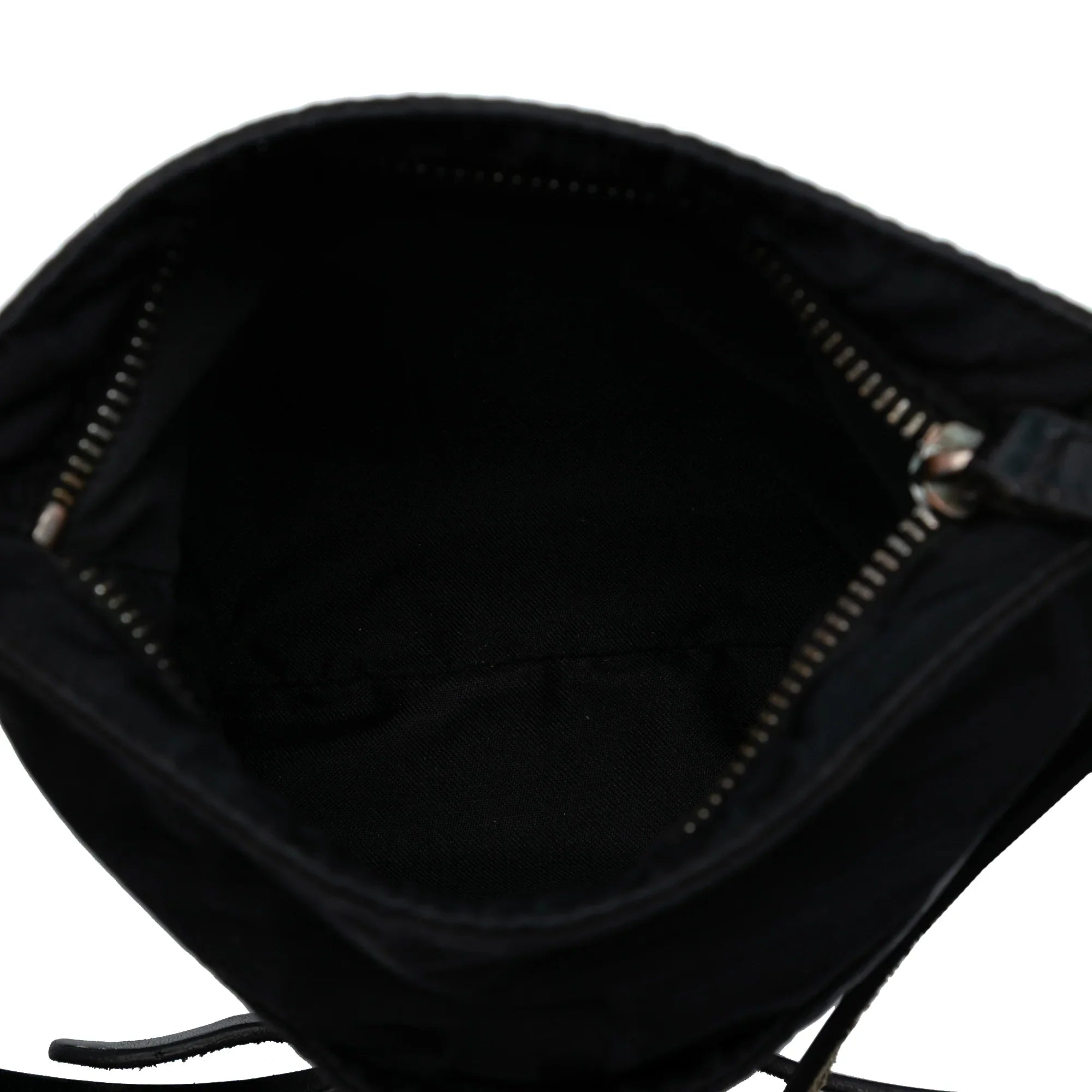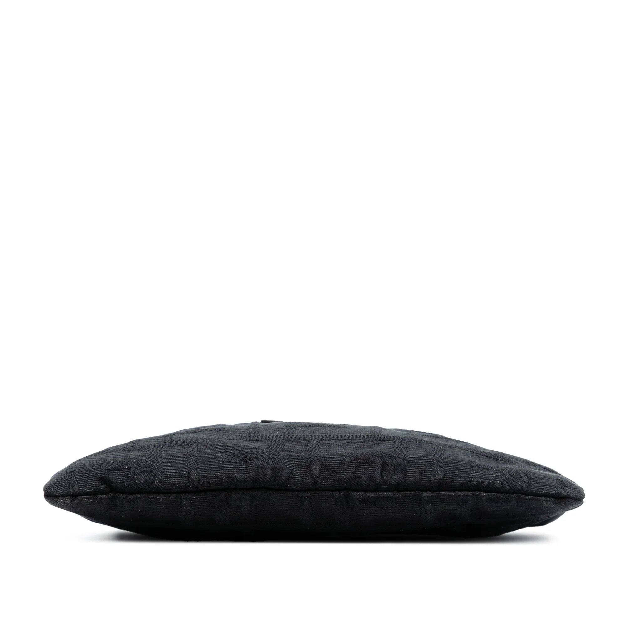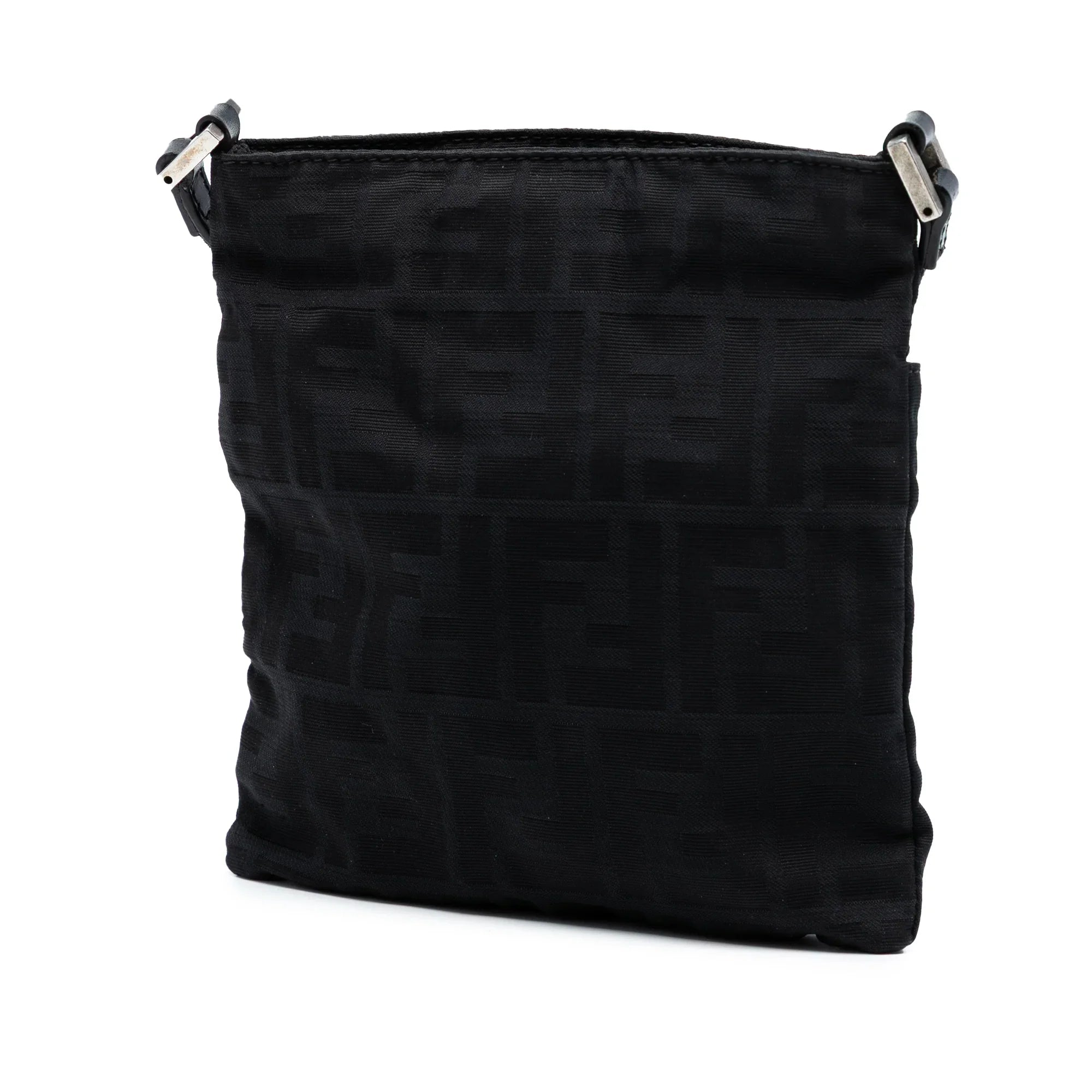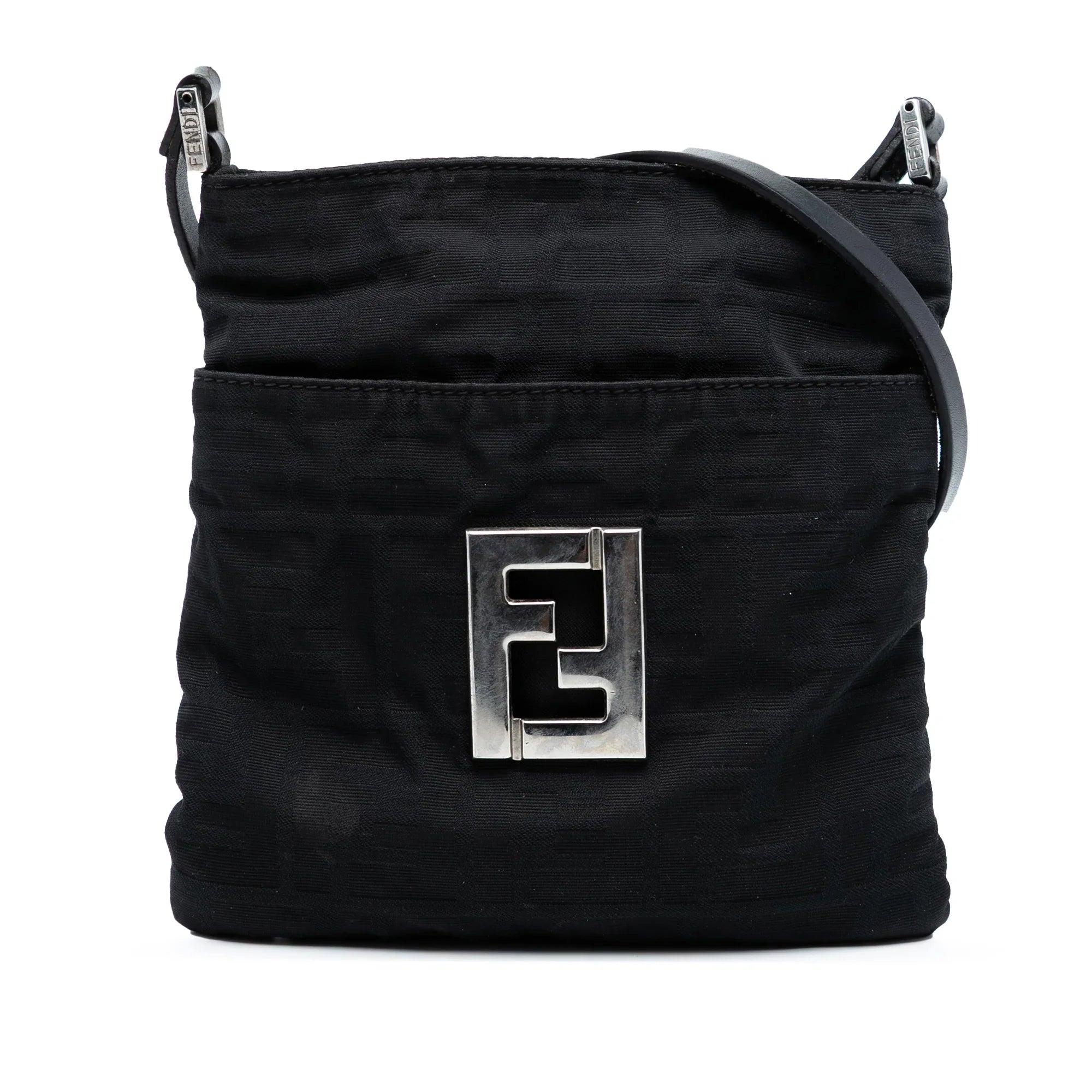 Product Details: Black Fendi Zucca Canvas Crossbody. This crossbody features a canvas body, an adjustable flat shoulder strap, a top zip closure, an exterior front zip pocket, and interior slip pockets. 7.5" L x 7.3" W x 0.2" D.