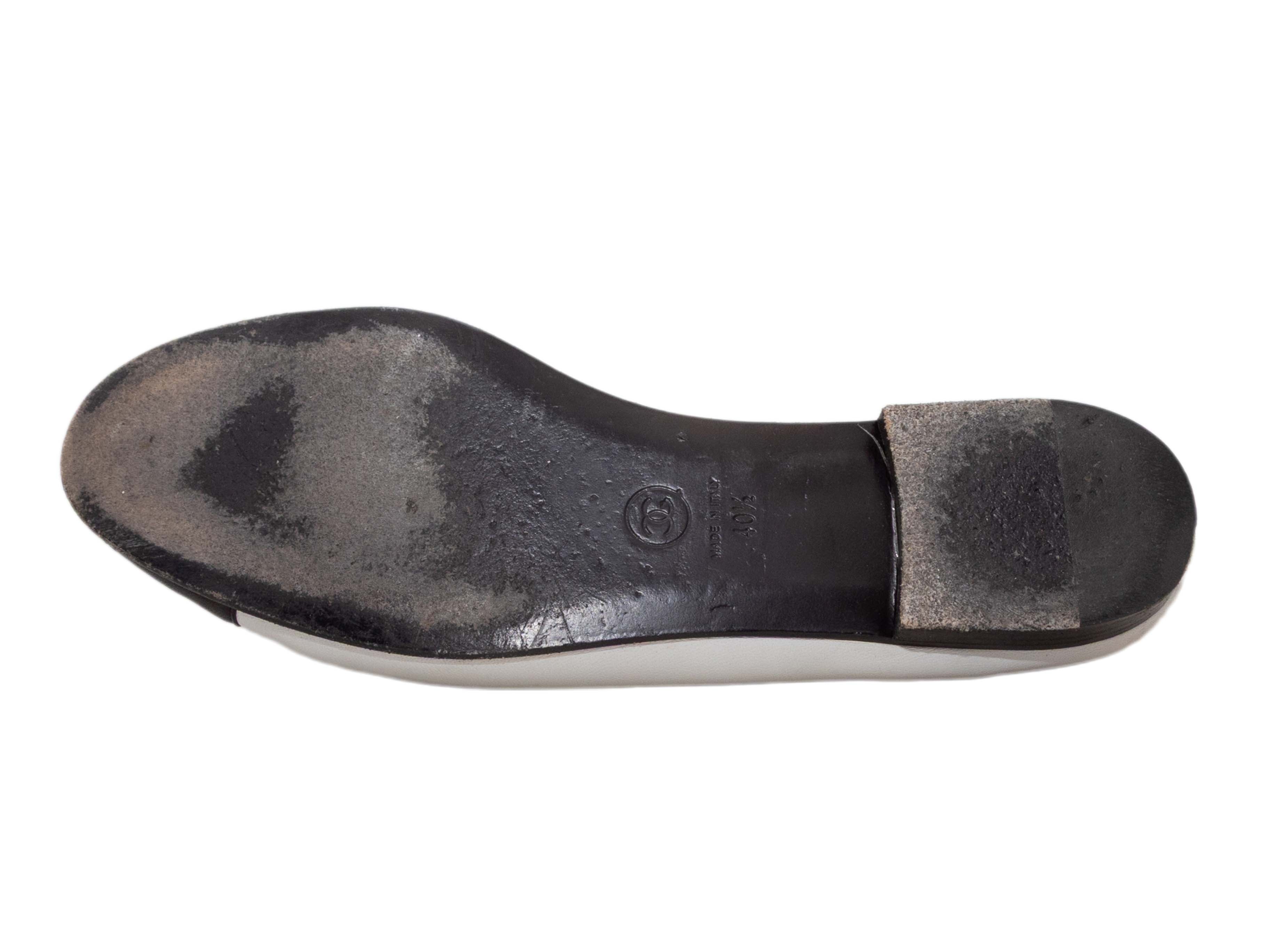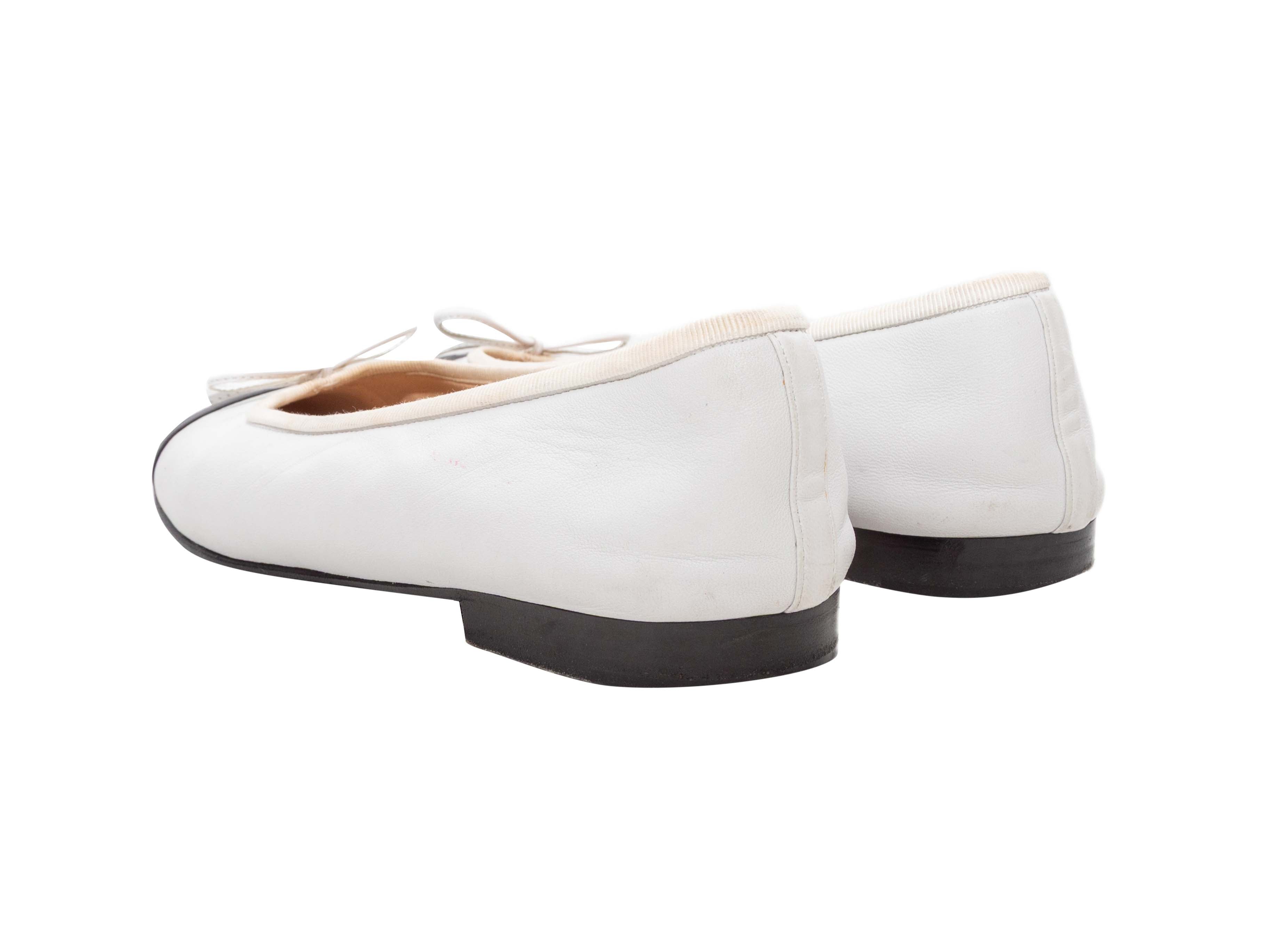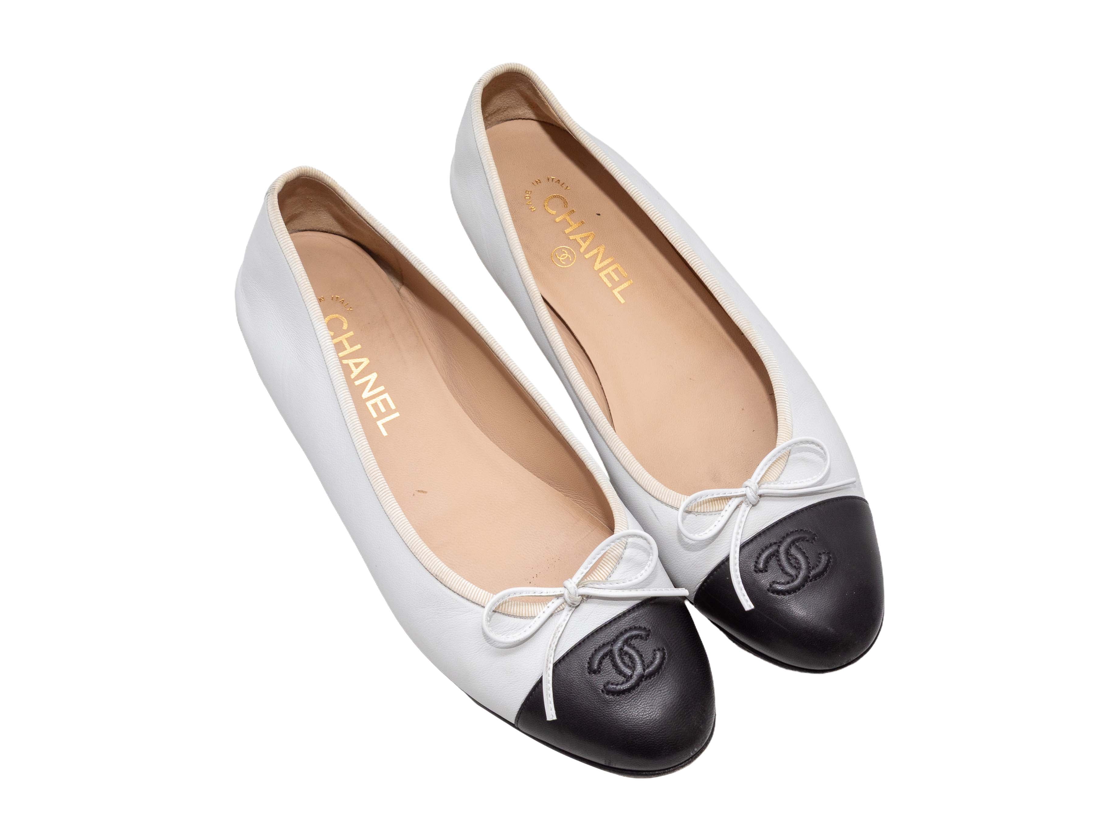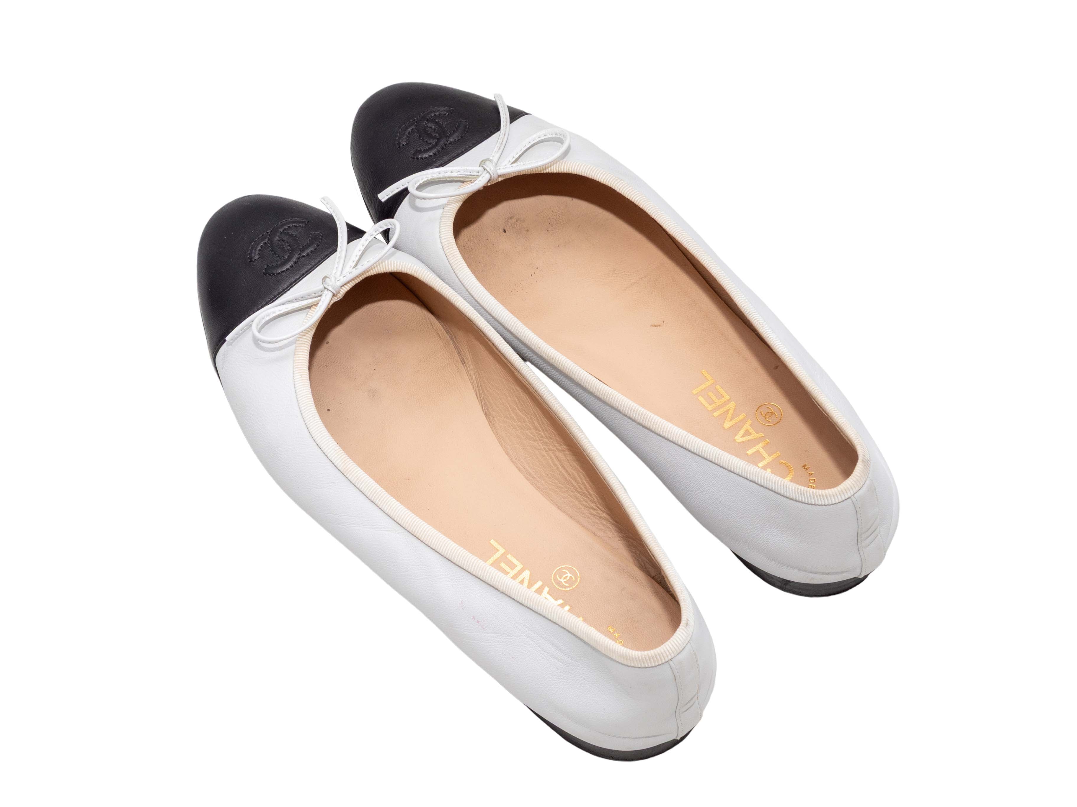 Product Details: White and black leather cap-toe CC ballet flats by Chanel. Grosgrain trim. Bow accents at tops.