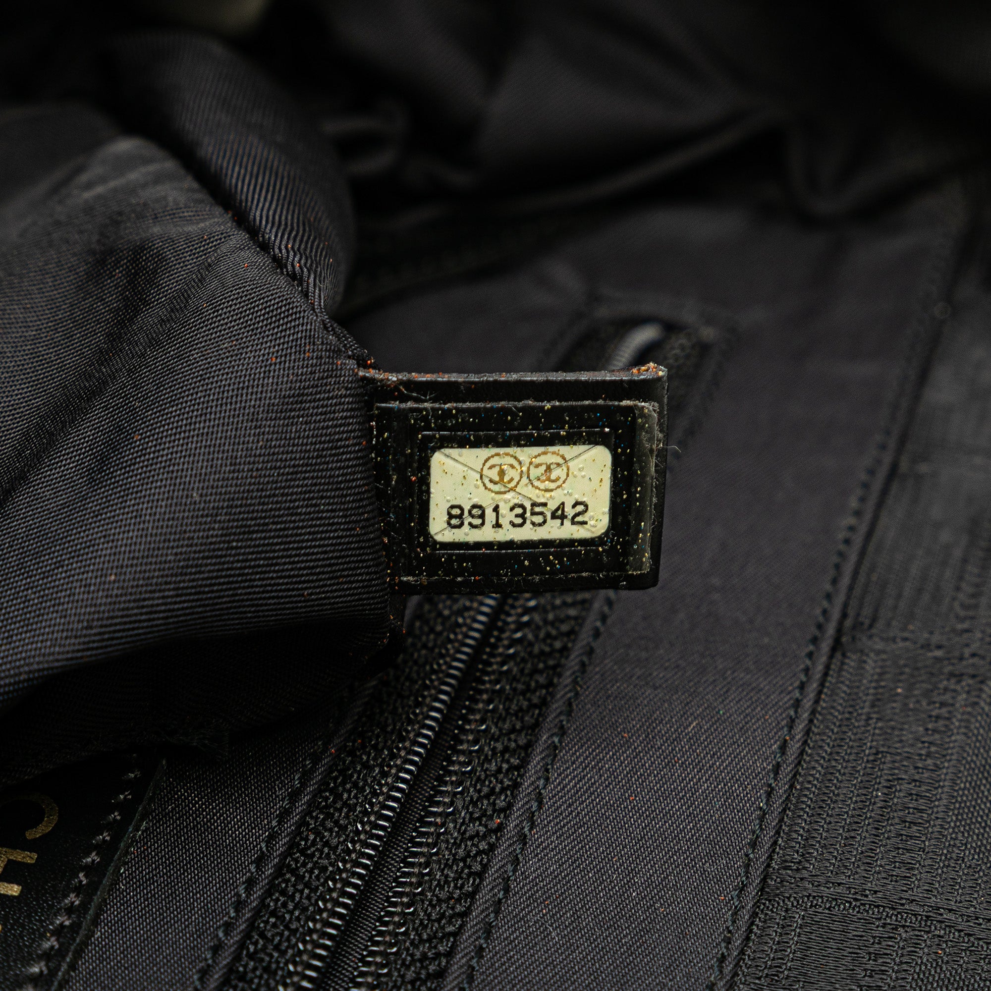 Product Details: Black Chanel New Travel Line Nylon Tote. This tote bag features a nylon body, flat leather straps, an open top, and interior zip pockets. 8.7" L x 10.8" W x 4.7" D, 7.1" drop. Serial number 8913542.