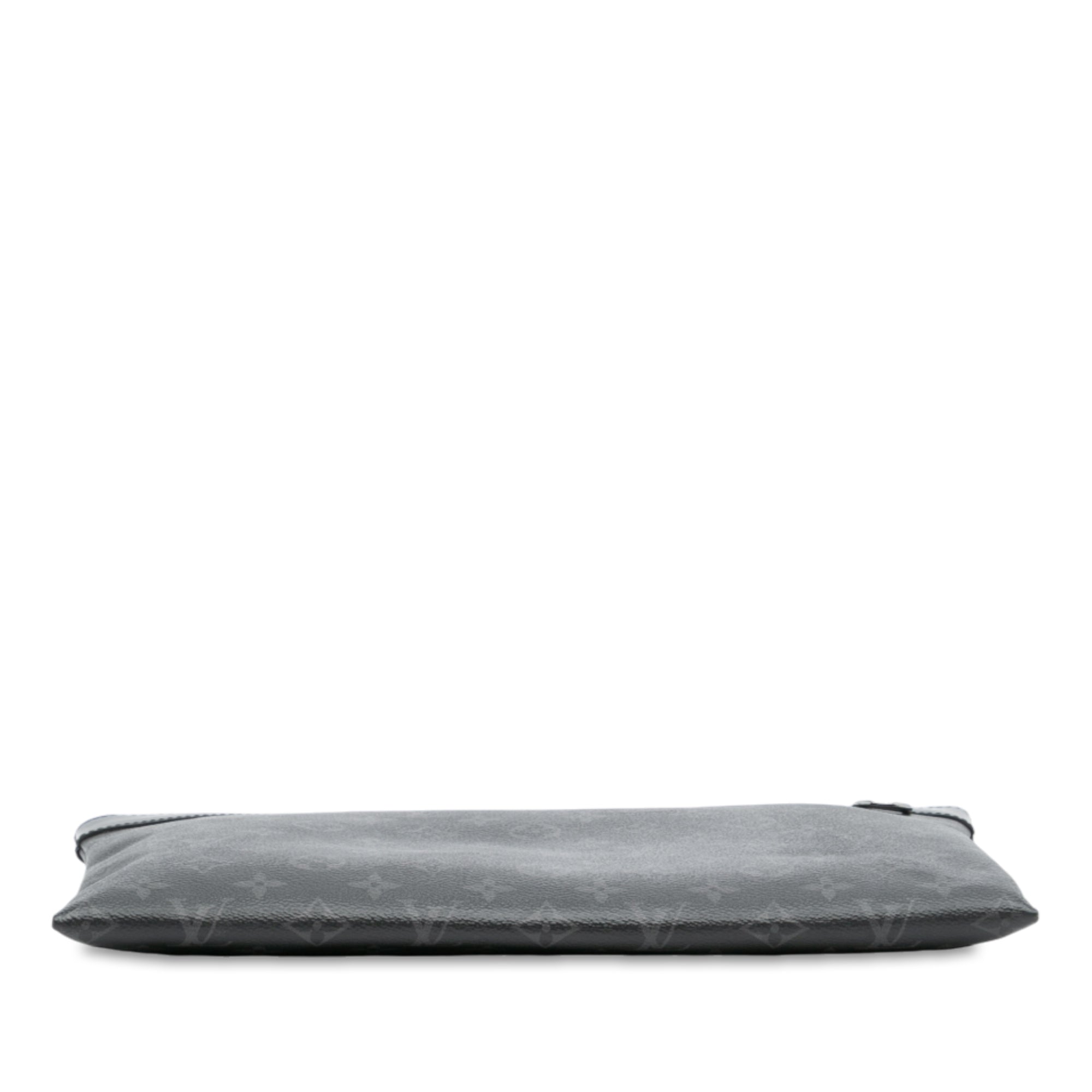 Product Details: Black Louis Vuitton Monogram Eclipse Discovery Pochette GM Clutch Bag. The Discovery Pochette GM features a monogram eclipse canvas body with leather trim, a top zip closure, and an interior slip pocket. 9.3" L x 13" W x 0.4" D. Serial number TN1118.