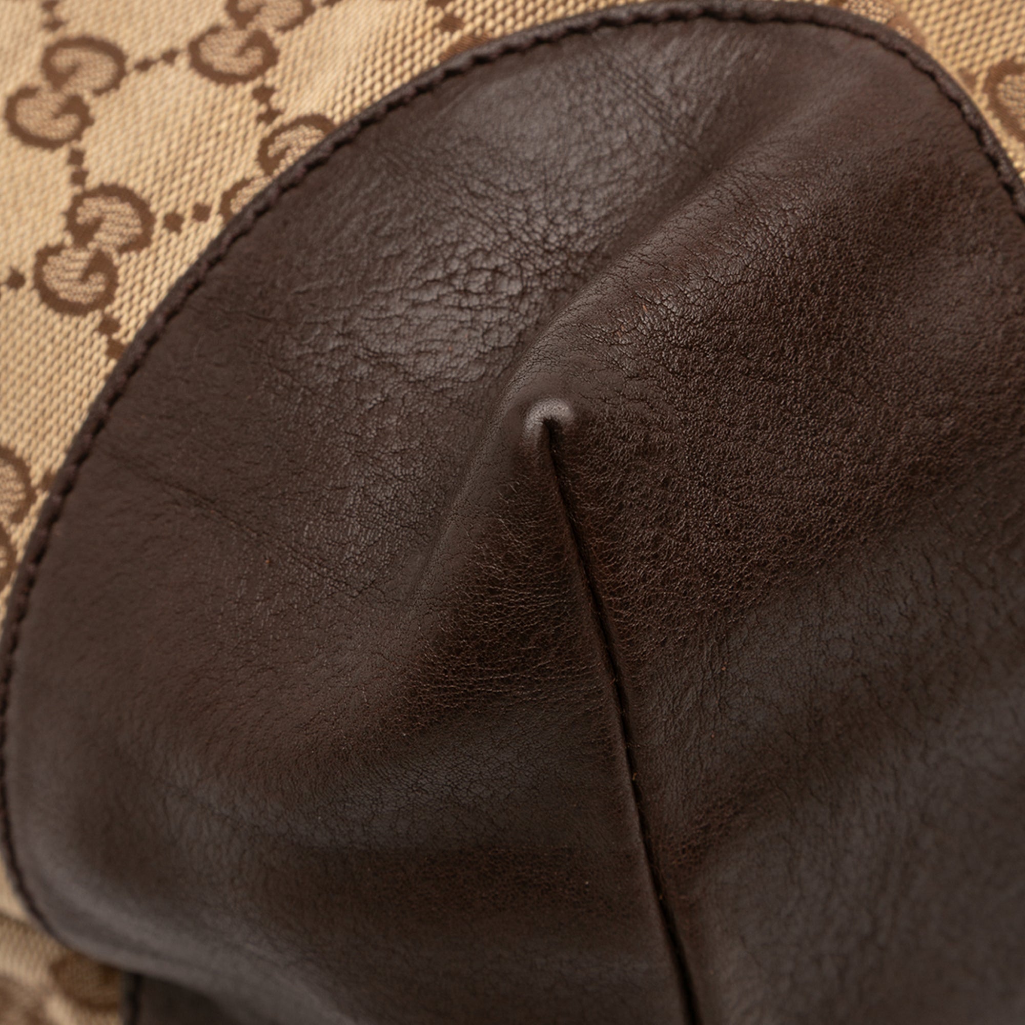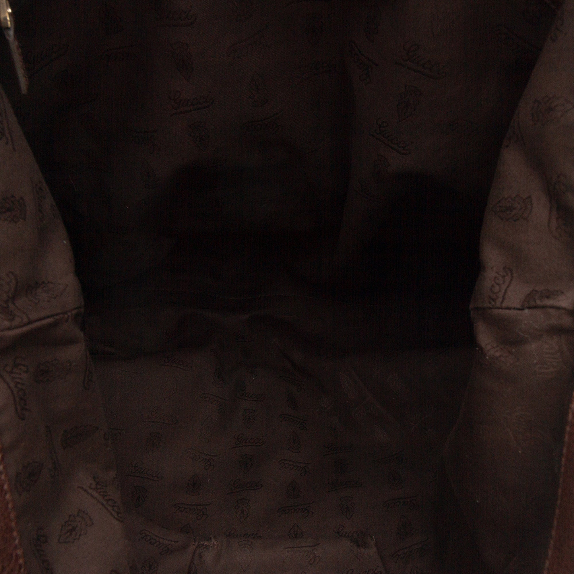 Product Details: Brown Gucci Large GG Canvas GG Charm Tote. This tote bag features a canvas body with leather trim and a GG charm, flat leather top handles, an open top with a magnetic snap closure, and interior zip and slip pockets. 15.4" L x 11.6" W x 6.1" D, 7.3" drop. Serial number 247236 491403.