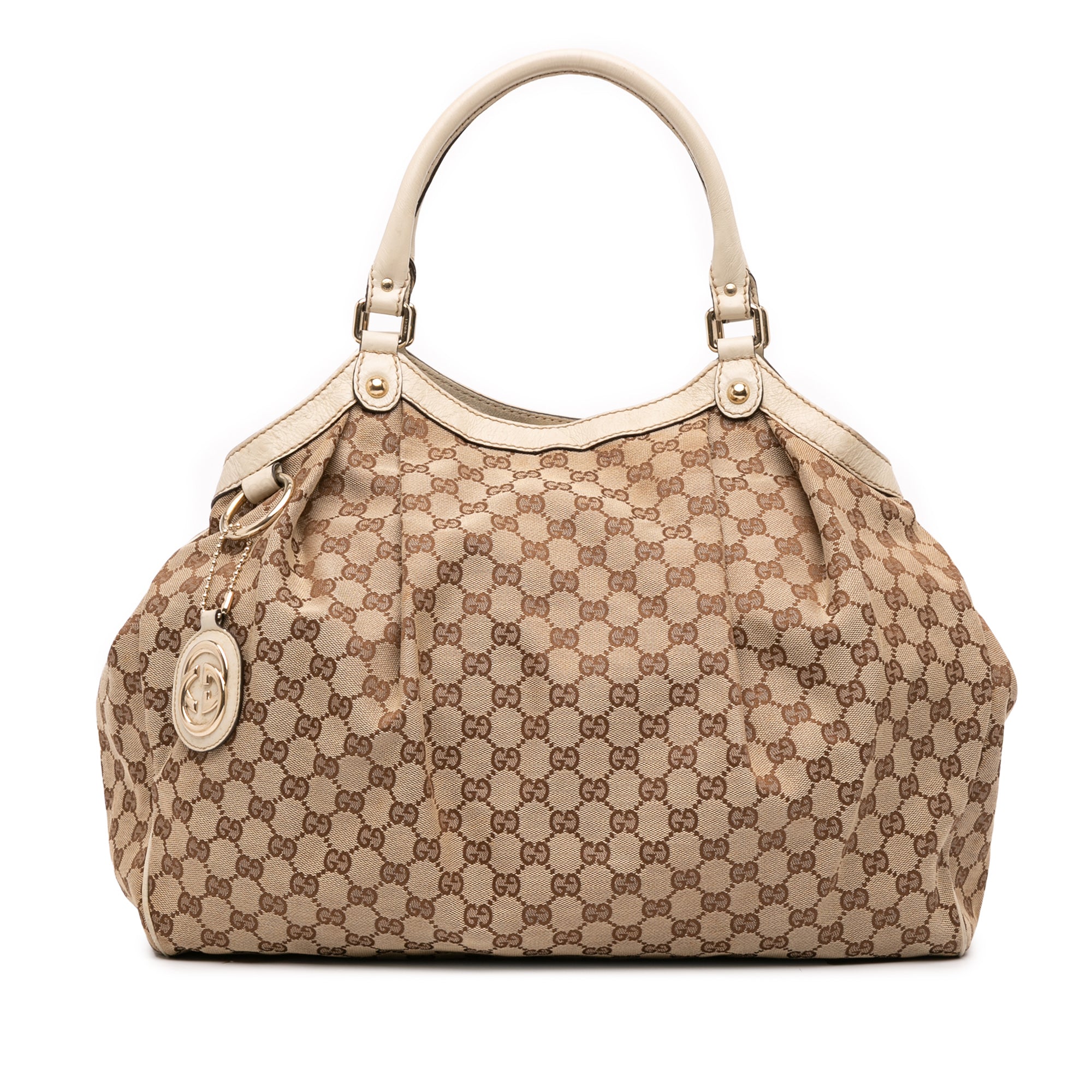 Product Details: Brown Gucci Large GG Canvas Sukey Tote. The Sukey tote bag features a canvas body with leather trim, rolled leather top handles, an open top with magnetic snap closure, and an interior zip pocket. The front has been repainted. 15" L x 15.9" W x 5.3" D, 6.3" drop. Serial number 211943 002058.