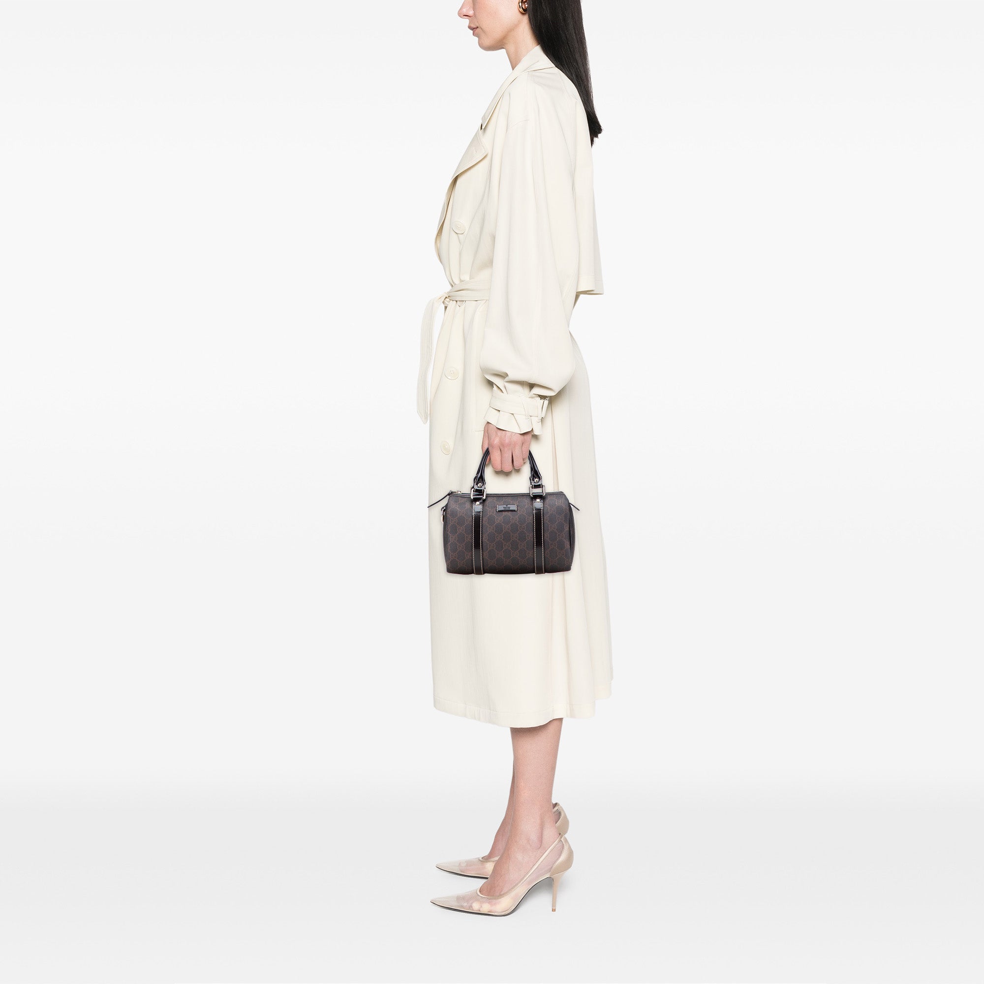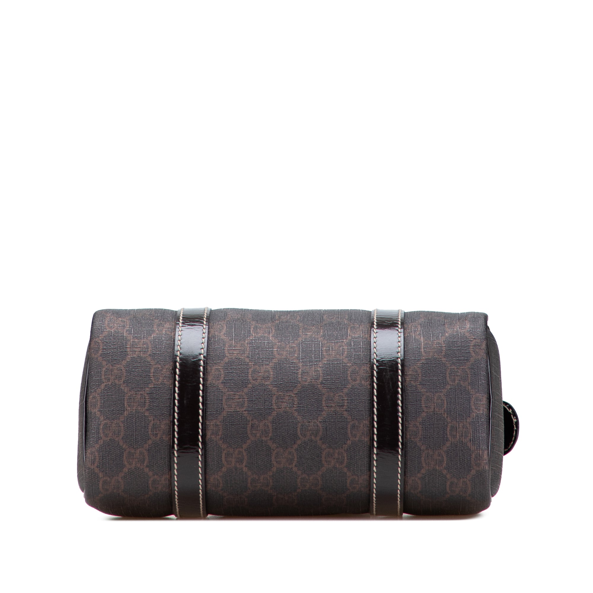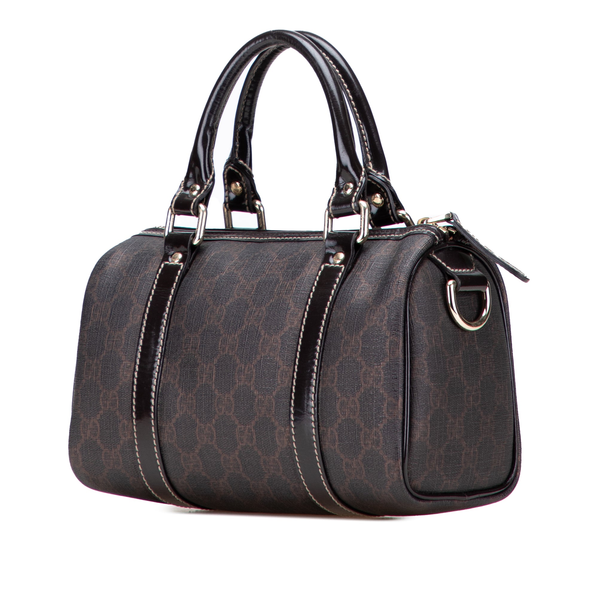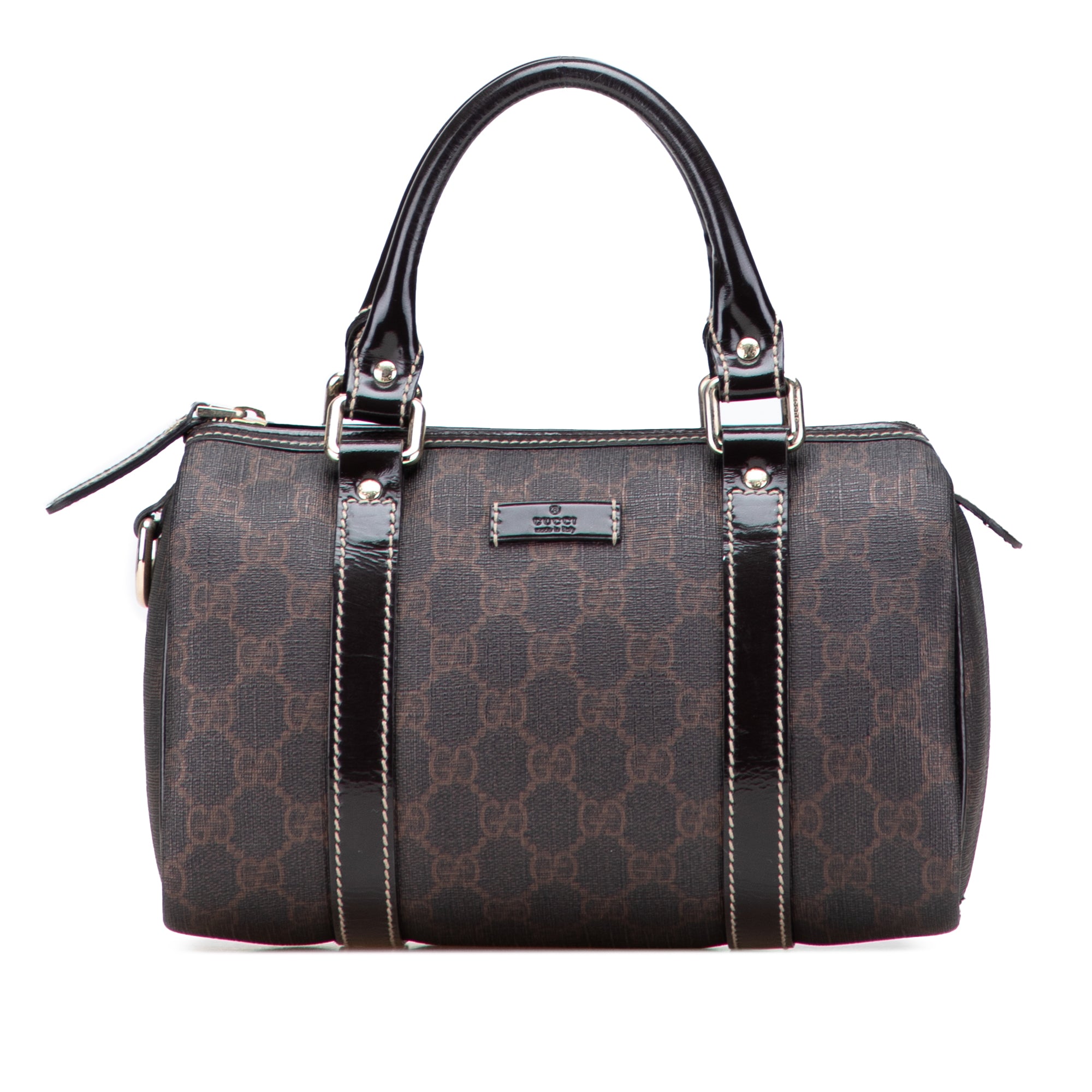 Product Details: Brown Gucci Small GG Supreme Joy Boston. This boston bag features a coated canvas body with leather trim, rolled leather handles, a top zip closure, and an interior slip pocket. 5.5" L x 9.4" W x 4.3" D, 3.9" drop. Serial number 193604 213317.