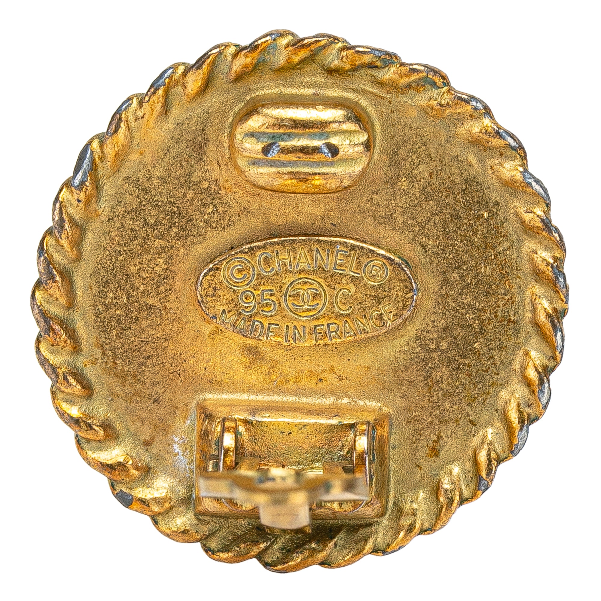 Product Details: Gold Chanel CC Gold Plated Resin Button Clip on Earrings. These earrings features a gold plated metal and resin body and clip on closures. 0.9" L x 0.8" W x 0" D. Serial number 95C.