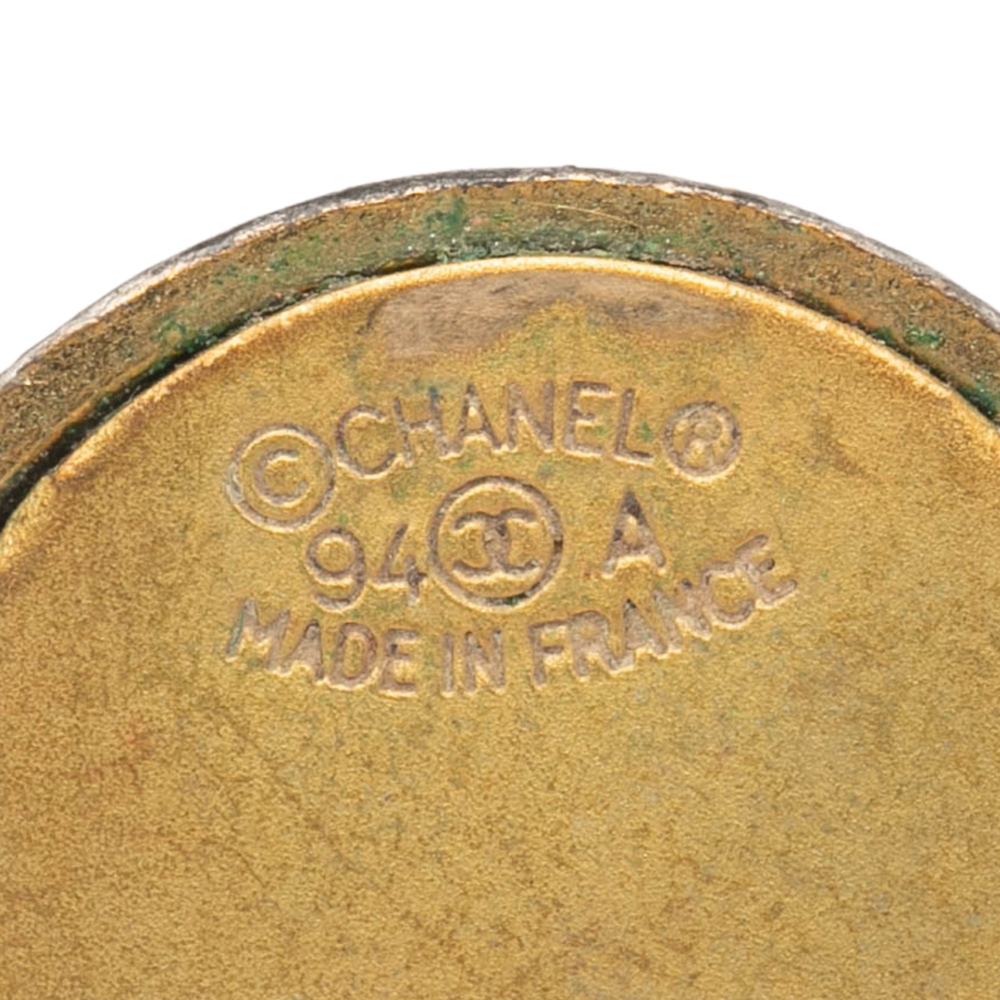 Product Details: Gold Chanel Gold Plated and Acrylic CC Round Clip On Earrings. These earrings feature a gold-tone metal and acrylic body, and clip on closures. 0.8" L x 0.8" W x 0" D. Serial number 94A.
