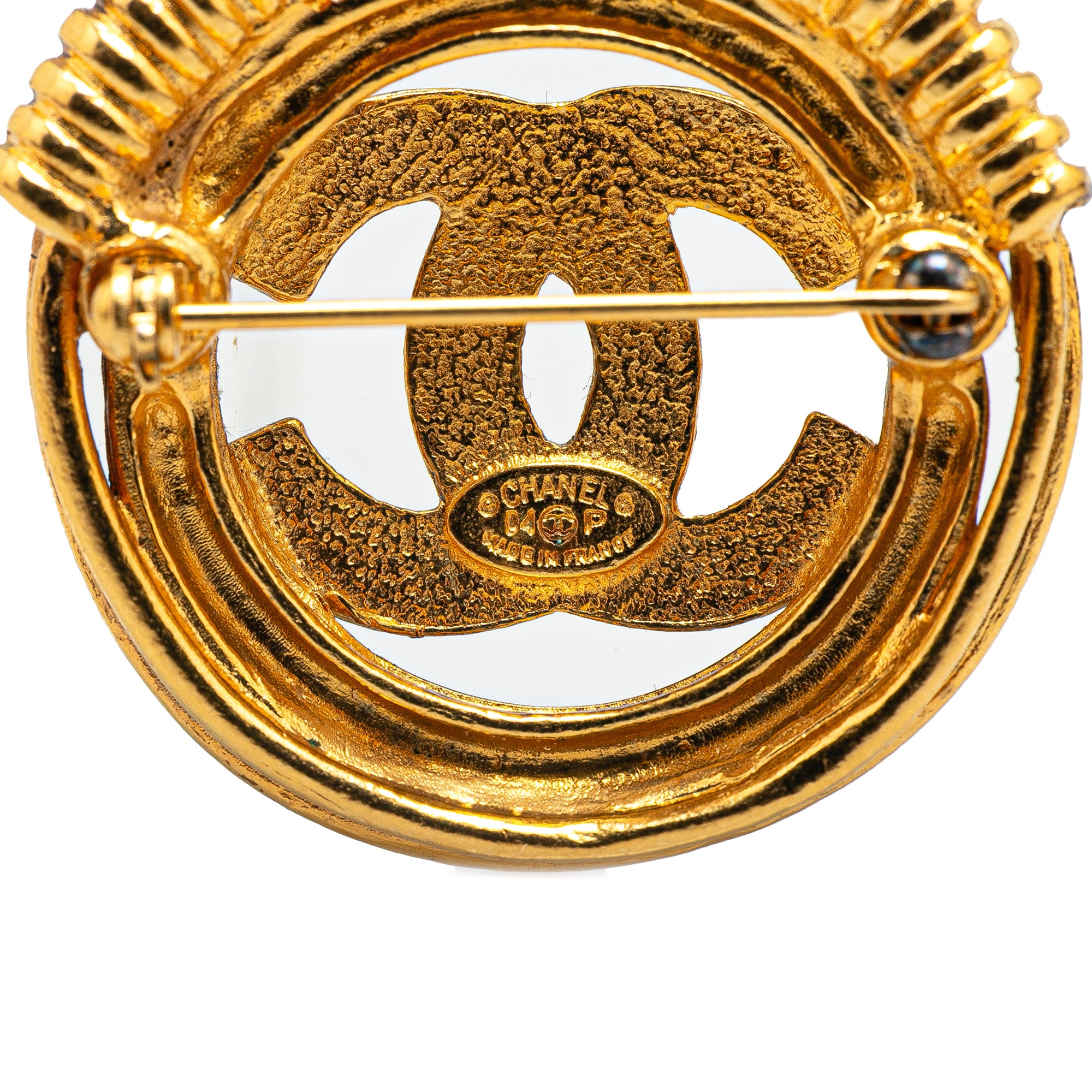 Product Details: Gold Chanel Gold Plated CC Brooch. This brooch features a gold-tone metal body and a back pin closure. 1.4" L x 1.4" W x 0" D. Serial number 94P.