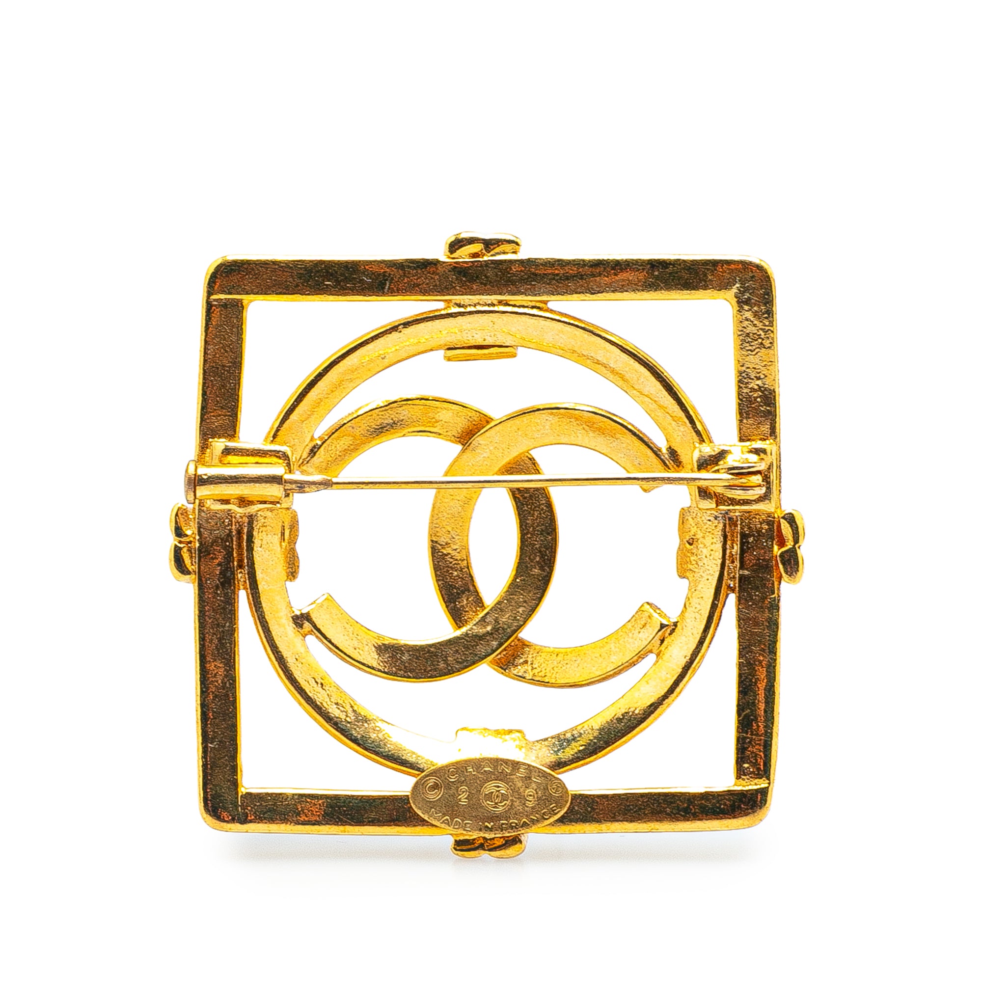 Product Details: Gold Chanel Gold Plated CC Square Lock Brooch. This brooch features a gold-tone metal body and a back pin closure. 1.9" L x 1.9" W x 0" D.
