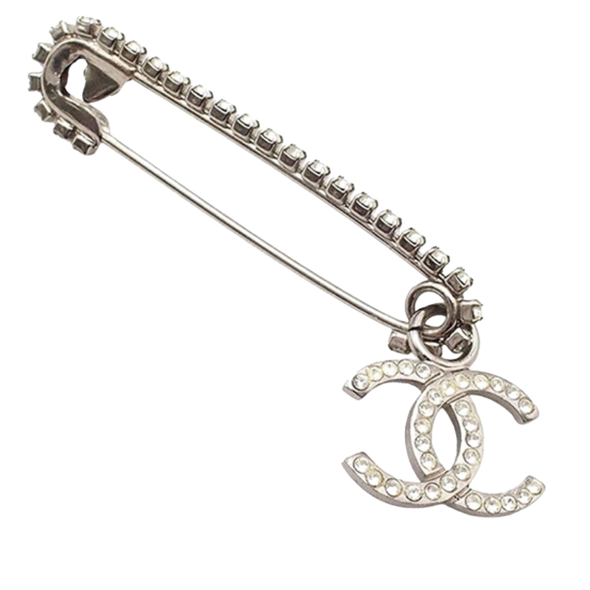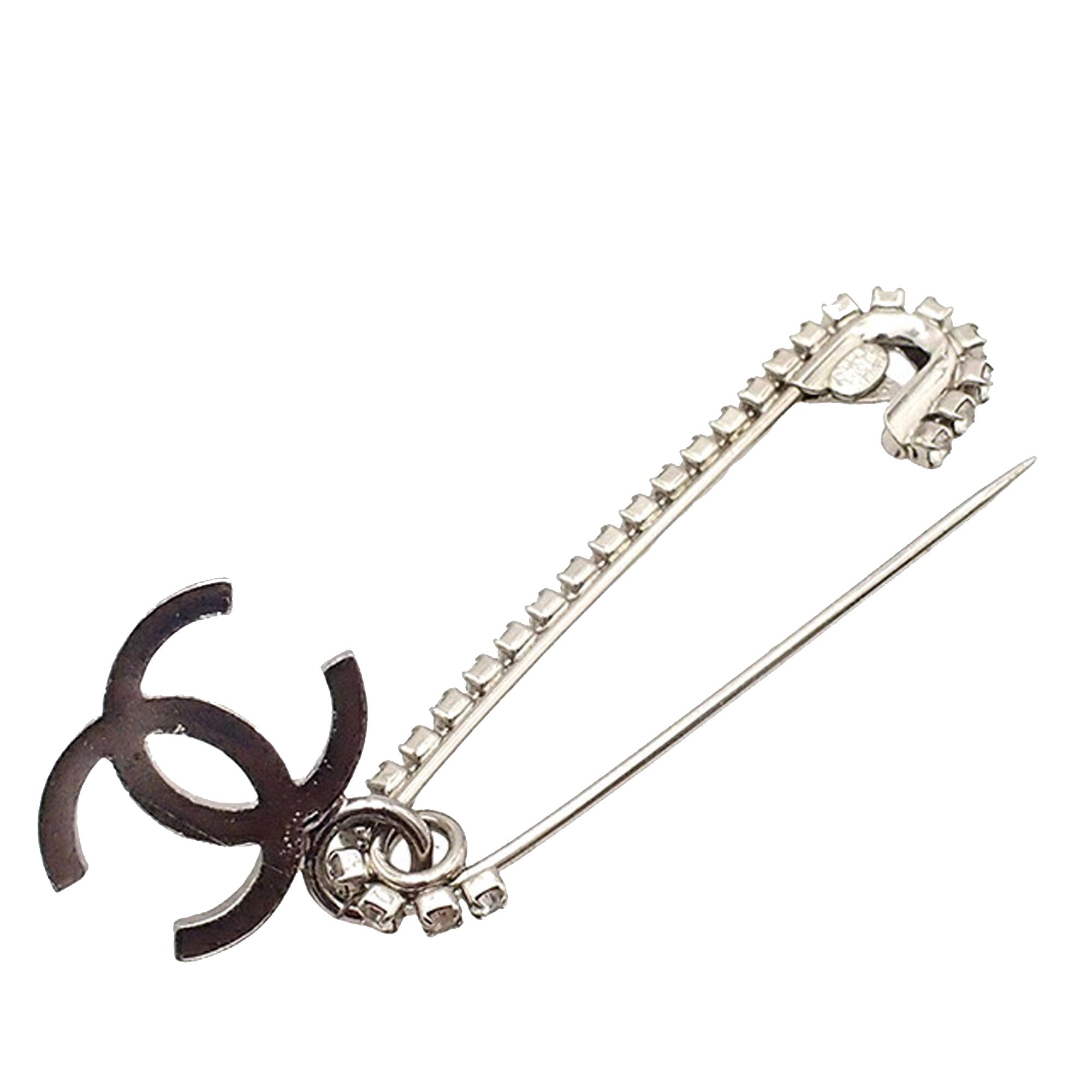 Silver Chanel CC Silver Plated Crystal Embellished Safety Pin Brooch