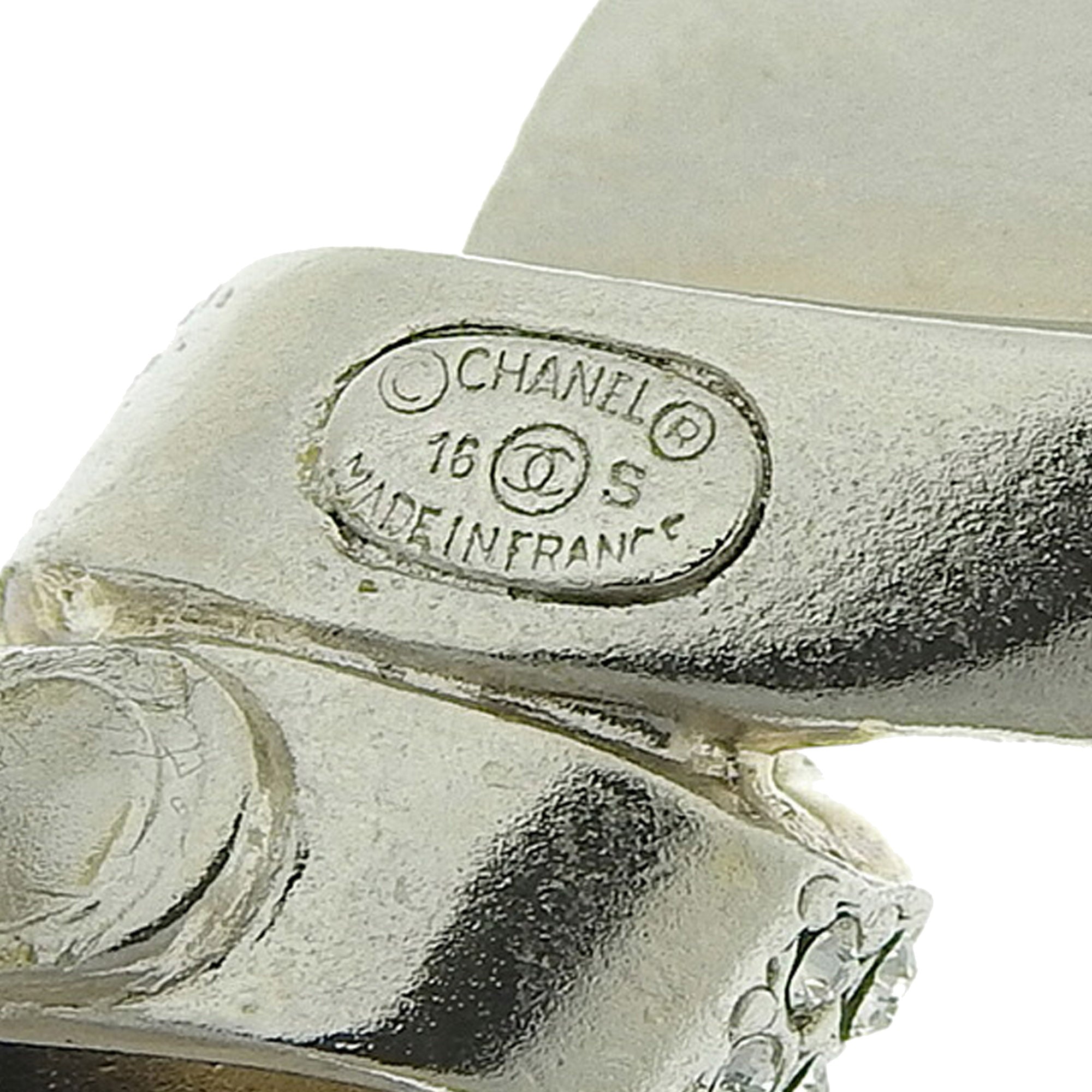 Product Details: Silver Chanel Silver Rhinestones Ribbon Clip on Earrings. These earrings features a silver-plated metal body, rhinestones, and clip-on closures. 1.3" L x 0.5" W x 0" D. Serial number 16S.