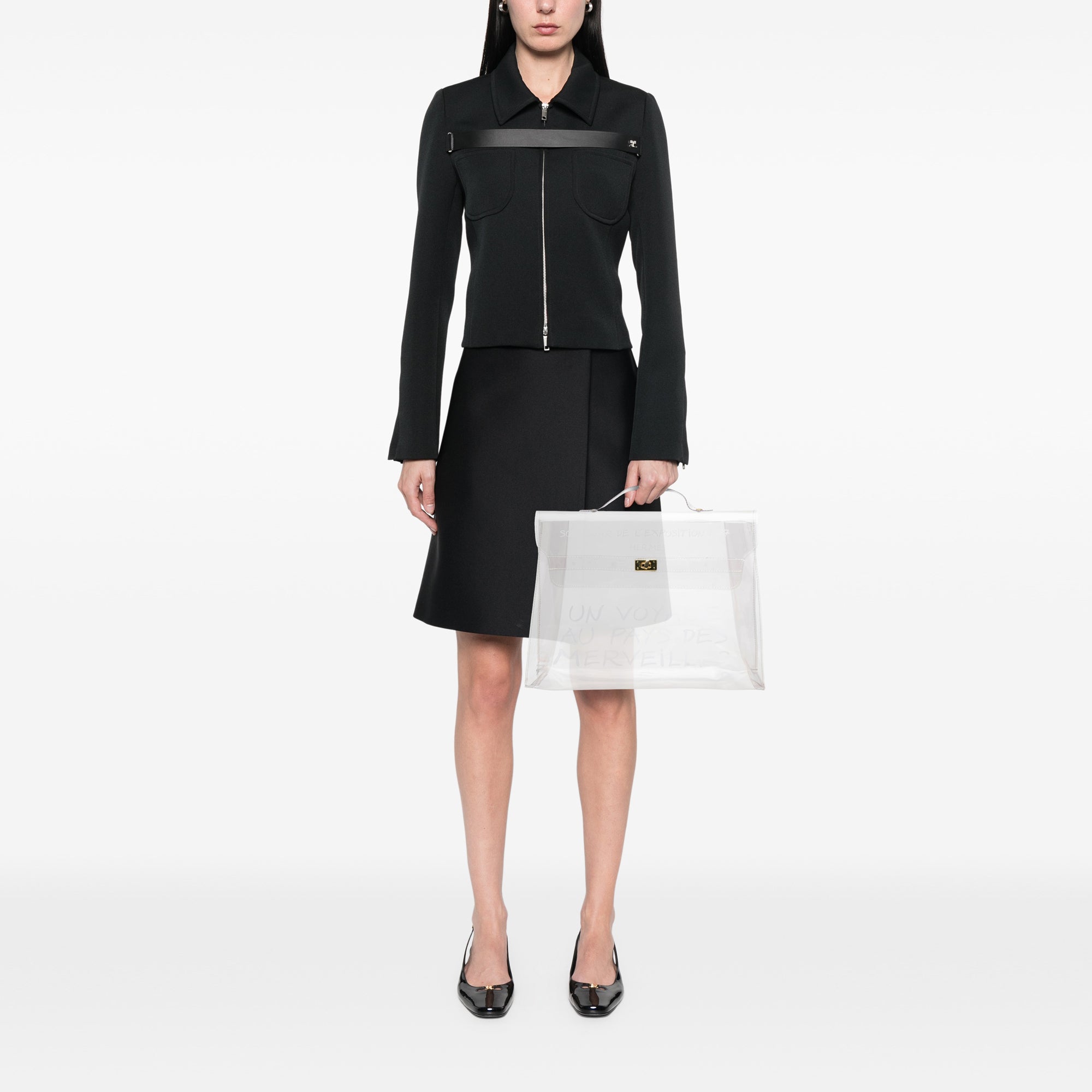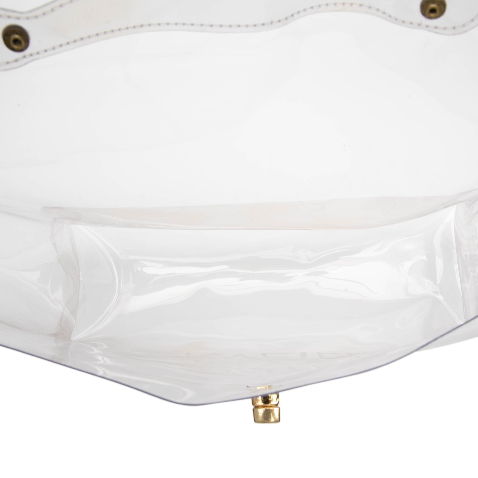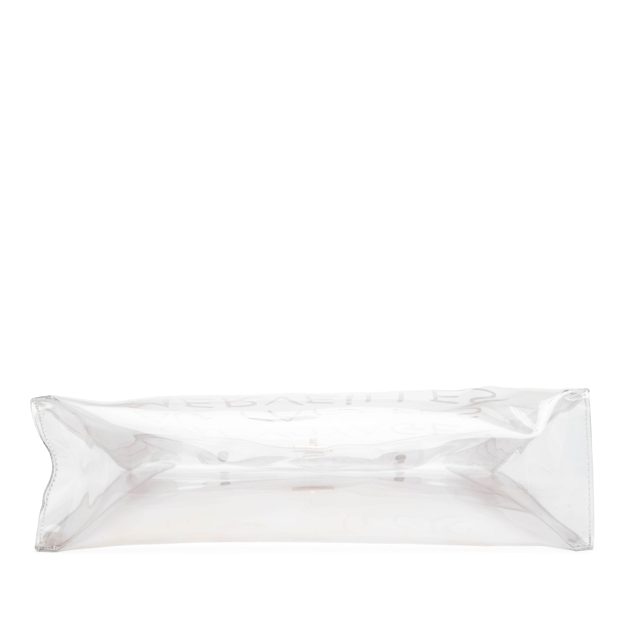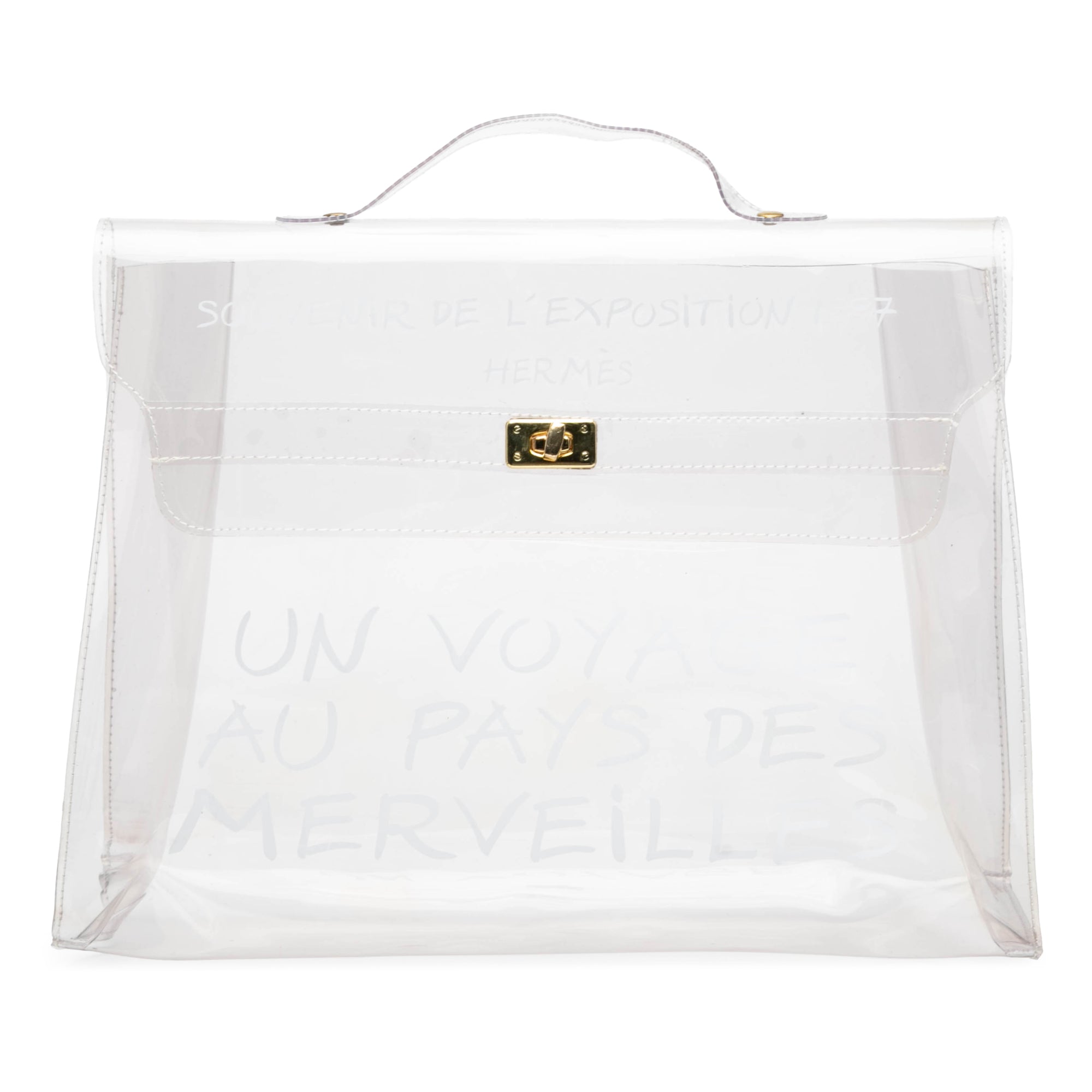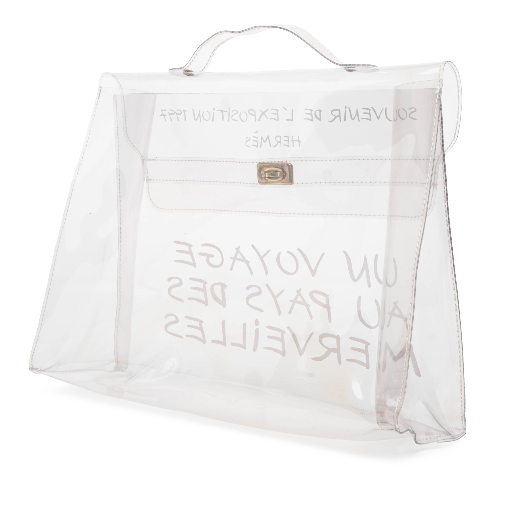 Product Details: White Hermès Vinyl Souvenir De L Exposition Kelly Handbag. The Vinyl Kelly handbag features a see-through vinyl body, a flat top handle, and a front flap with a turn lock closure. 11" L x 15.4" W x 4.7" D, 2" drop.