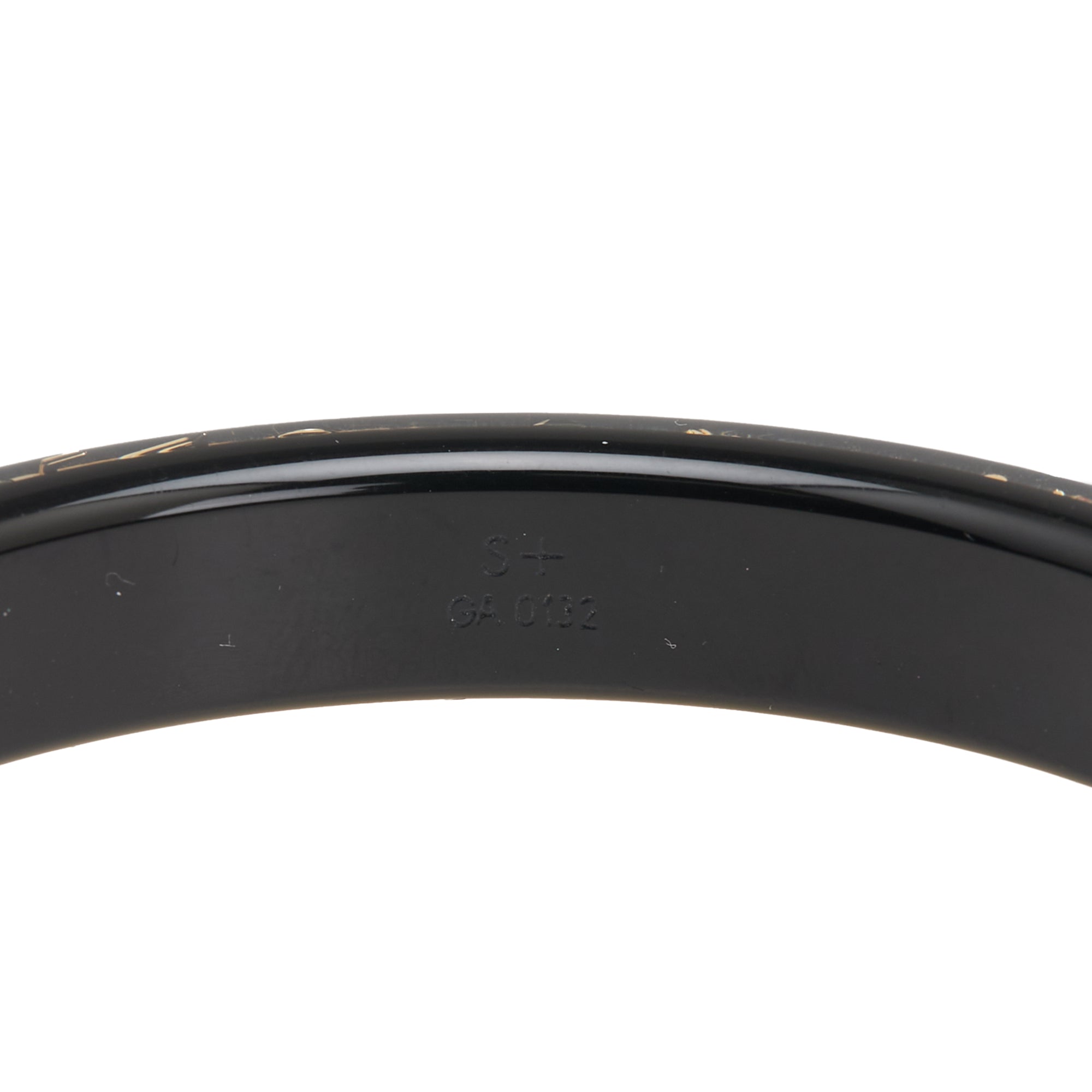 Product Details: Black Louis Vuitton Narrow Monogram Resin Inclusion Bangle Costume Bracelet. This bracelet features a resin band and embedded monogram. 7.1" L x 2.4" W x 0" D. Serial number GA0132.