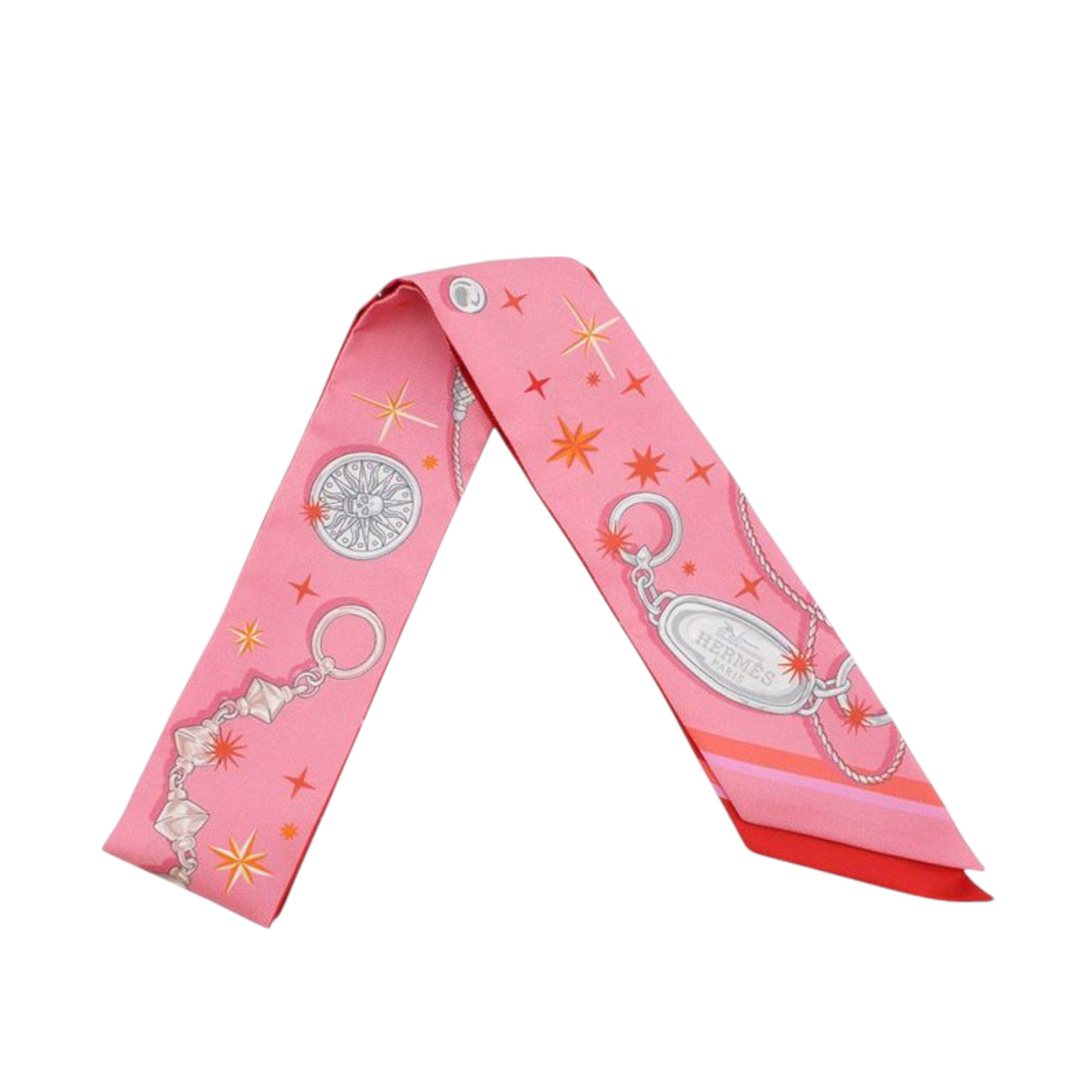 Product Details: Red Hermès C'est La Fete Silk Twilly Scarf Scarves. This twilly scarf features a C'est La Fete print in 100% silk. 33.9" L x 2" W x 0" D.