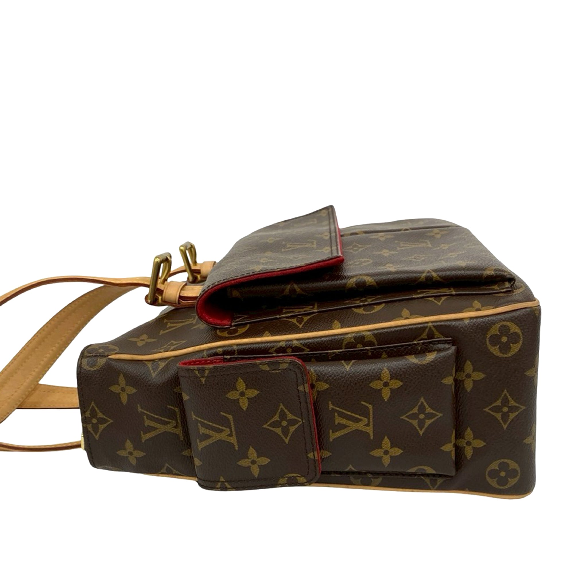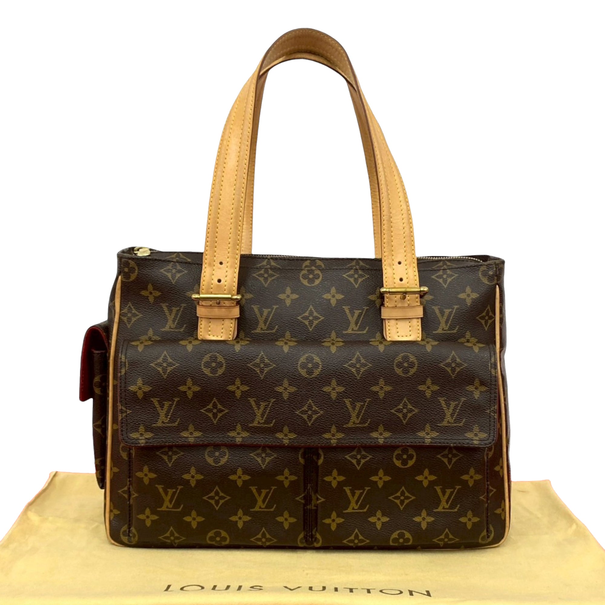 Product Details: Brown Louis Vuitton Monogram Multipli Cite Tote Bag. The Multipli-Cite features a monogram canvas body with vachetta leather trim, flat vachetta leather straps, a top zip closure, exterior flap pockets, and an interior flat pocket. 10.6" L x 15.4" W x 4.7" D, 8.7" drop. Serial number MB1057.