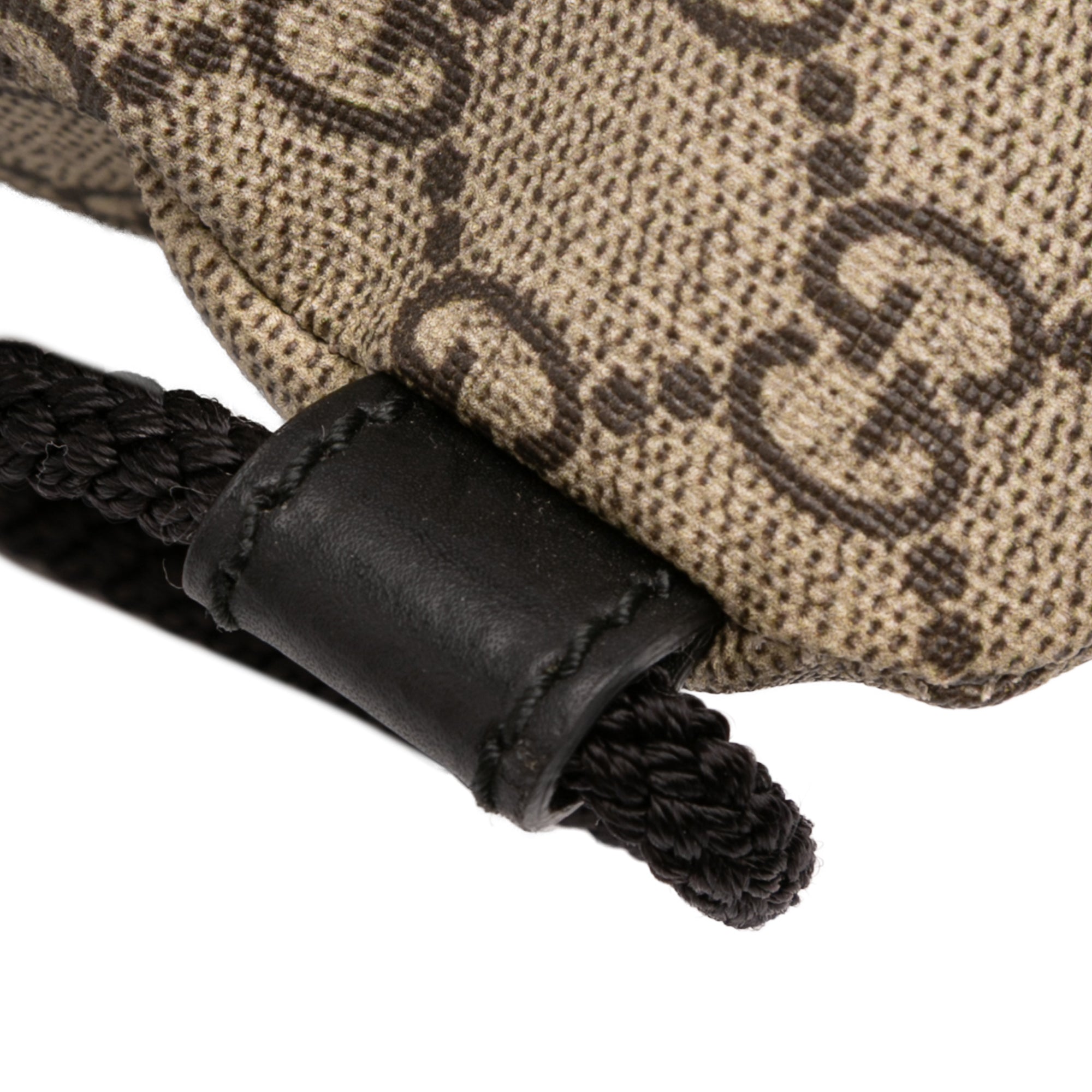 Product Details: Brown Gucci GG Supreme Angry Cat Drawstring Backpack. This backpack features a coated canvas body with leather trim, flat leather top handles, nylon cord straps, a top drawstring closure, and an interior zip pocket. 17.7" L x 14.8" W x 0.2" D, 3.3" drop. Serial number 473872 527066.