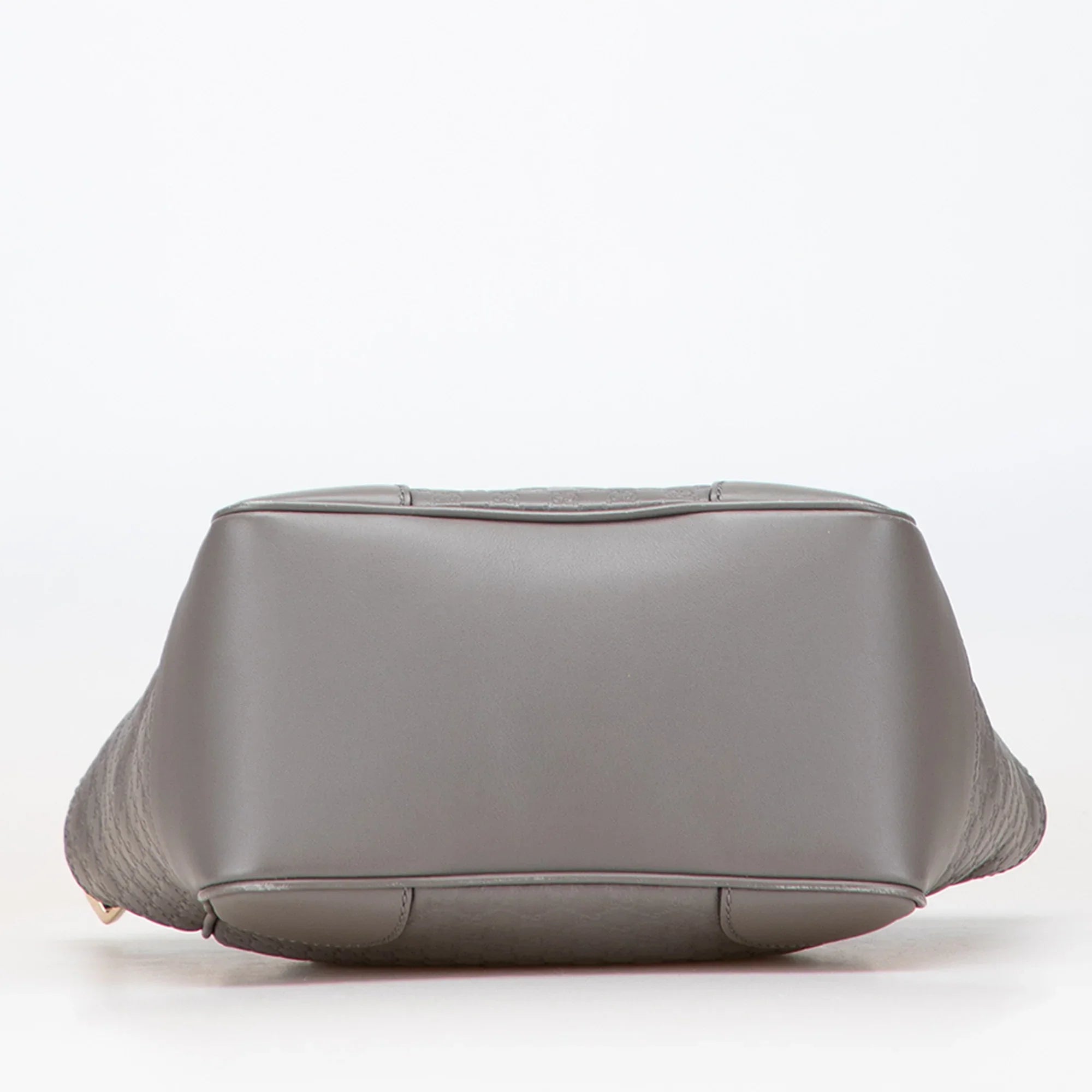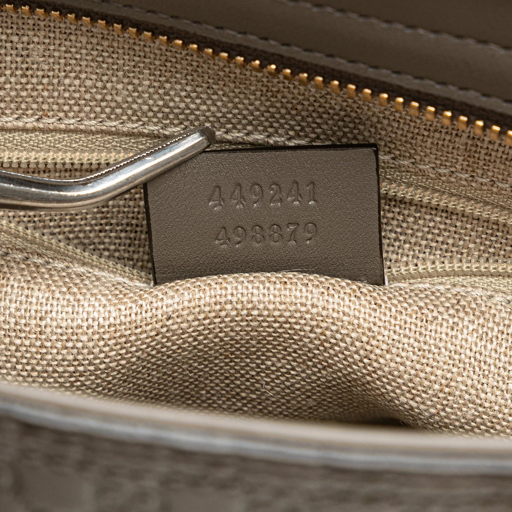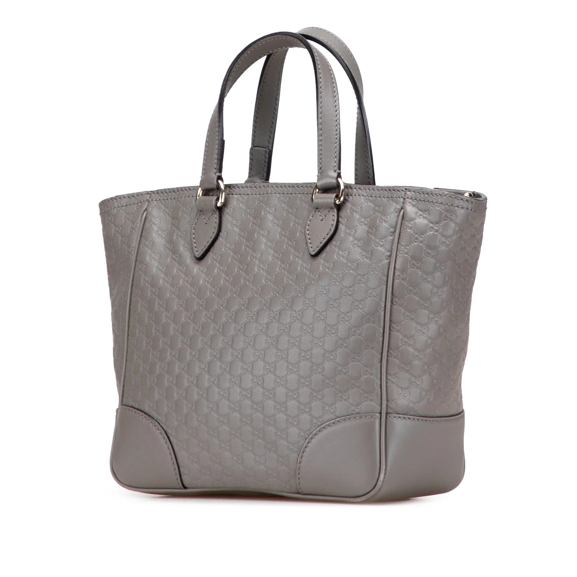 Product Details: Gray Gucci Small Microguccissima Bree Satchel. The Microguccissima Bree features an embossed leather body, flat leather handles, a detachable flat leather strap, a top zip closure, and interior zip and slip pockets. 7.9" L x 7.1" W x 4.1" D, 3.9" drop. Serial number 449241 498879.