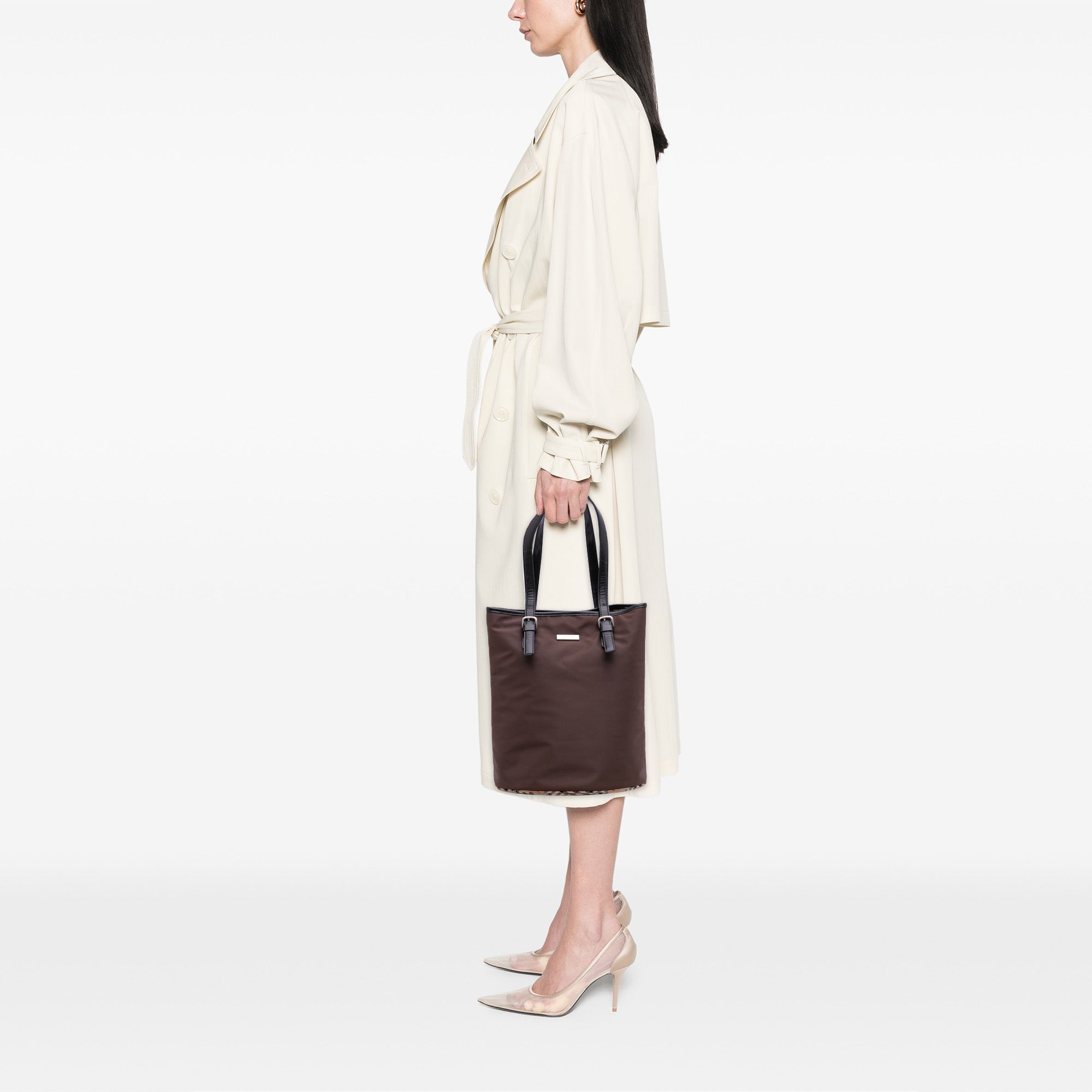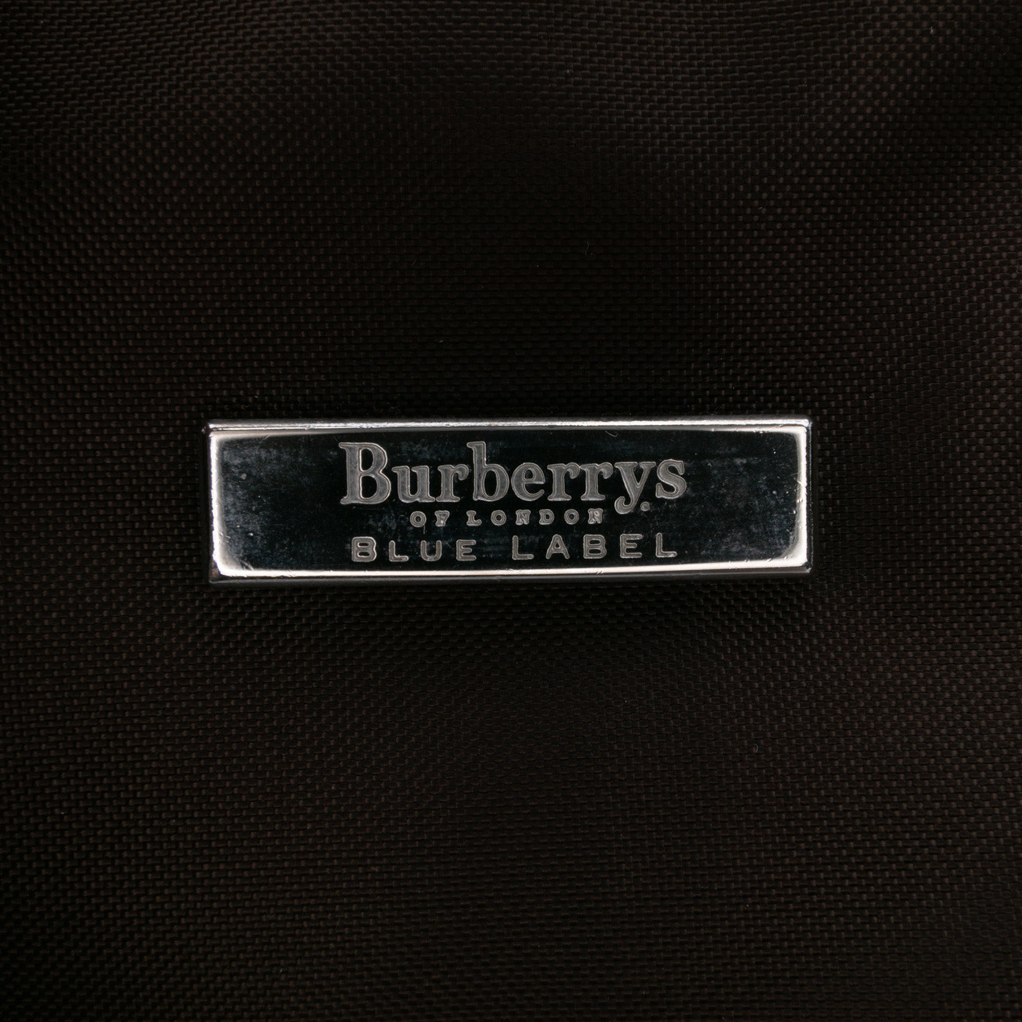 Product Details: Brown Burberry Nova Check Trimmed Nylon Tote. This tote bag features a nylon body with leather trim, flat leather straps, an open top with magnetic snap closure, and an interior zip pocket. 13" L x 10.6" W x 7.9" D.
