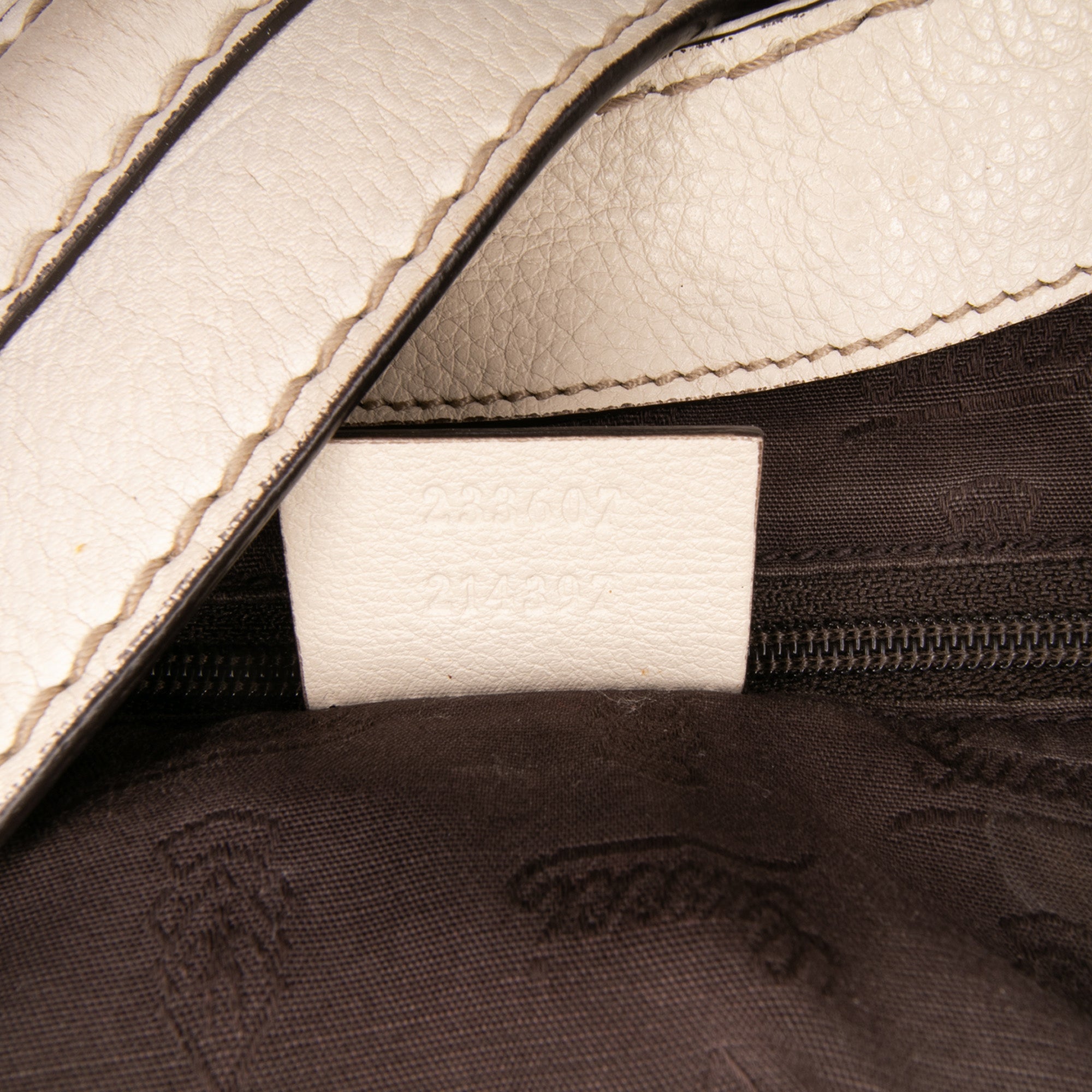 Product Details: White Gucci Guccissima New Ladies Tote. The New Ladies features an embossed leather body, flat leather straps, an open top with a flap tab and magnetic snap closure, and interior zip and slip pockets. 11.2" L x 12.6" W x 5.1" D. Serial number 233607 214397.