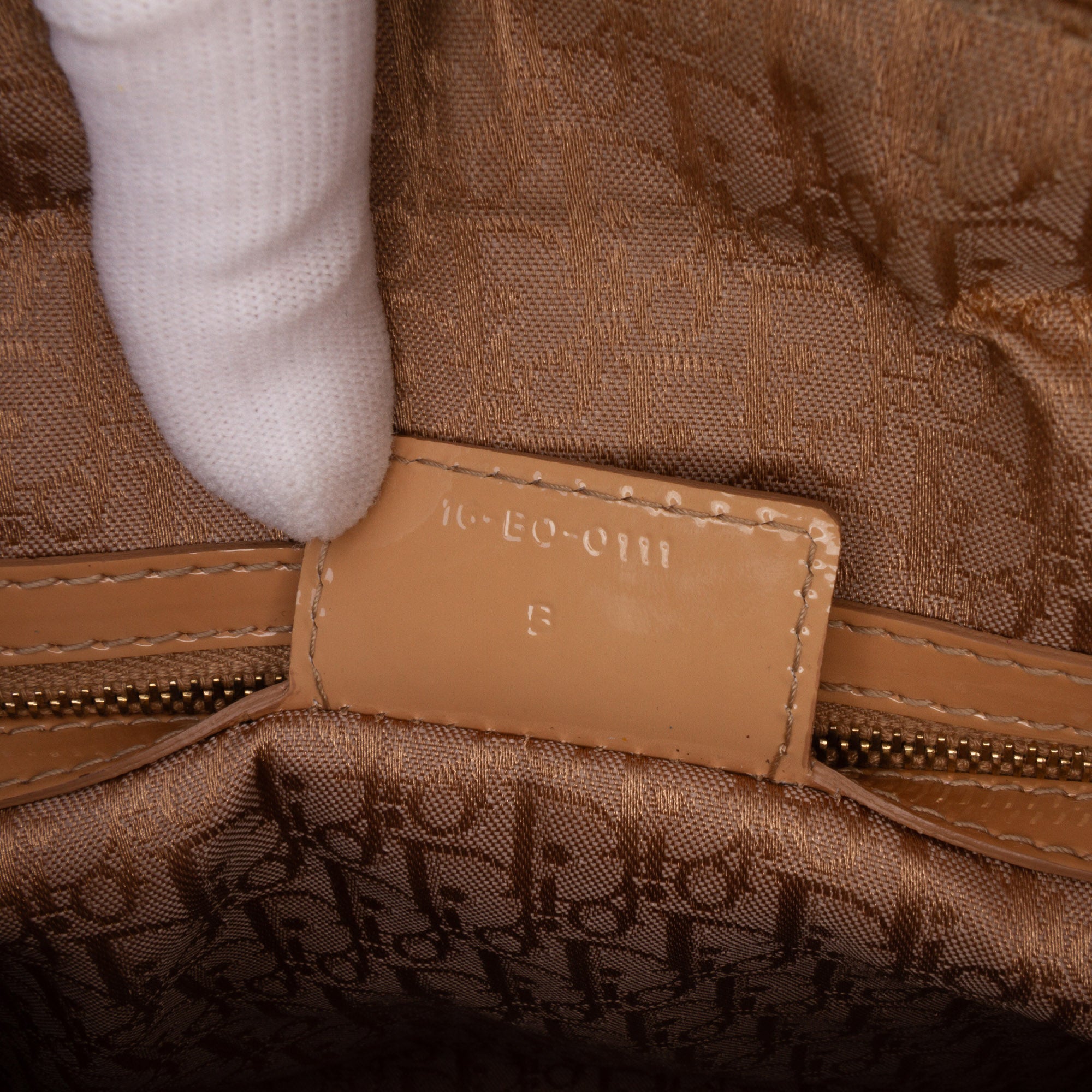 Product Details: Brown Dior Large Patent Cannage Lady Dior Satchel. The Lady Dior features a patent leather body, flat leather handles, a detachable flat leather strap, a top zip closure, and an interior zip pocket. 10.2" L x 12.6" W x 3.5" D, 3.9" drop. Serial number 16-BO-0111 B.