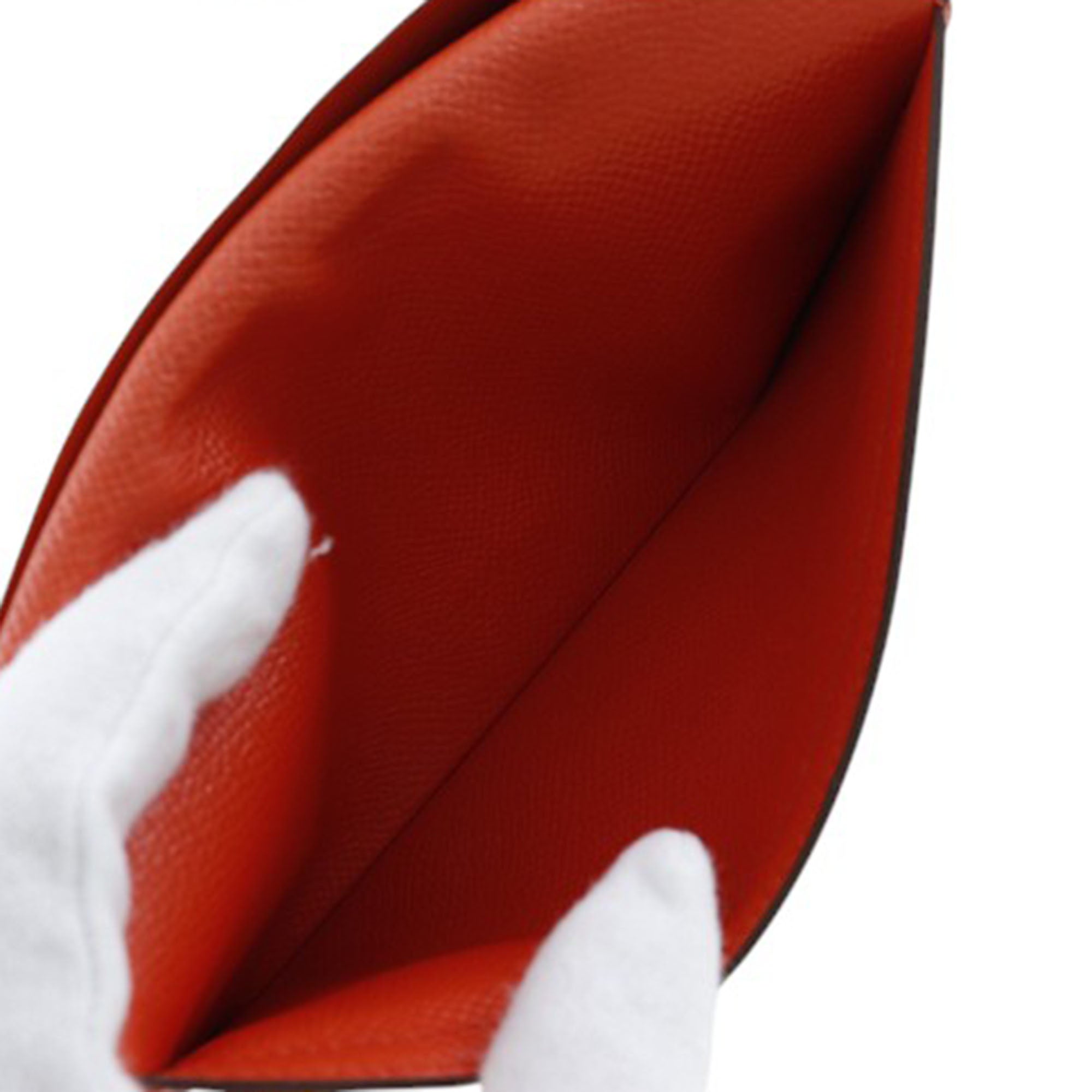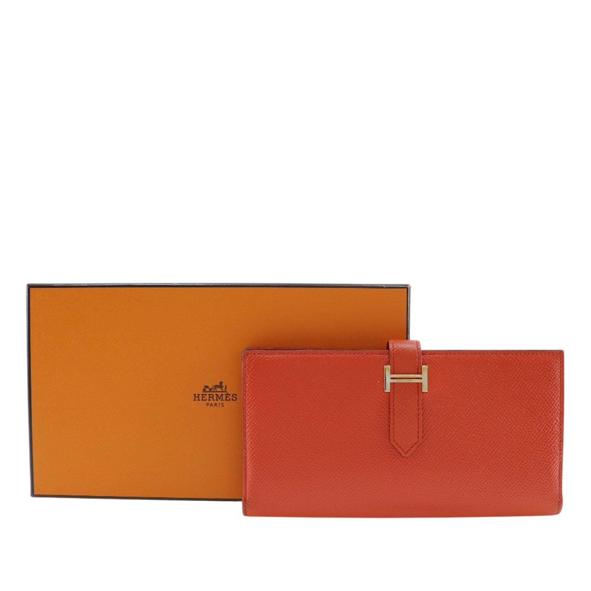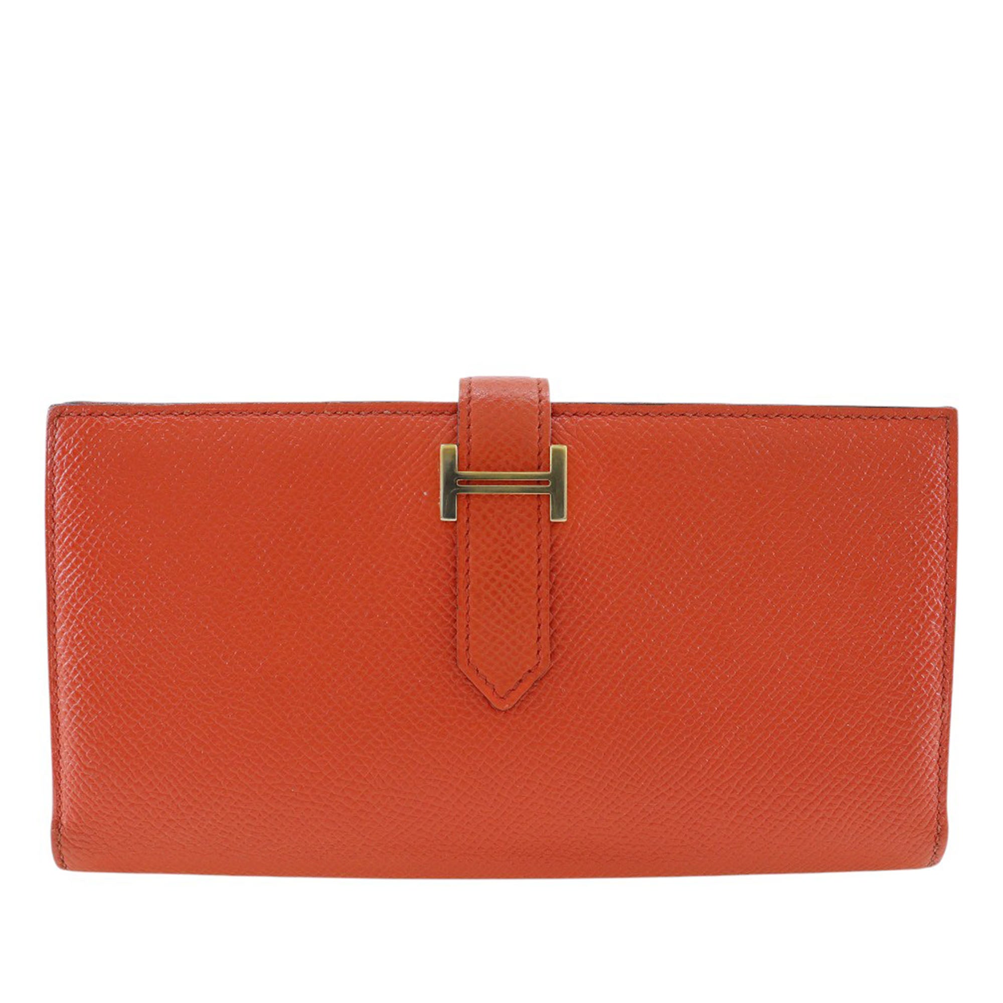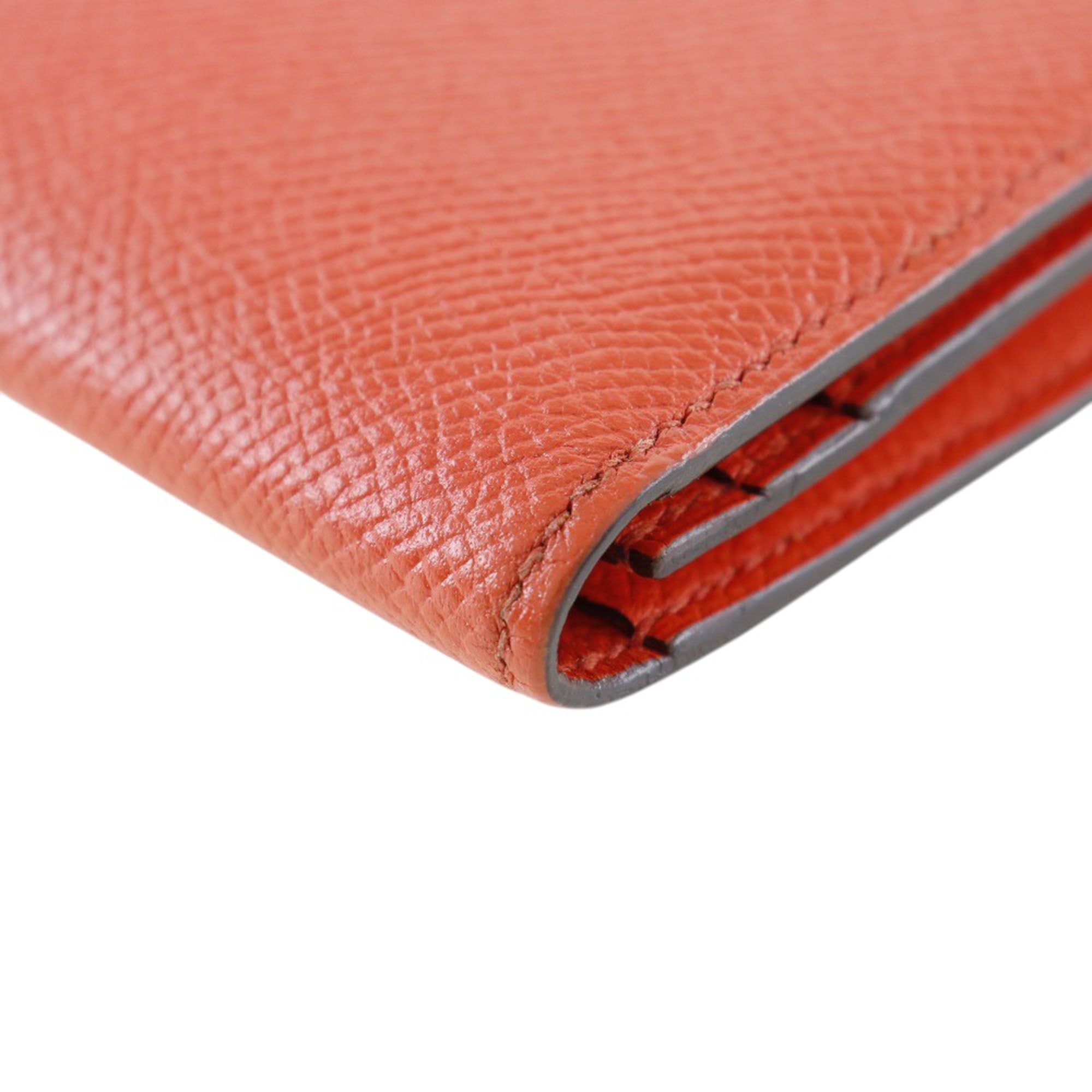 Product Details: Orange Hermès Epsom Bearn Soufflet Wallet. This long wallet features an Epsom leather body in Feu color, a flat leather strap with pull through closure, and interior zip and slip pockets. 3.5" L x 6.9" W x 0.8" D. Serial number T.