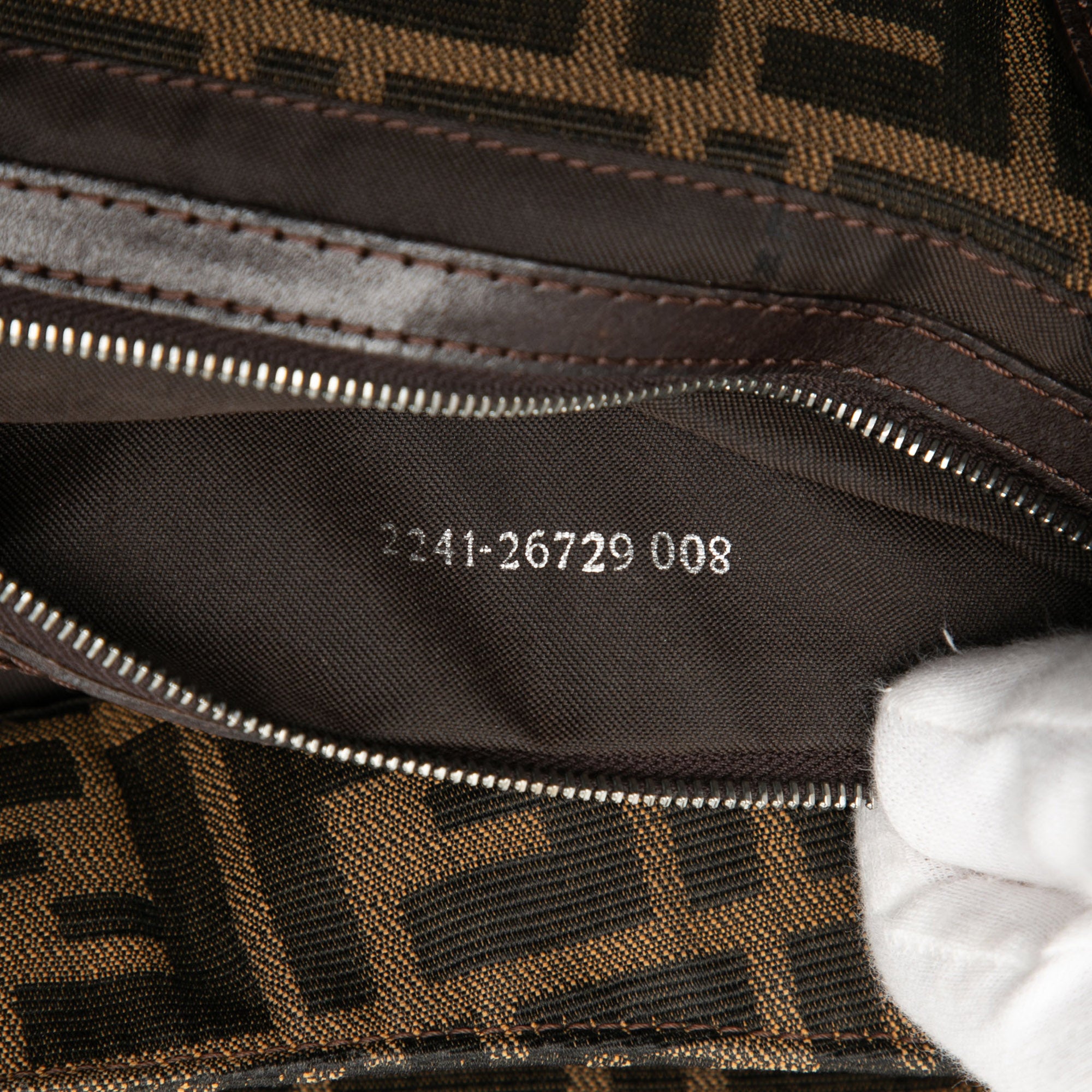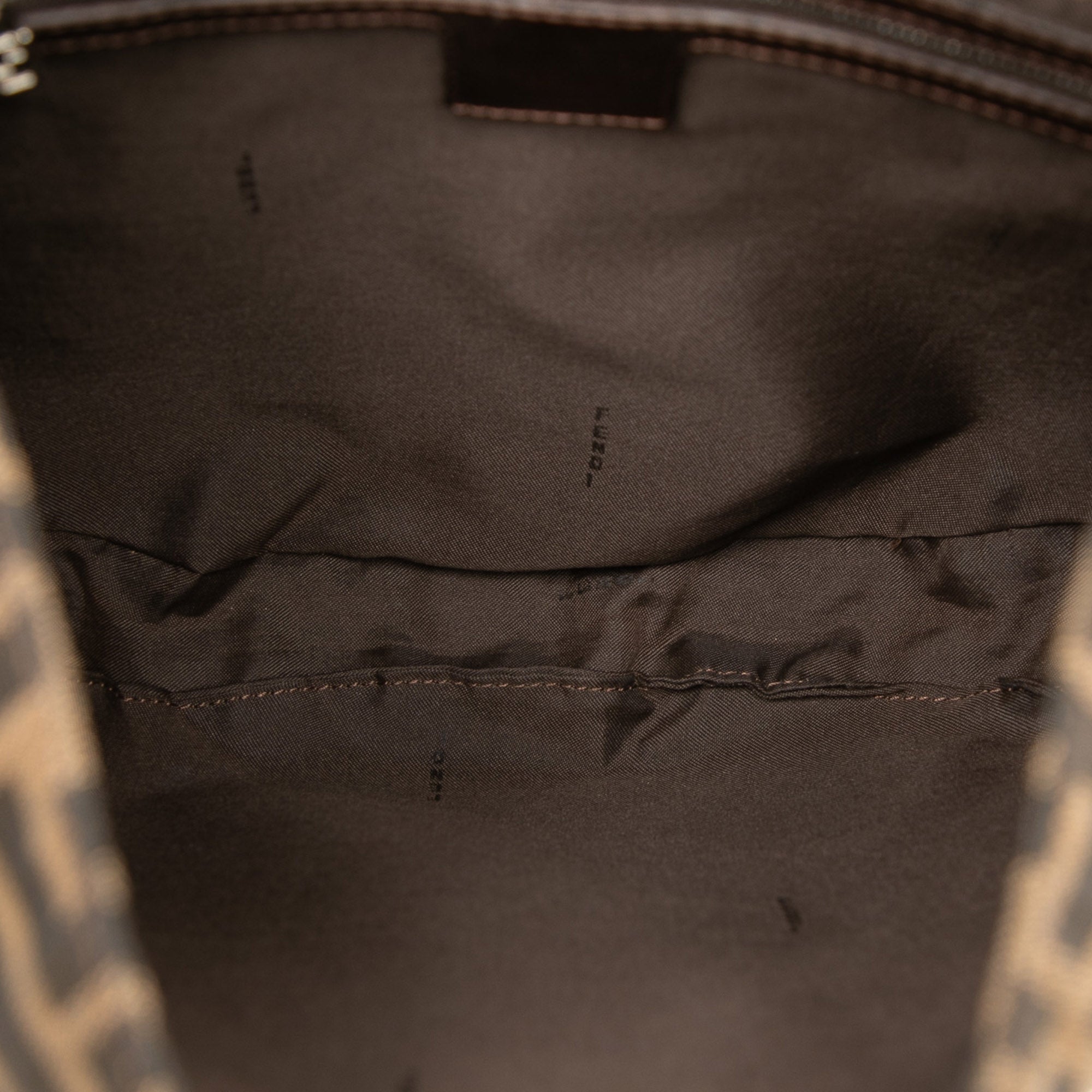 Product Details: Brown Fendi Zucca Canvas Croissant Hobo Shoulder Bag. This shoulder bag features a canvas body, a flat leather strap, an open top with a flat strap and magnetic closure, and a zip pocket. 10.2" L x 11.8" W x 1.6" D. Serial number 2241 26729 008.