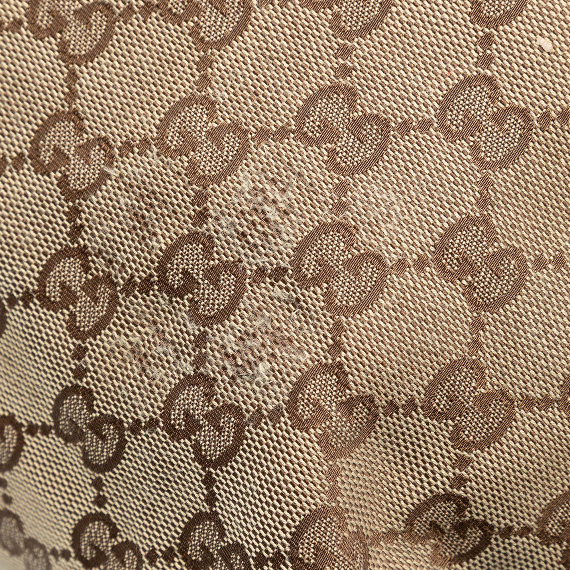 Product Details: Tan Gucci Large GG Canvas Icon Bit Hobo Satchel. This satchel features a canvas body with leather trim, a flat leather strap, a detachable flat shoulder strap, a top zip closure, and interior zip and slip pockets. 14.6" L x 11.6" W x 9.4" D. Serial number 232950 486628.