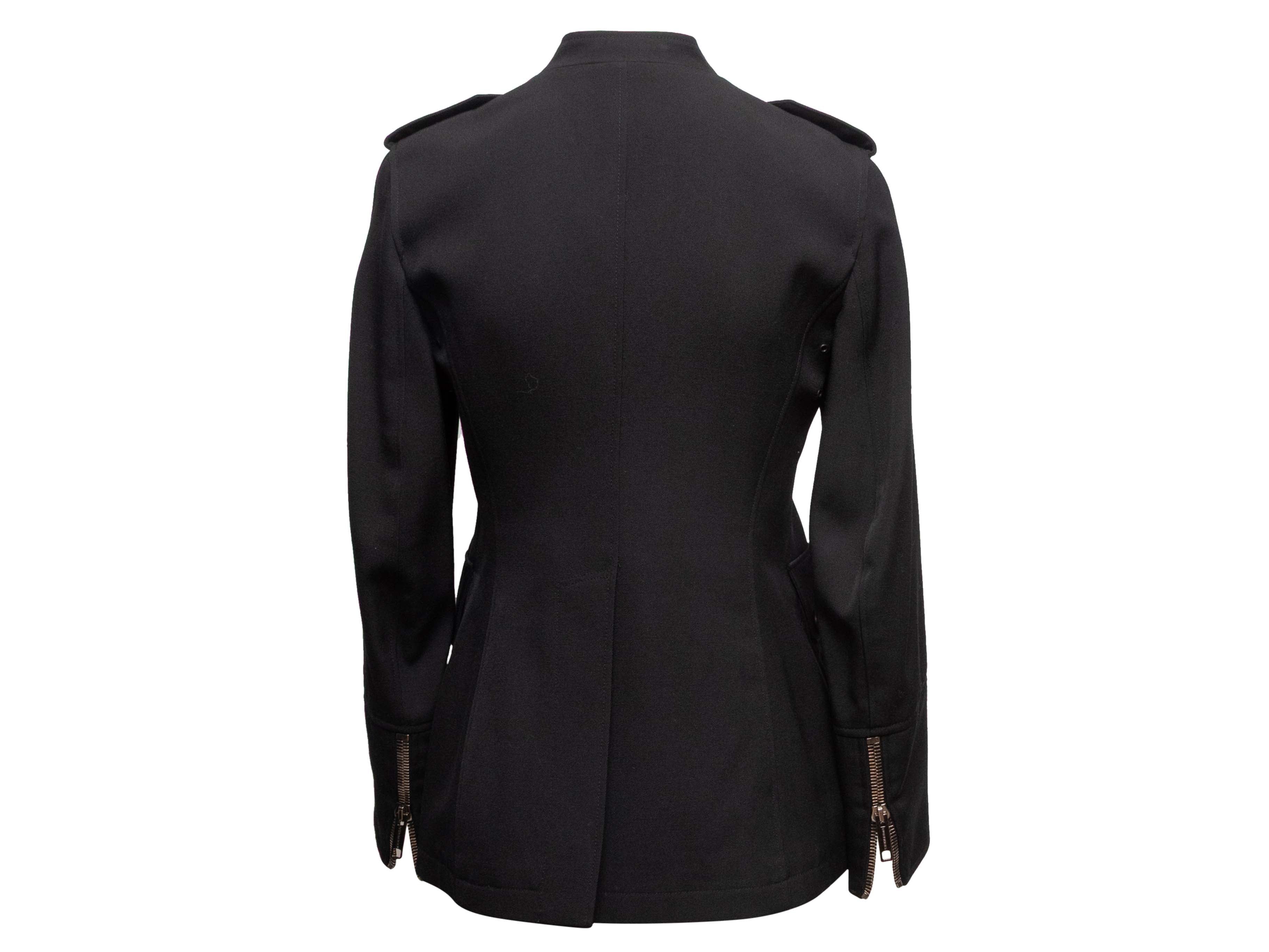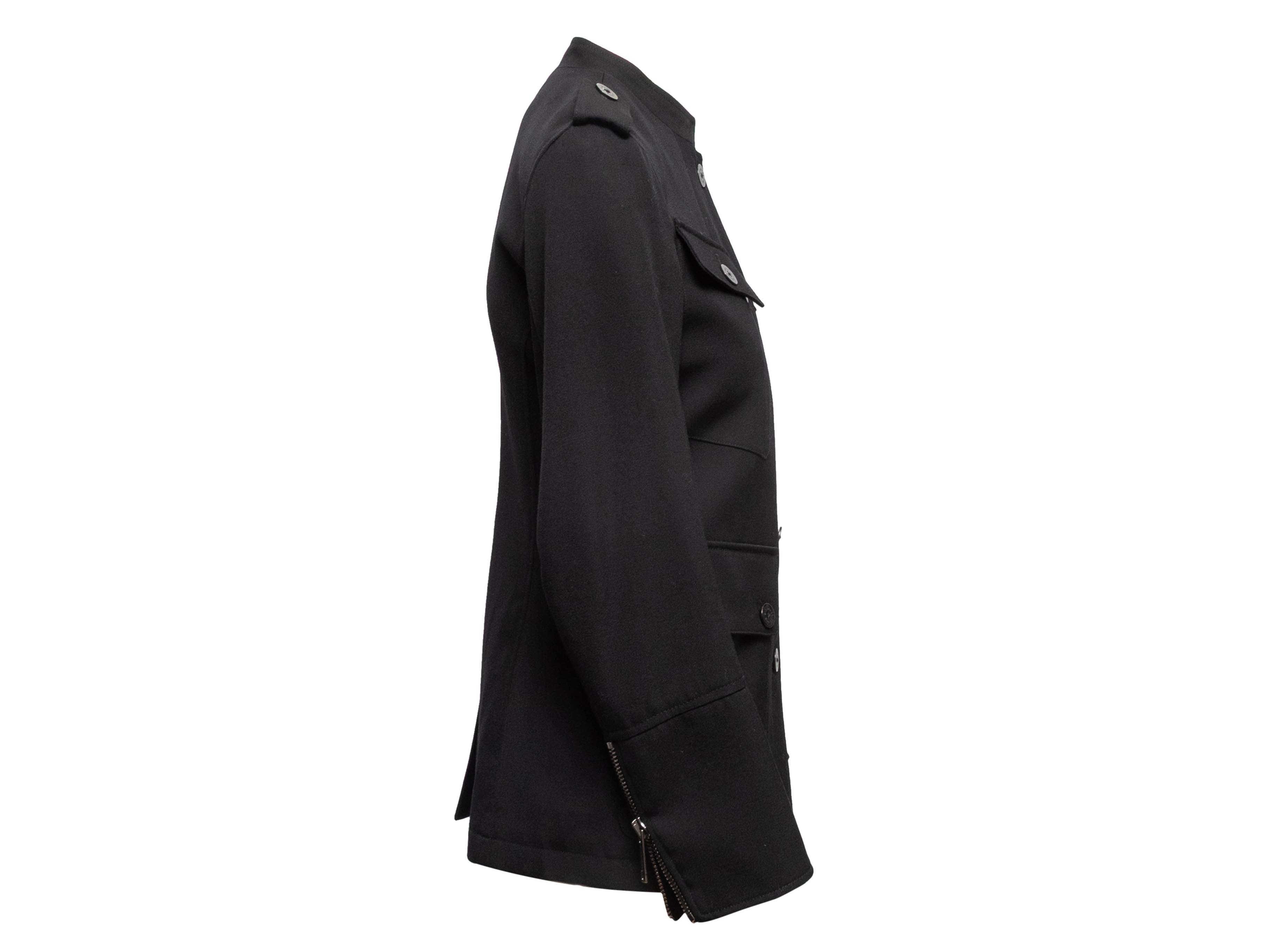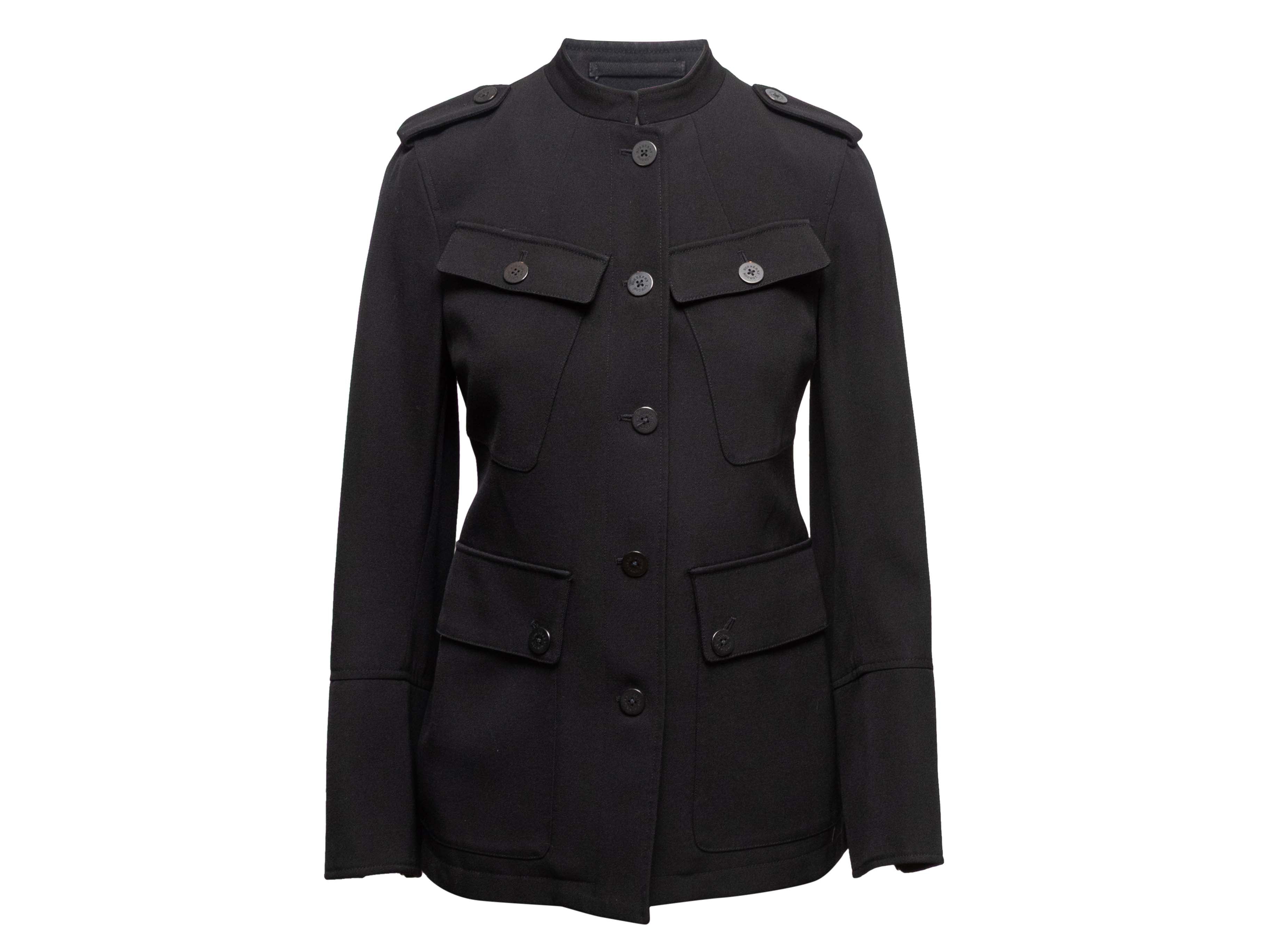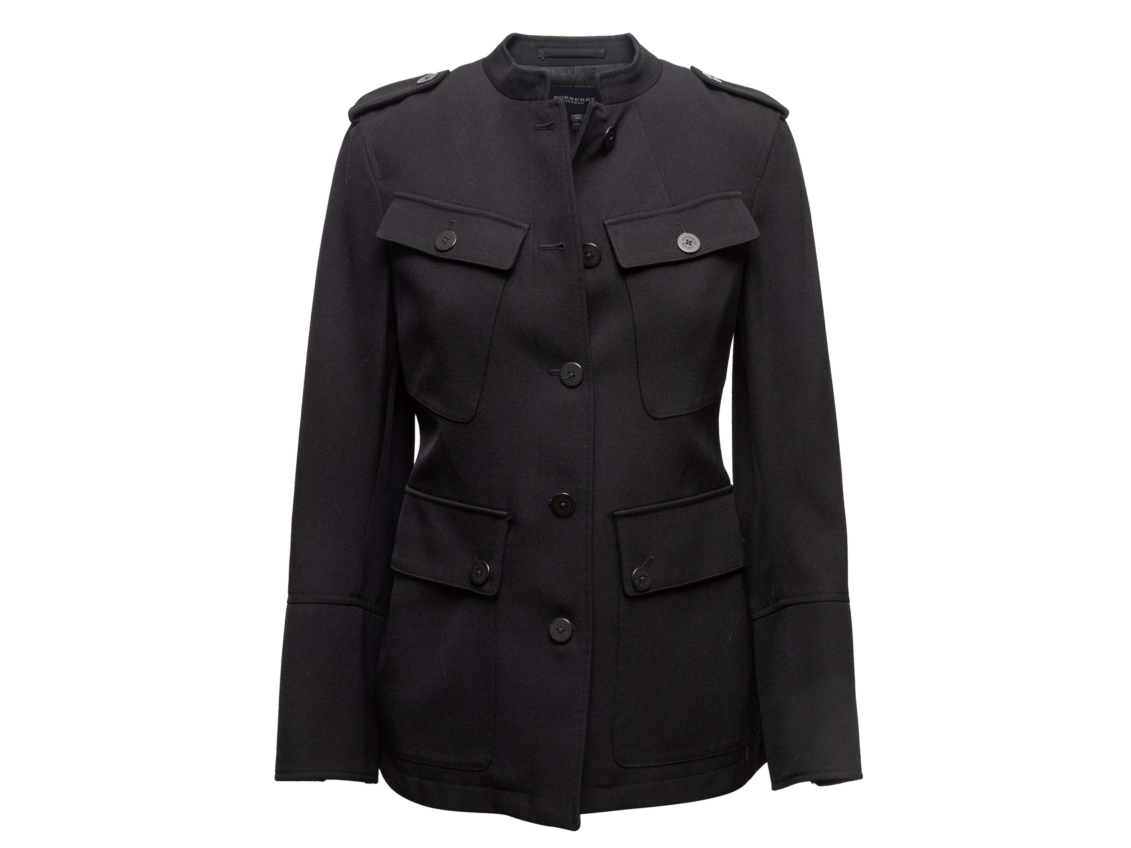 Product Details: Black wool military cargo jacket by Burberry. Mandarin collar. Four pockets. Button closures at front. 32" bust, 13.5" shoulder width, 24" sleeve length, 29.5" length.