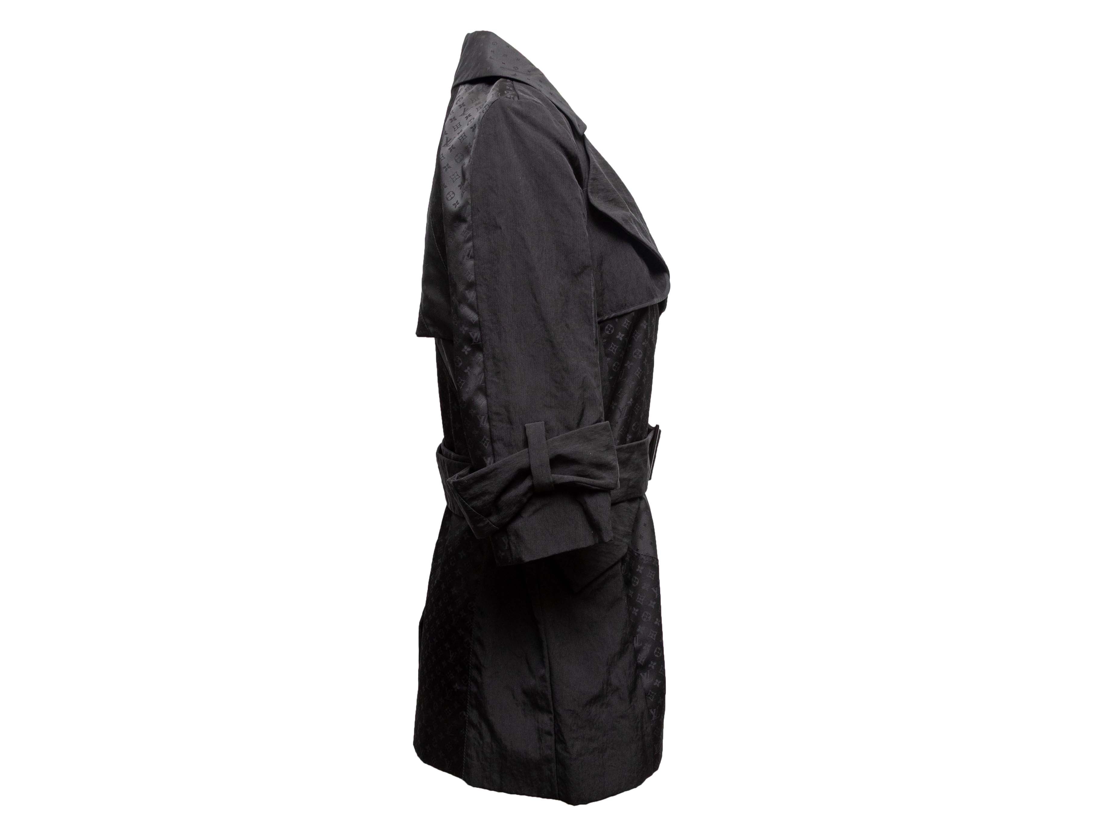 Product Details: Black nylon logo pattern trench coat by Louis Vuitton. Notched lapel. Belt at waist. Front closure. 30" bust, 16" shoulder width, 26" sleeve length, 31.5" length.