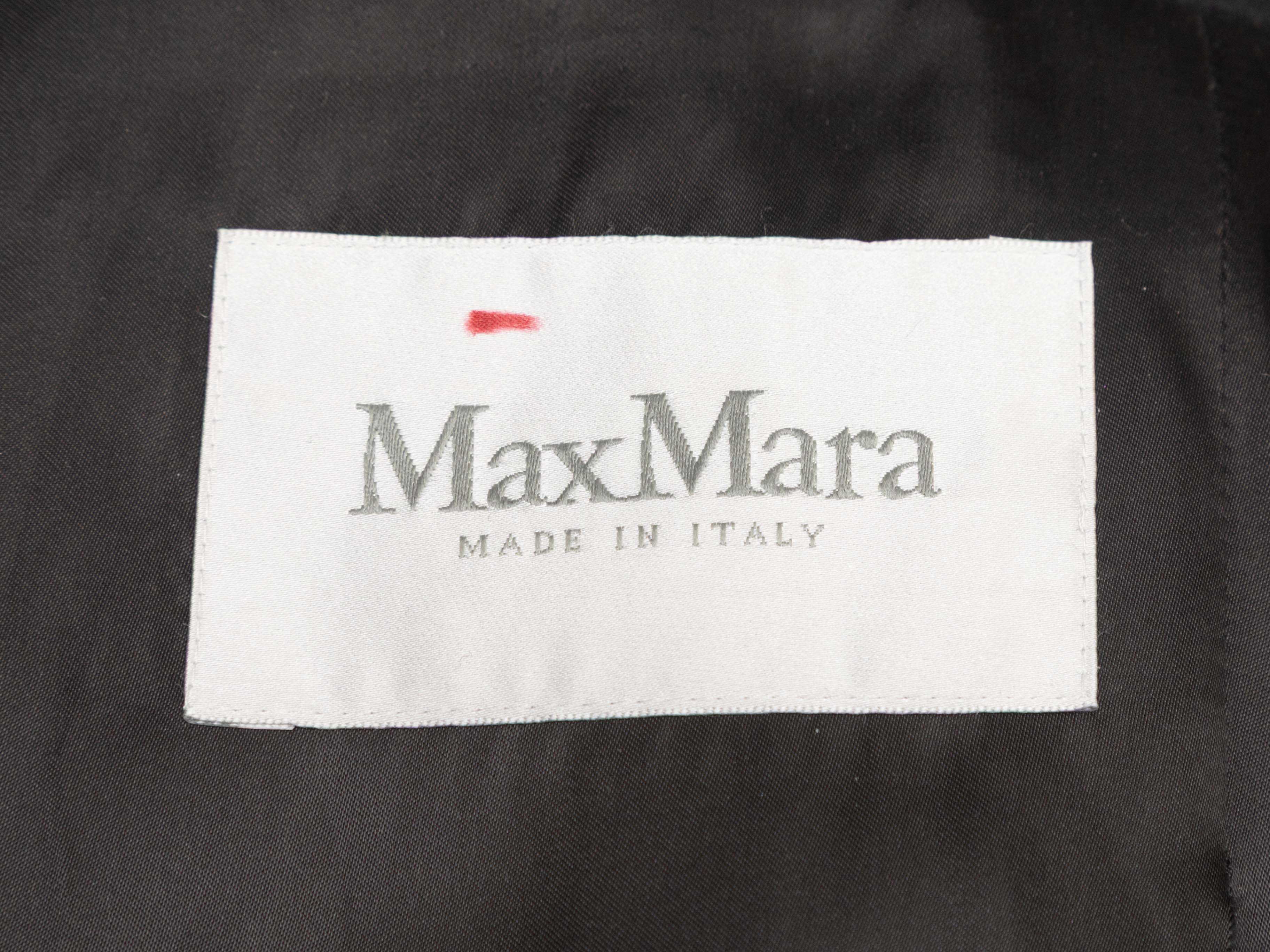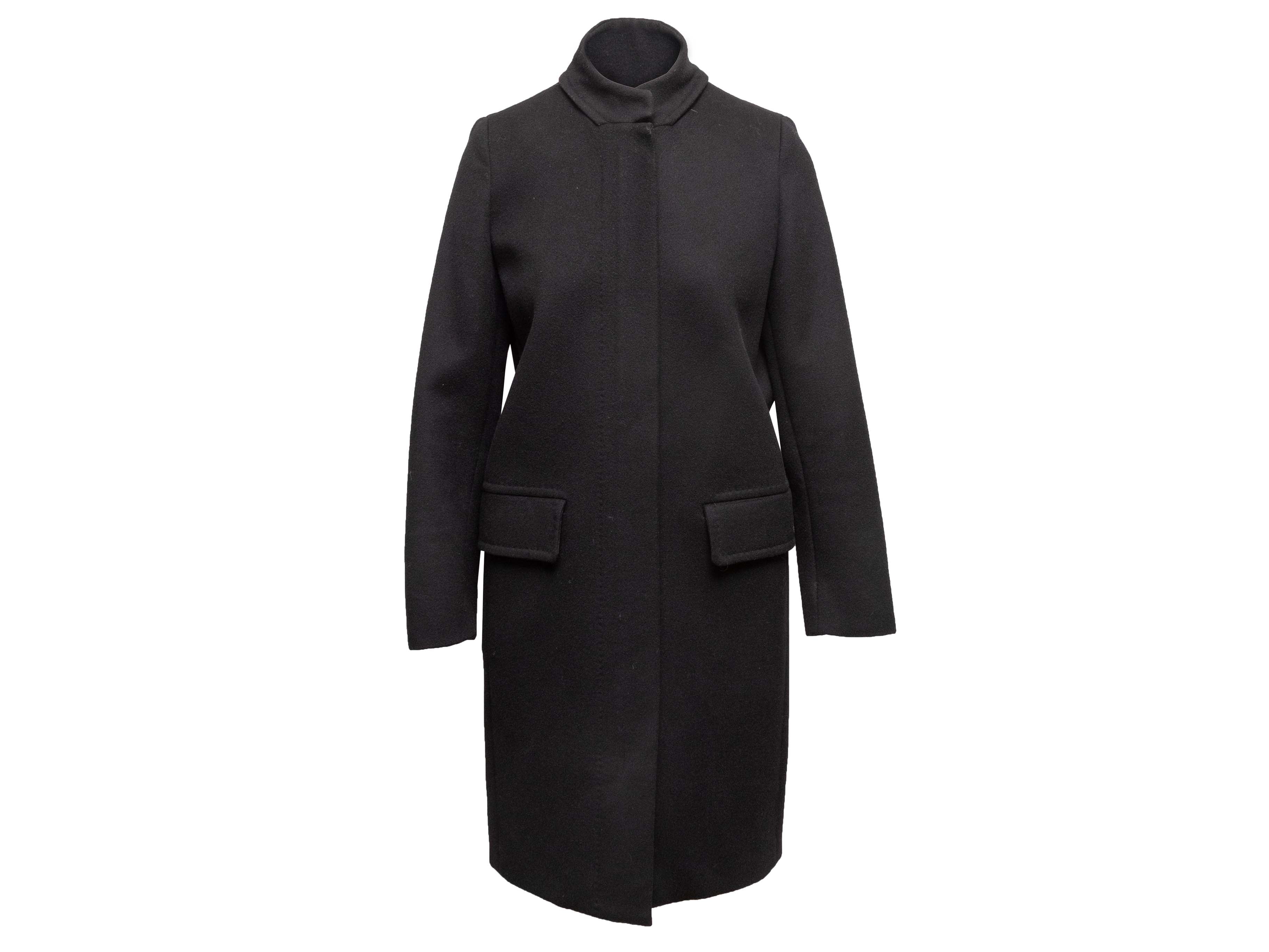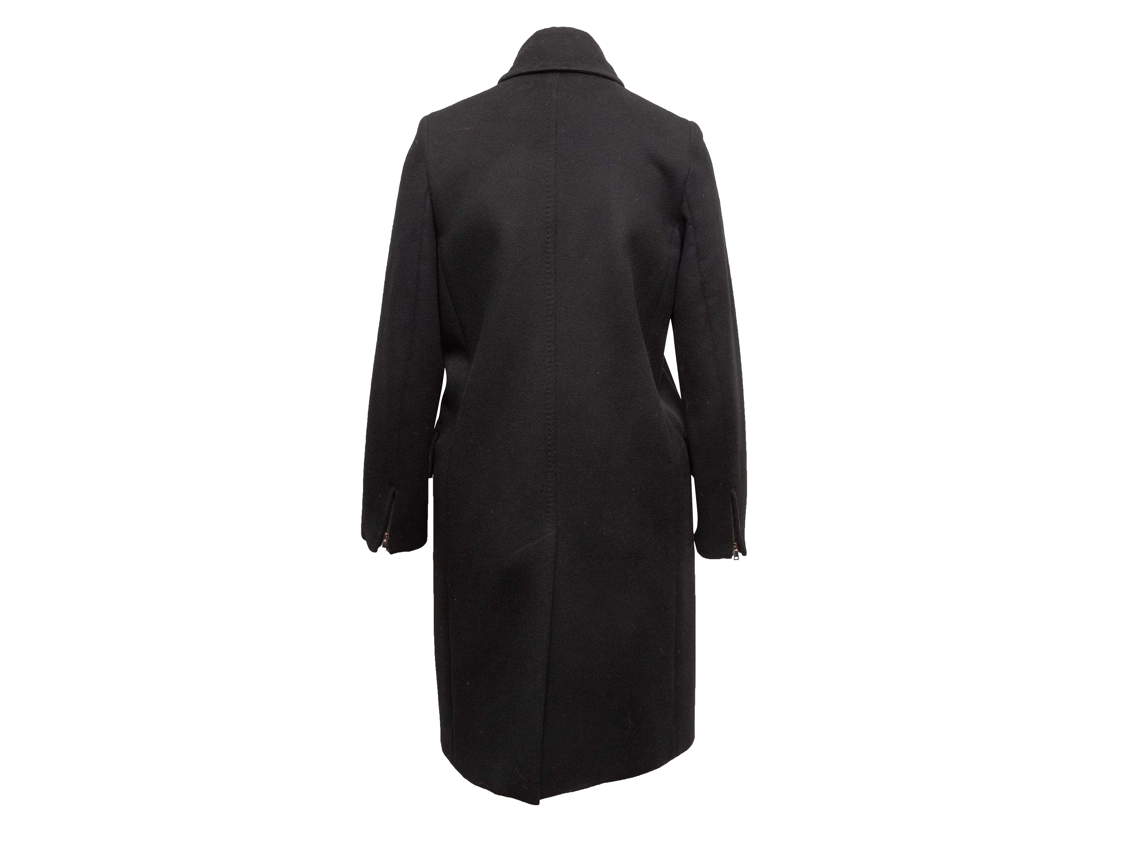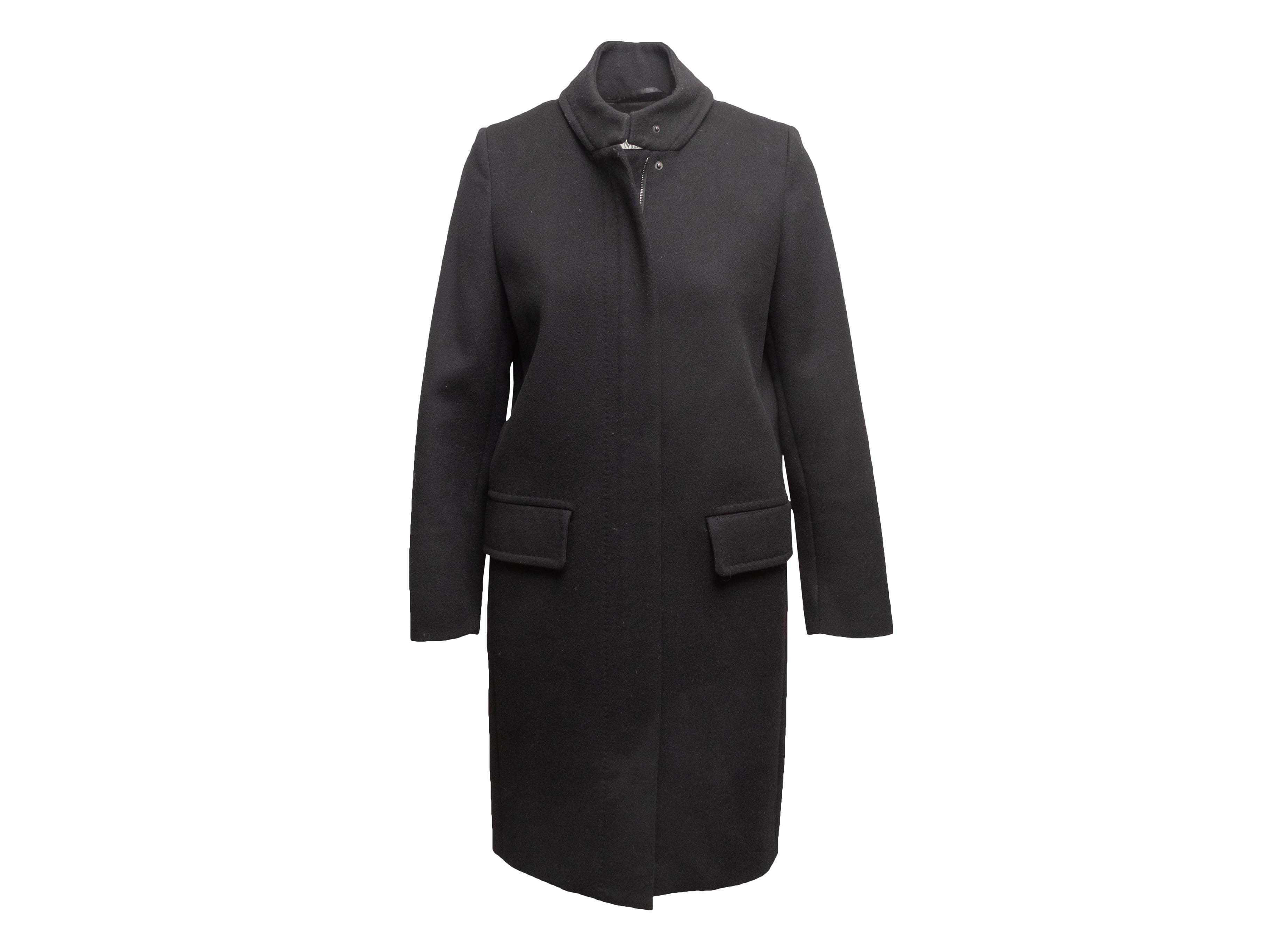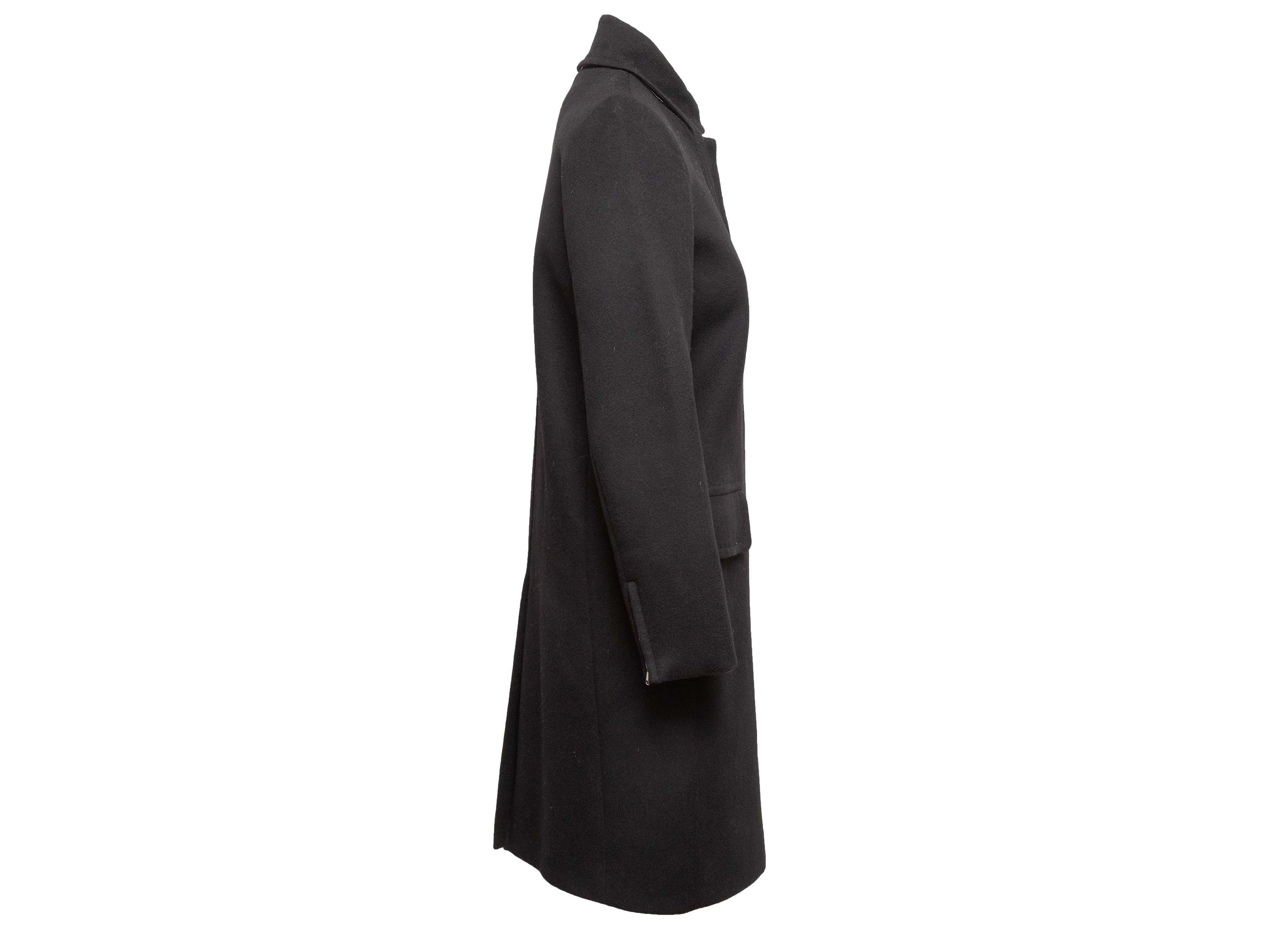 Product Details: Black virgin wool and cashmere long coat by Max Mara. Stand collar. Dual hip pockets. Front zip and snap closures. 34" bust, 14.5" shoulder width, 24" sleeve length, 37.5" length.