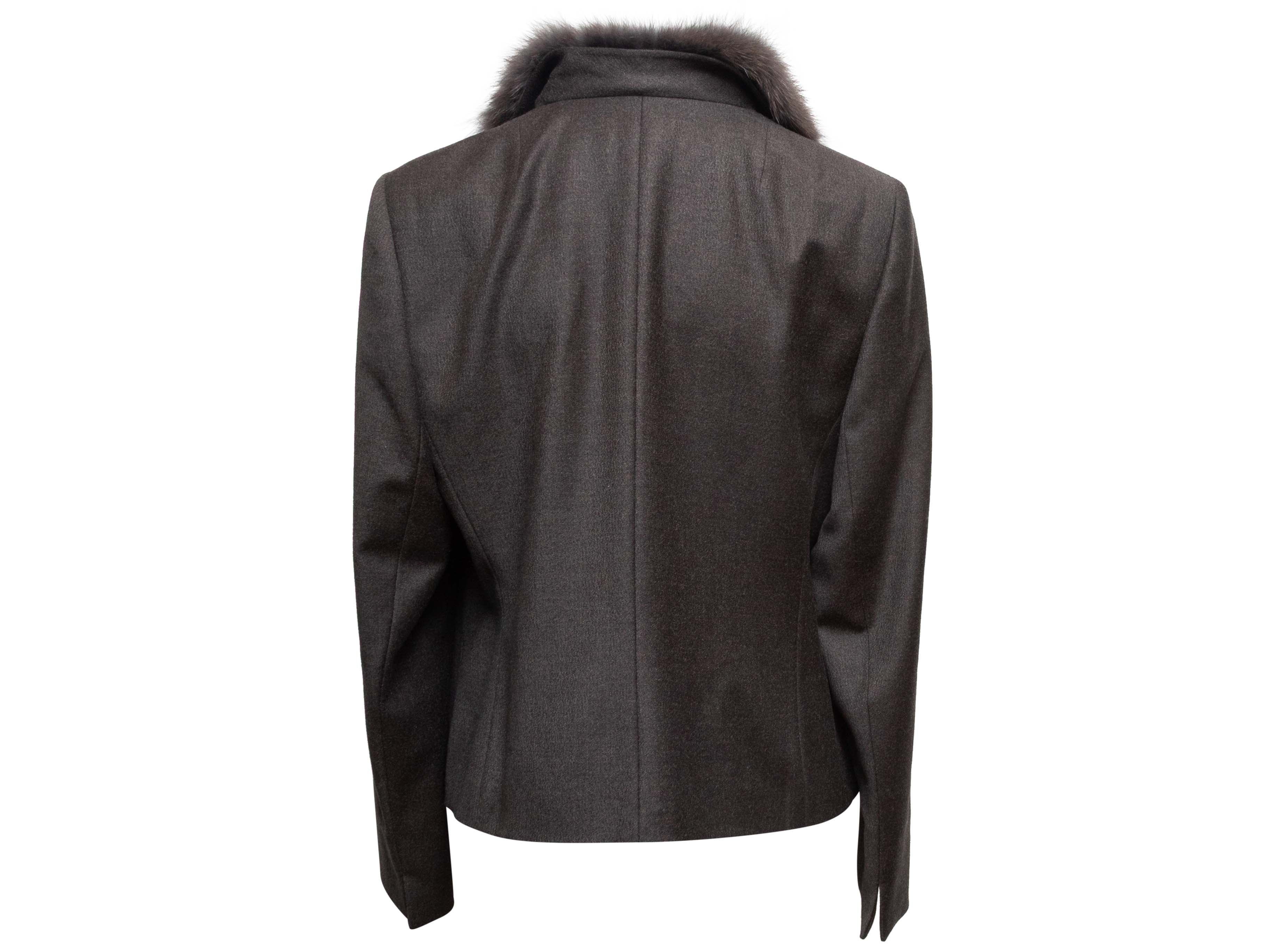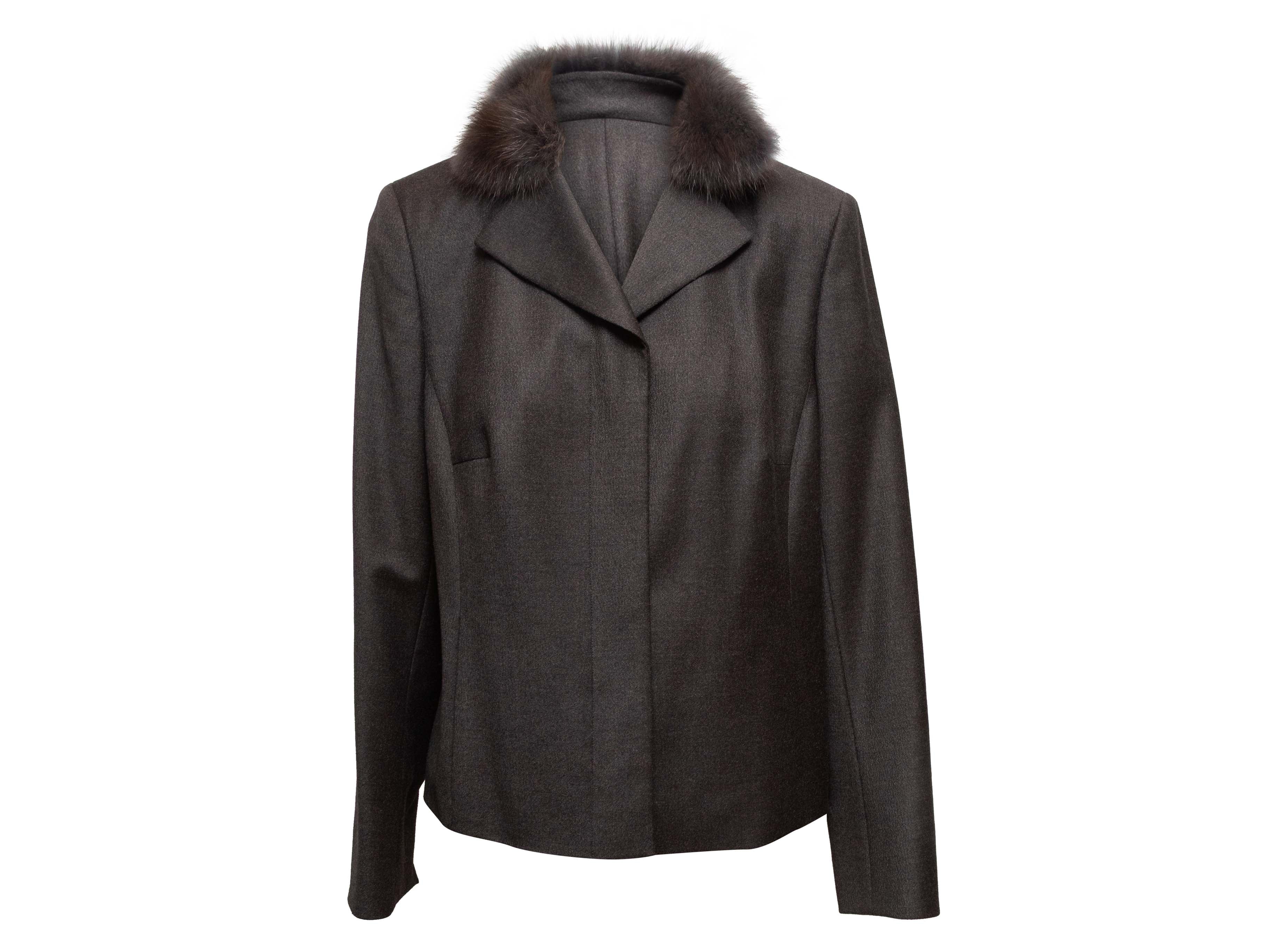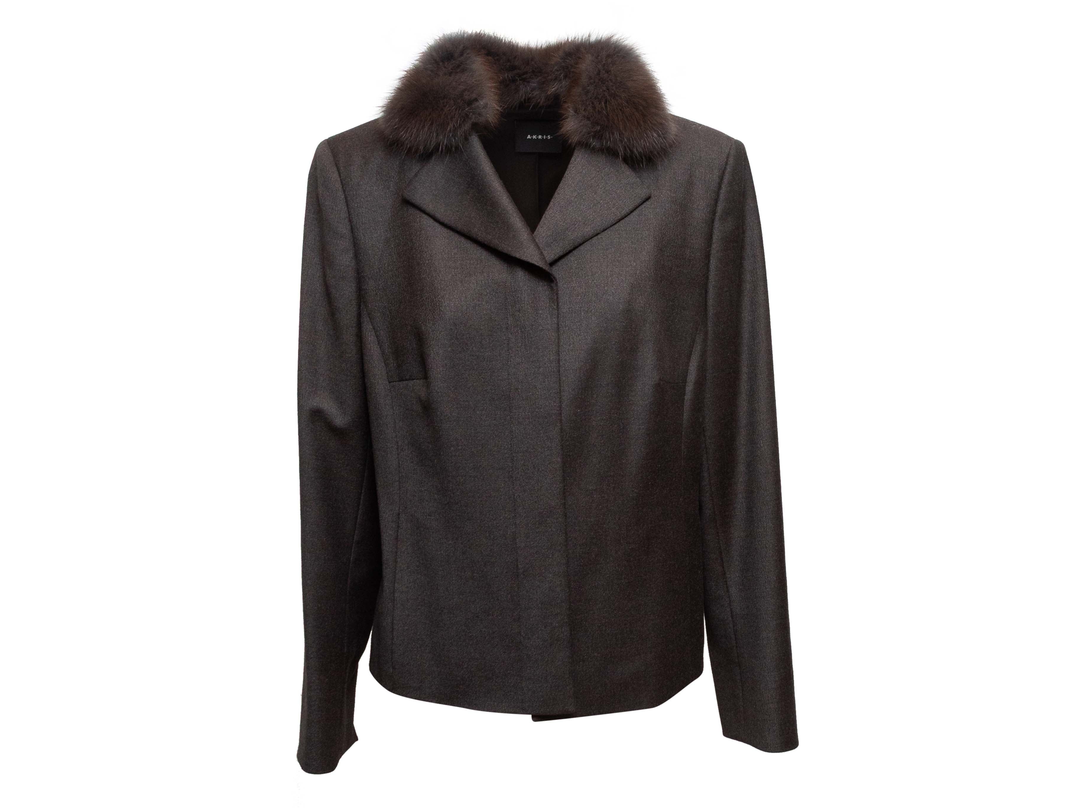 Product Details: Brown wool fur-trimmed jacket by Akris. Notched lapel. Structured shoulders. Concealed front closures. 36" bust, 15.5" shoulder width, 24.5" sleeve length, 27" length.