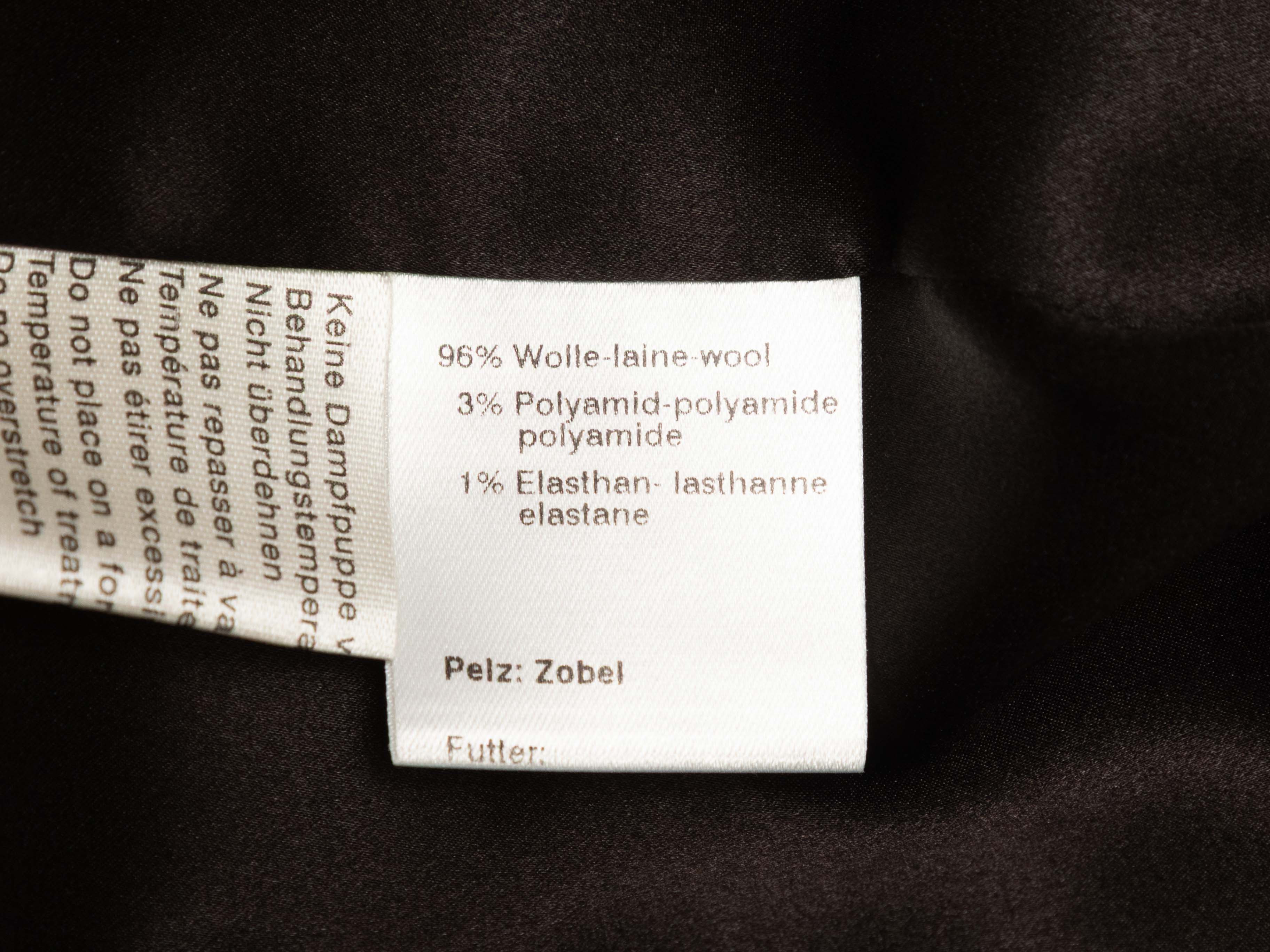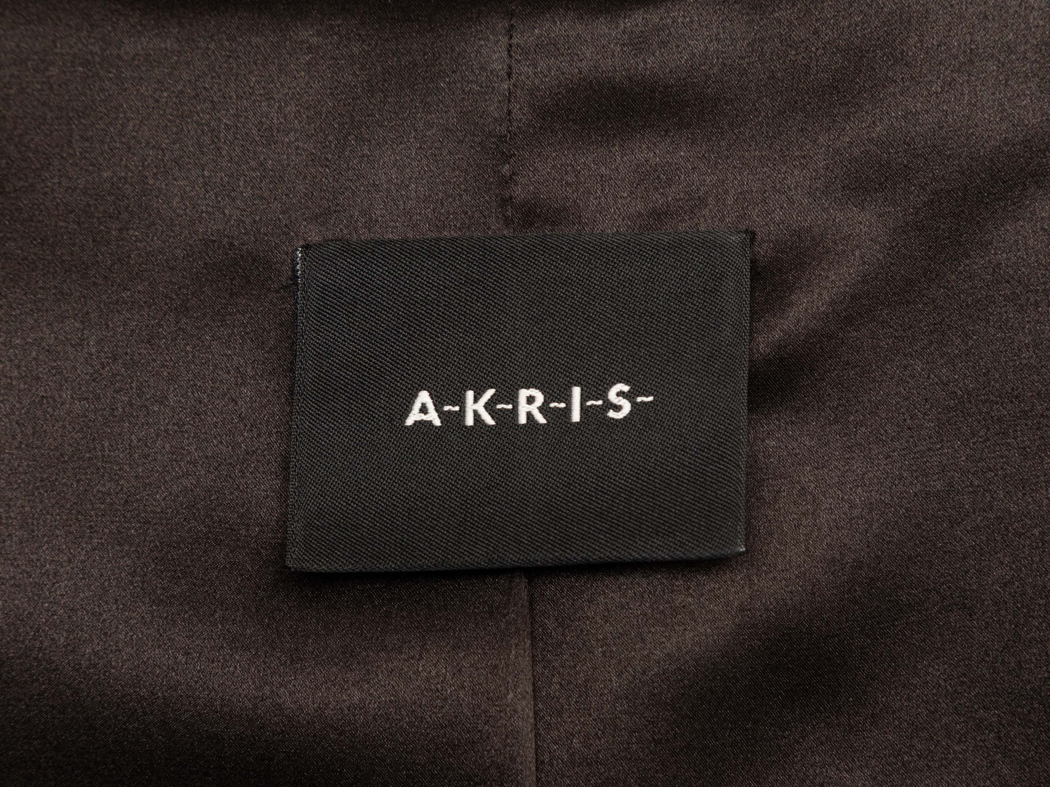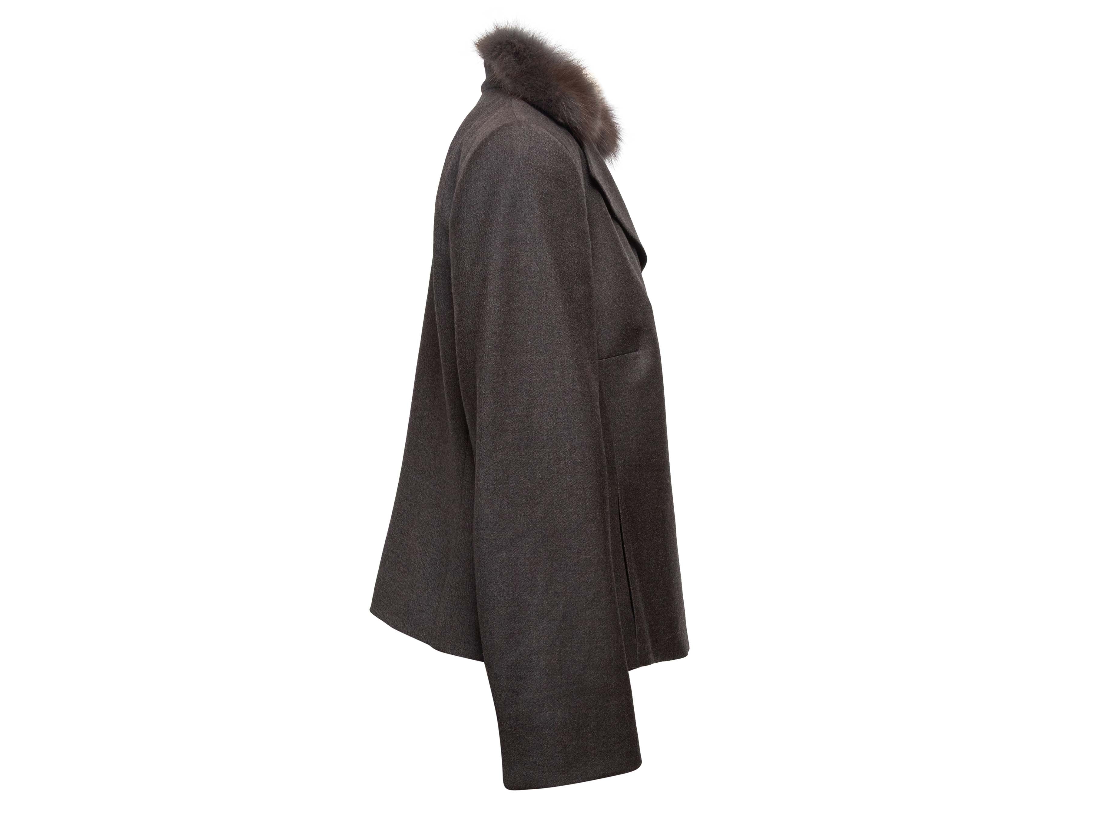 Product Details: Brown wool fur-trimmed jacket by Akris. Notched lapel. Structured shoulders. Concealed front closures. 36" bust, 15.5" shoulder width, 24.5" sleeve length, 27" length.