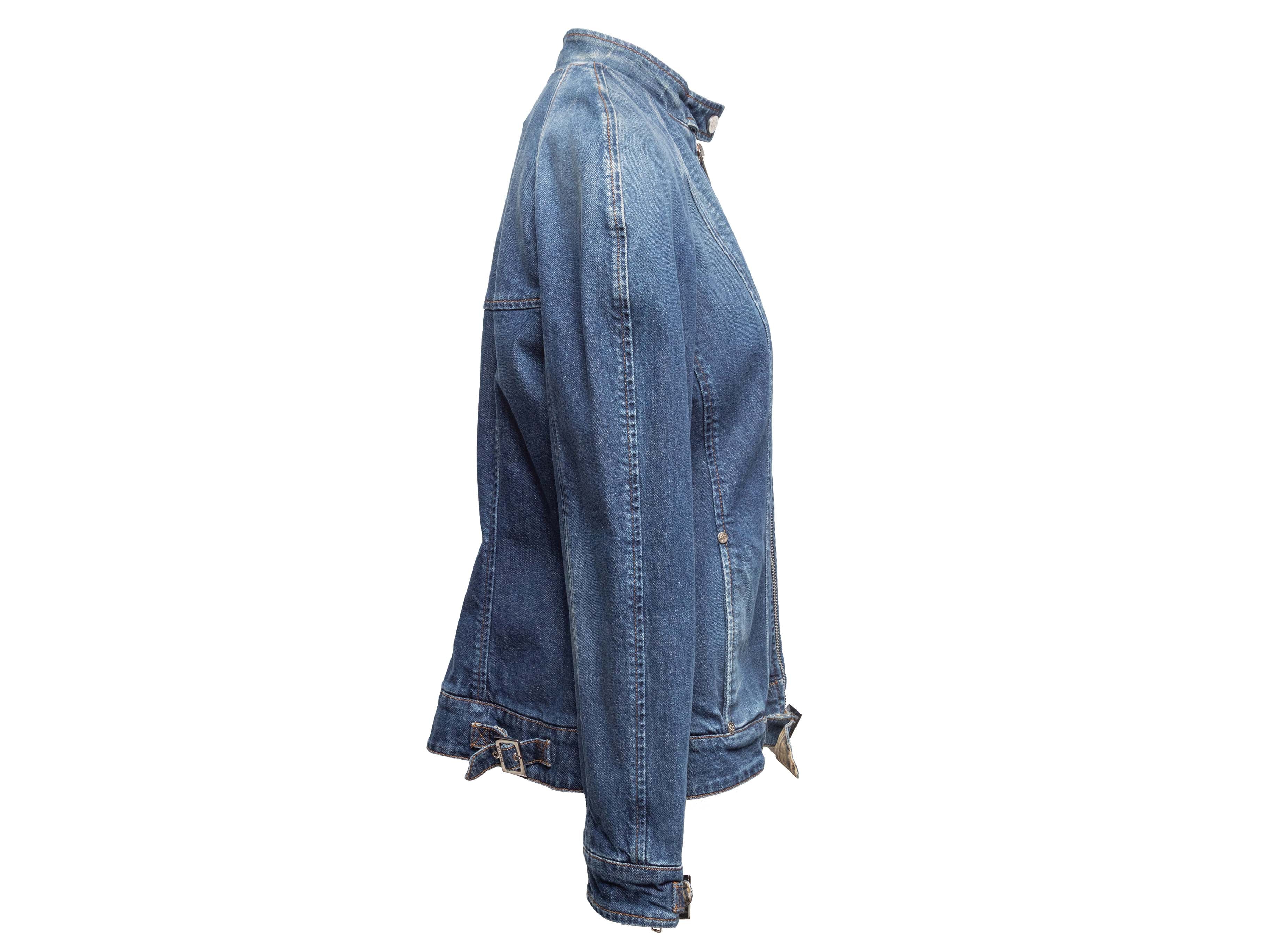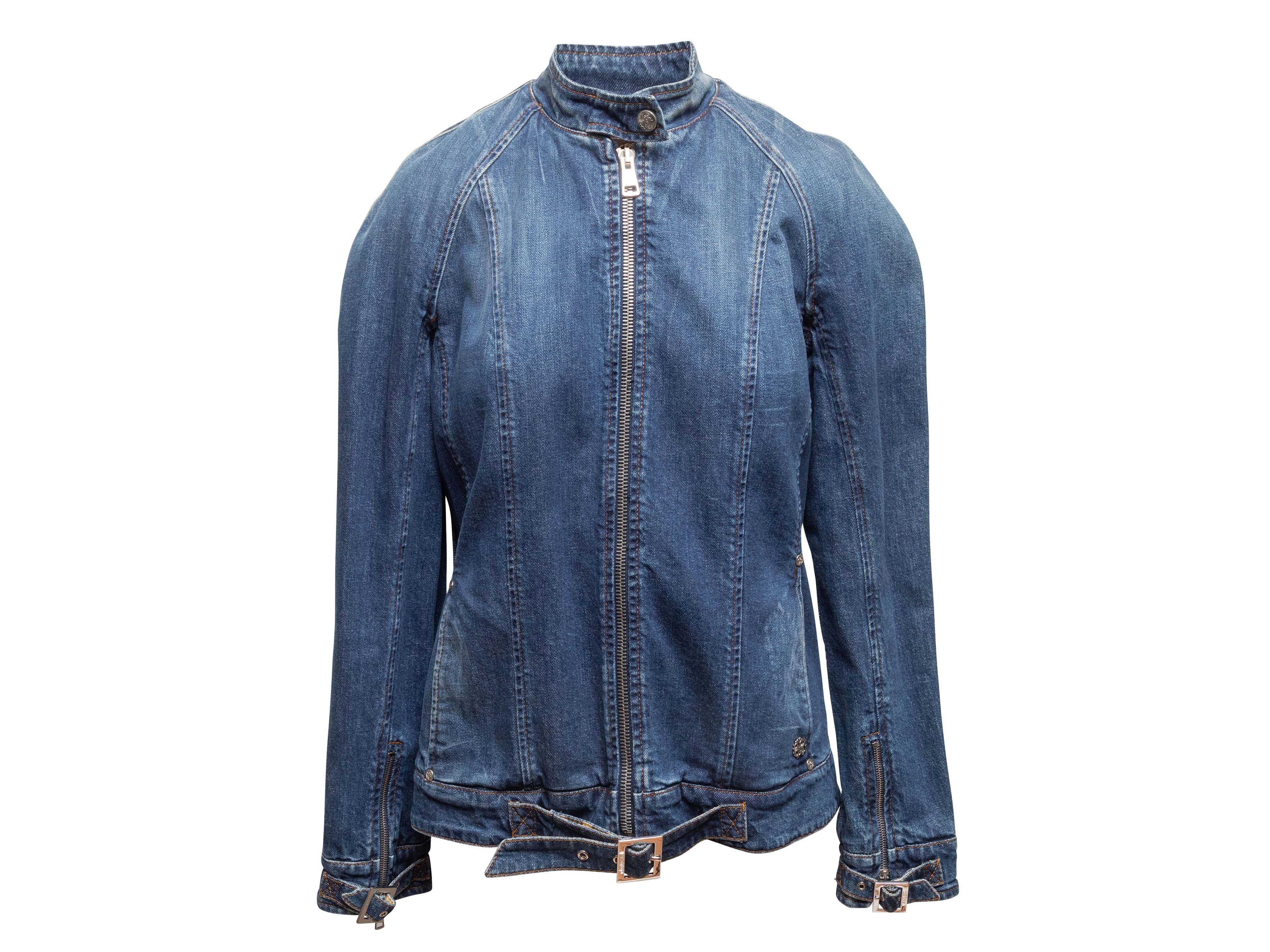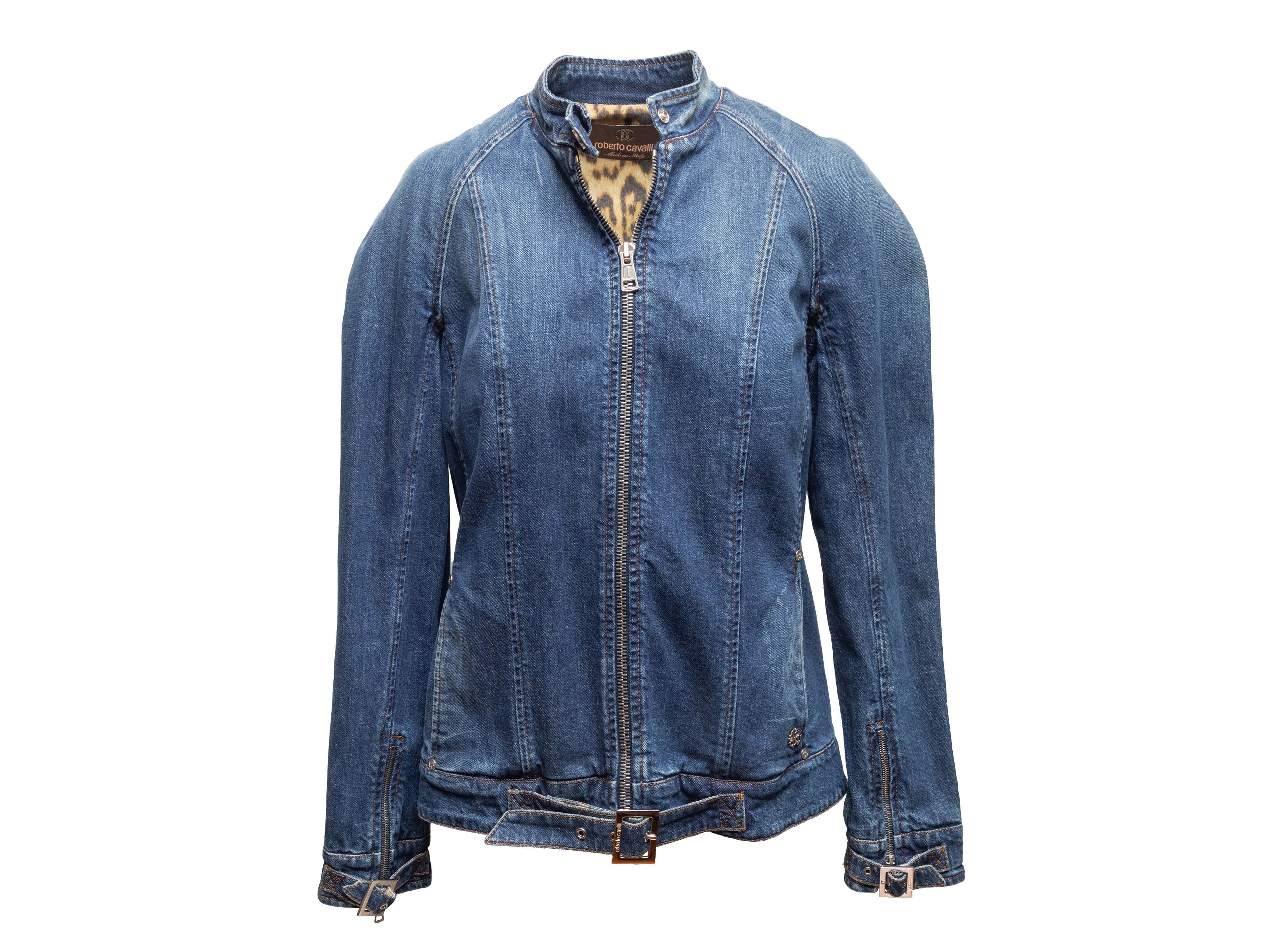 Product Details: Medium wash denim moto jacket by Roberto Cavalli. Mock neck collar. Dual hip pockets. Buckles at cuffs and hem. Zip closure at front. 36" bust, 15.5" shoulder width, 28" sleeve length, 25.5" length.
