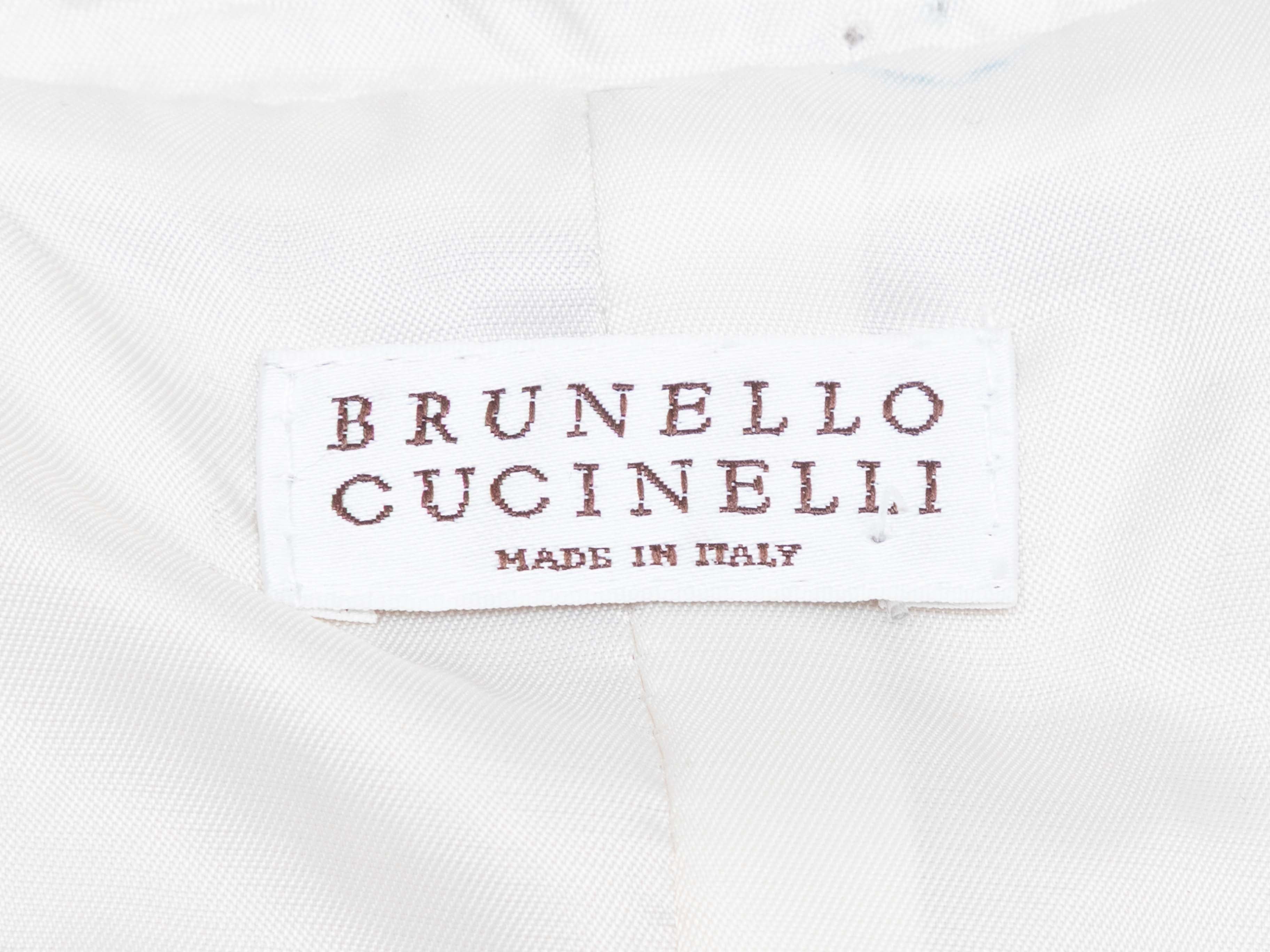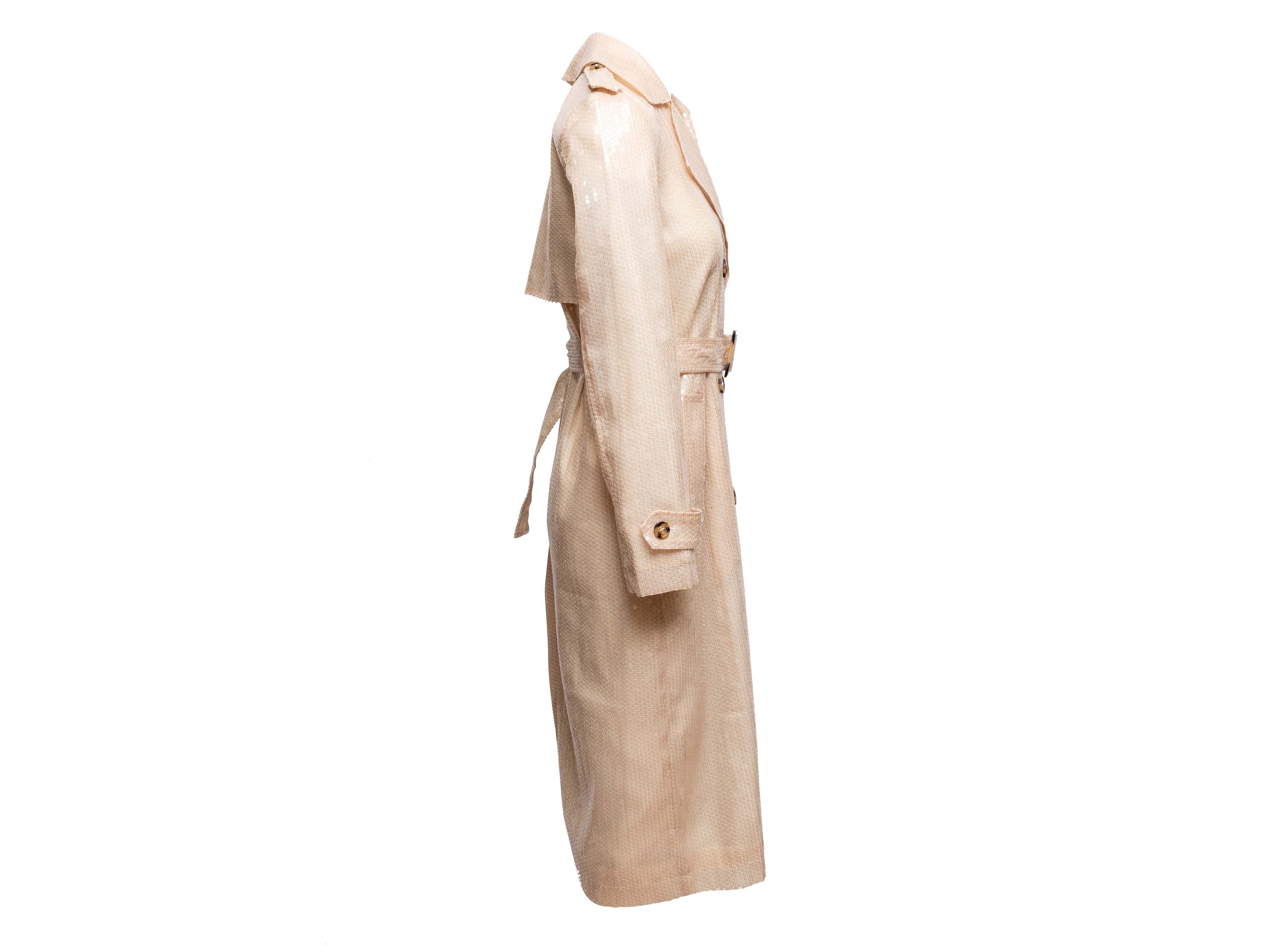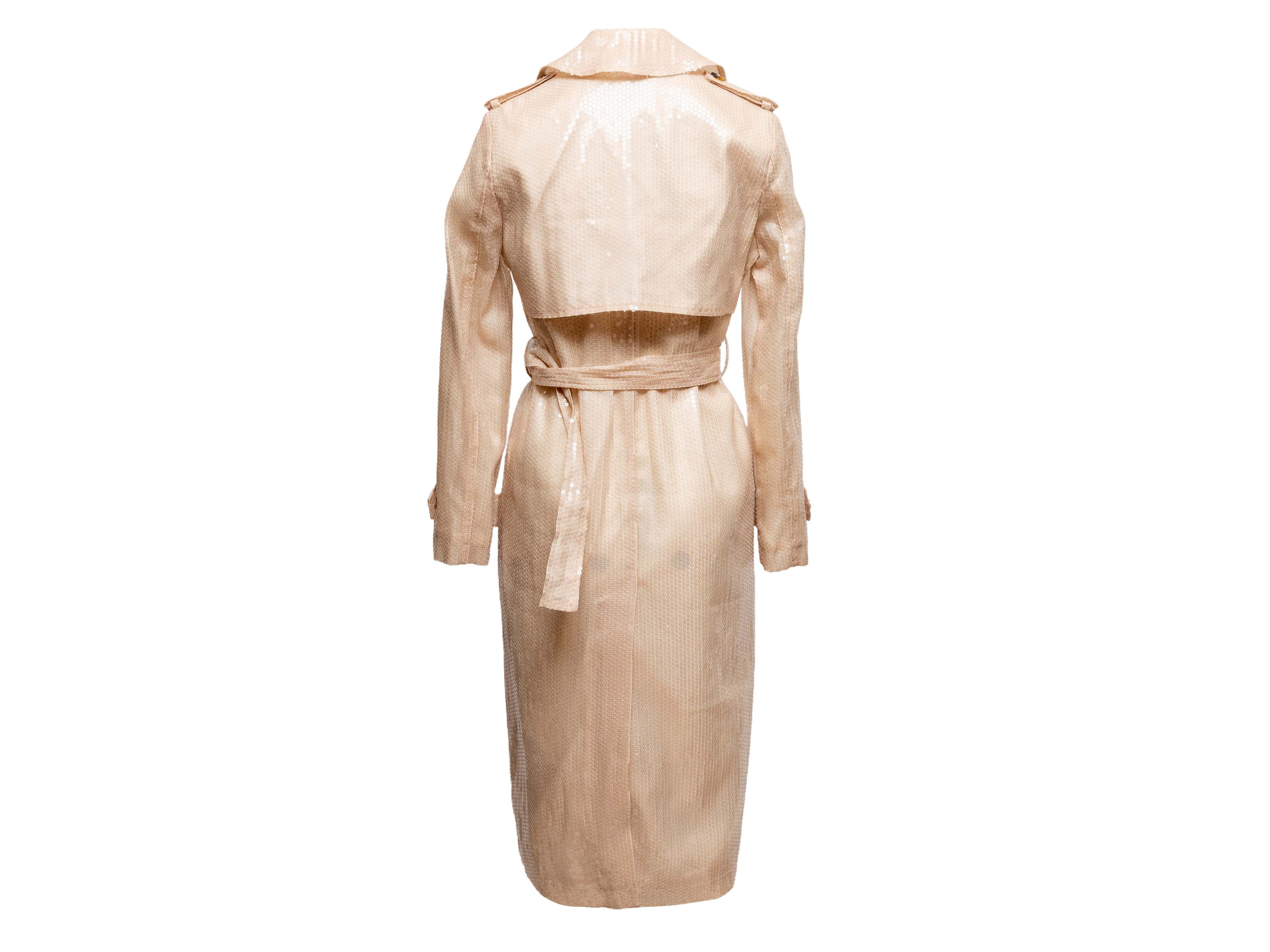 Product Details: Tan long sequined trench coat by Brunello Cucinelli. Notched lapel. Dual hip pockets. Belt at waist. Double-breasted front button closures. 35" bust, 15" shoulder width, 25" sleeve length, 46" length.