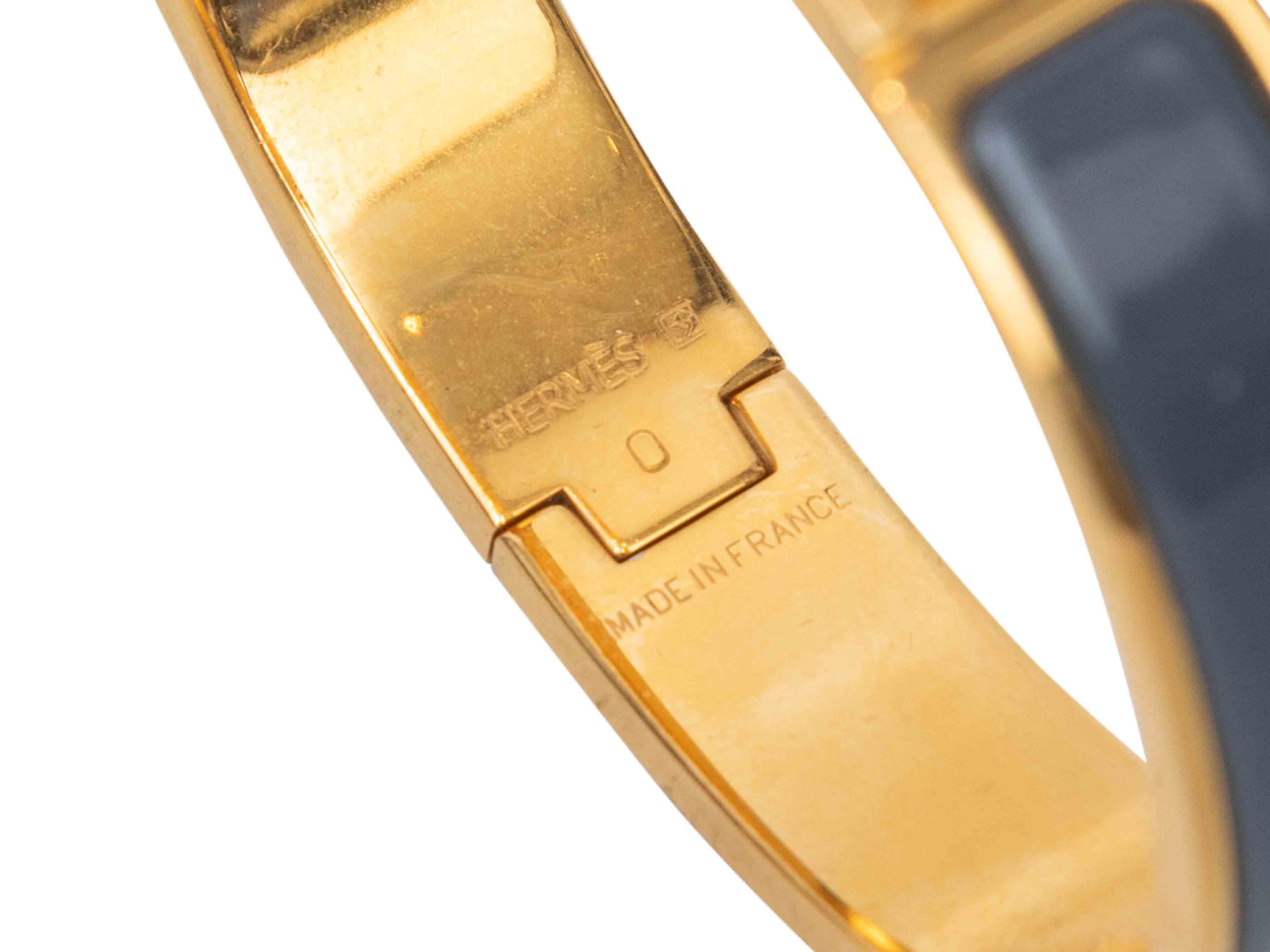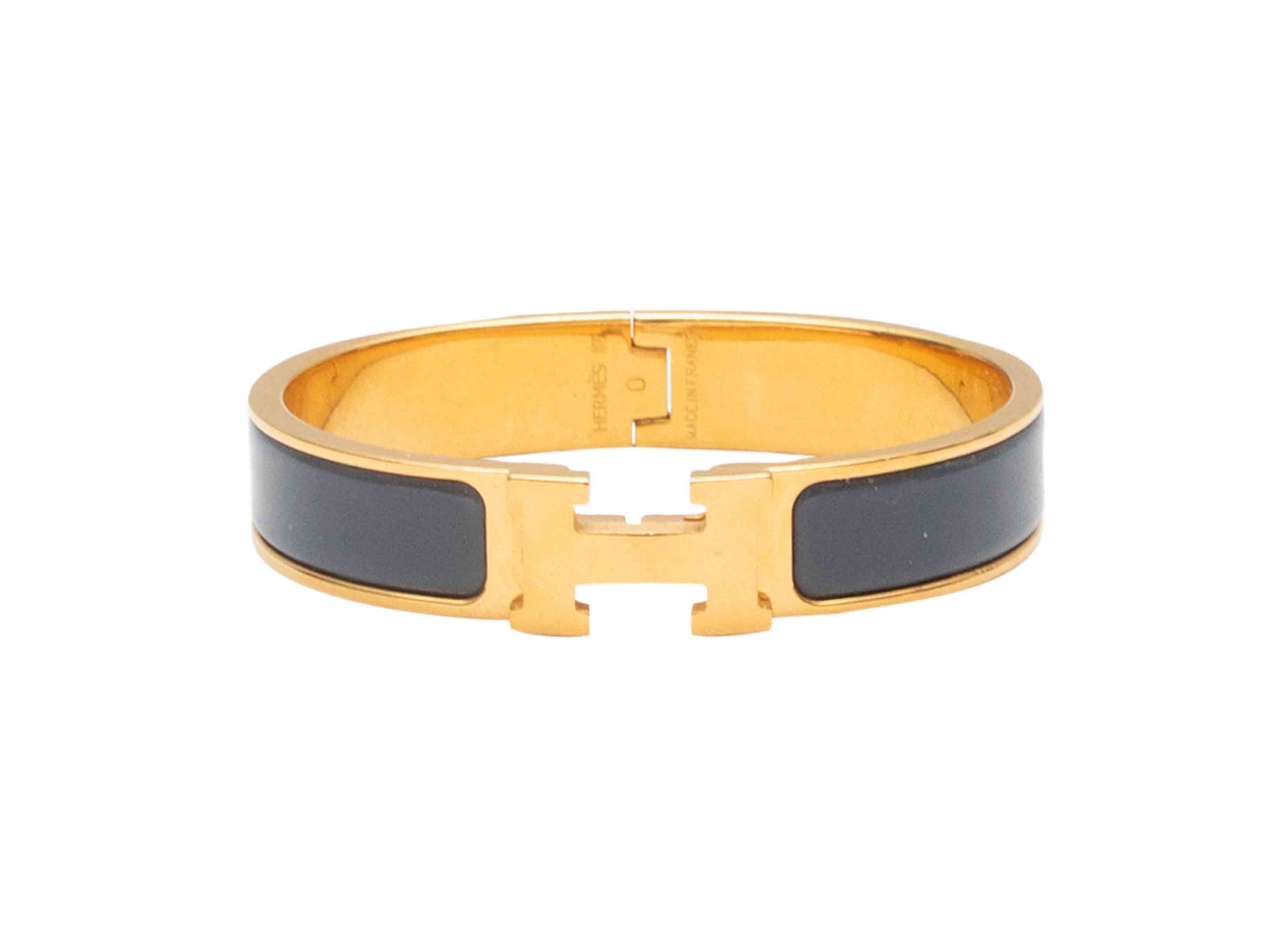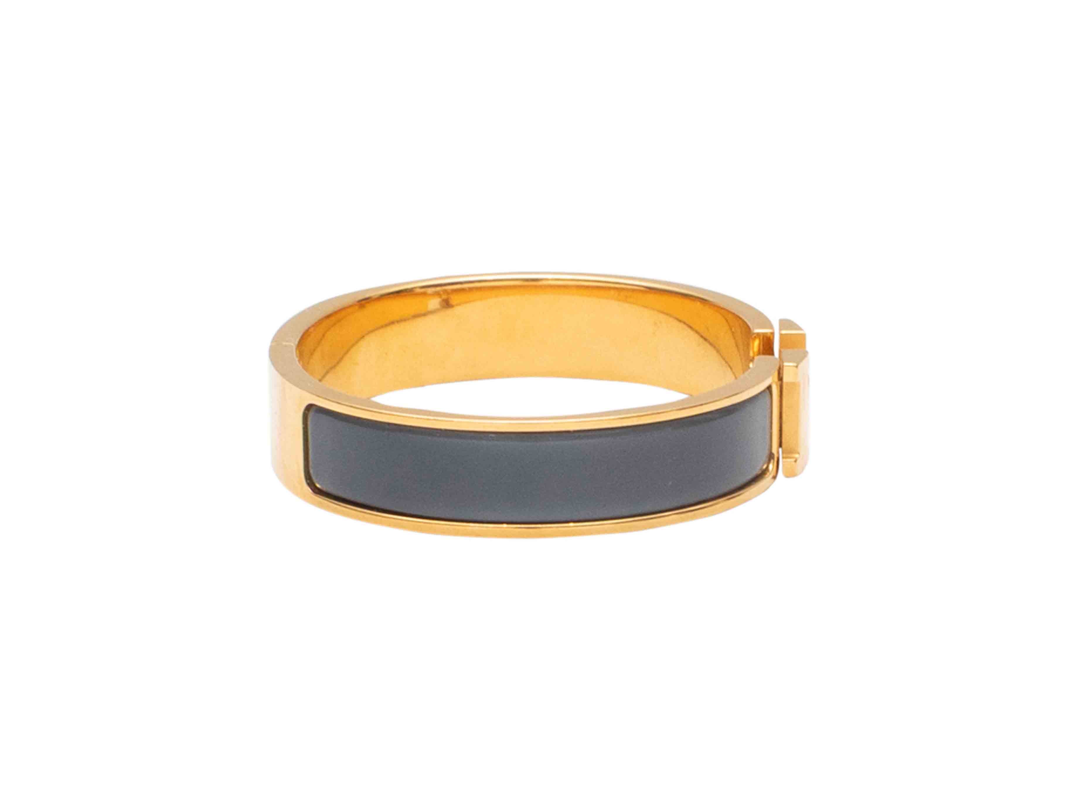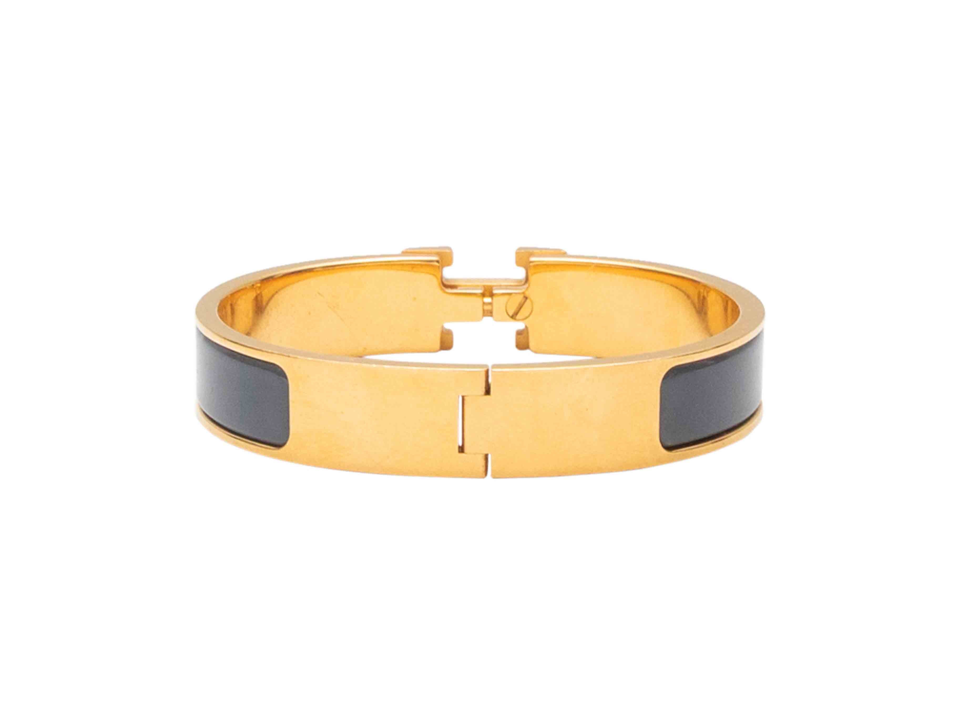 Product Details: Grey enamel and yellow gold plated Clic H bangle bracelet by Hermes. Hinge closure. 0.5" width, 2.25" across.