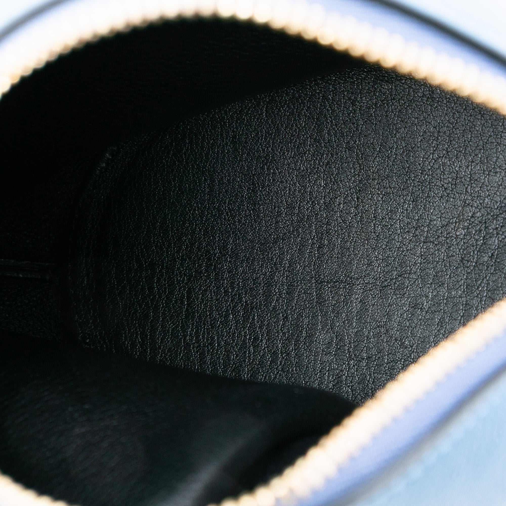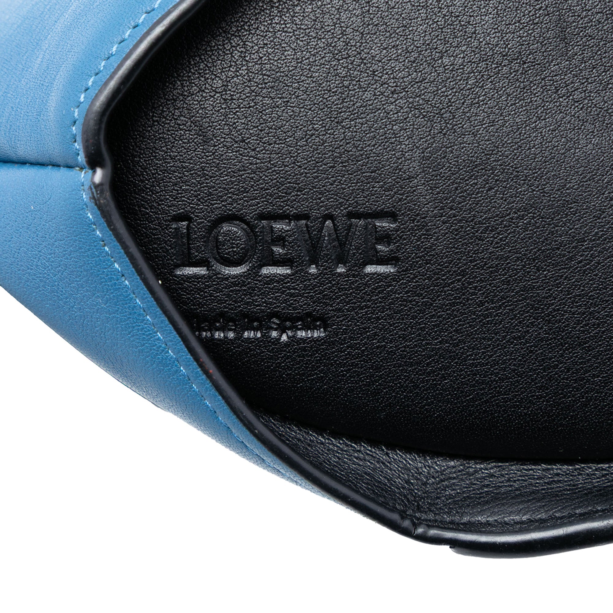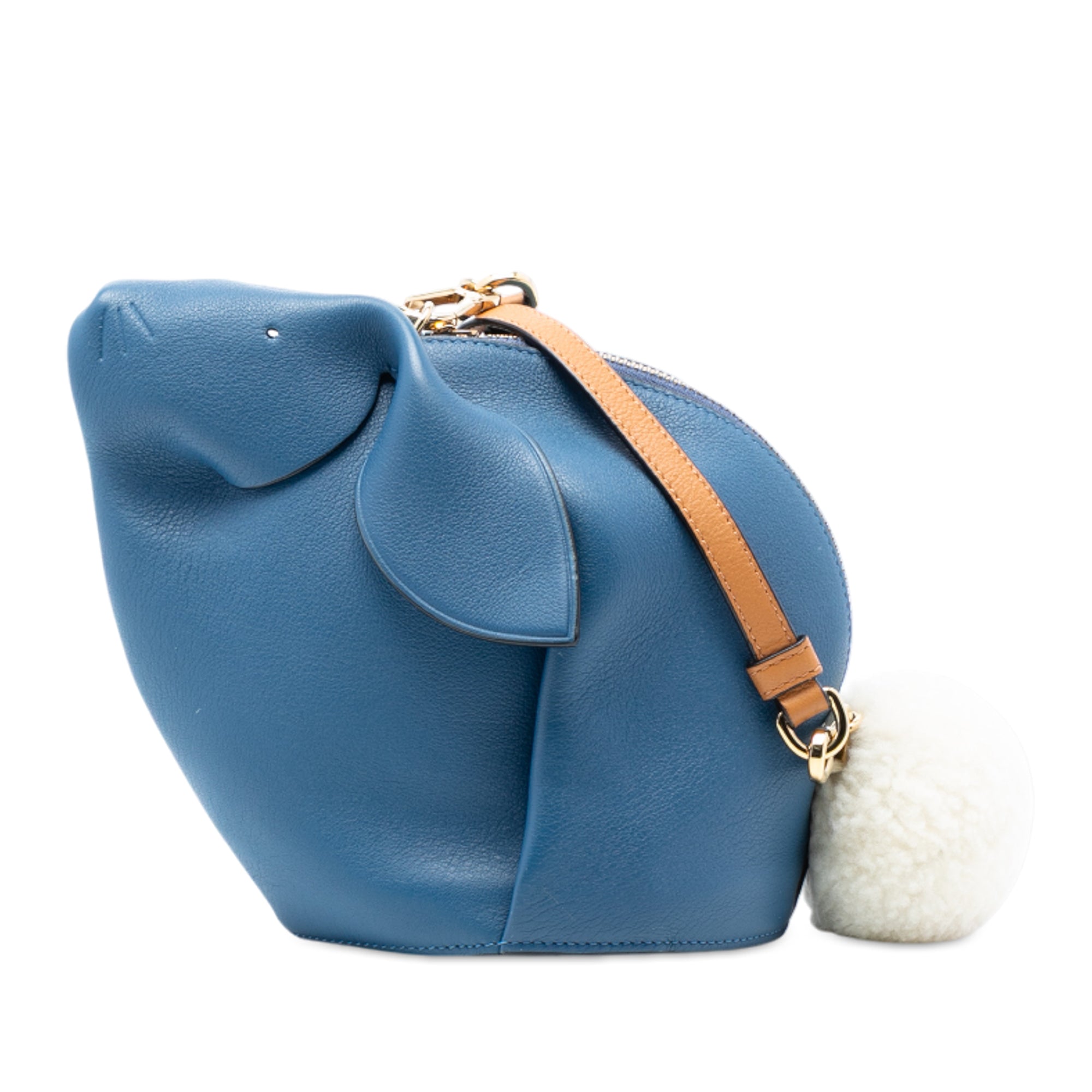 Product Details: Blue LOEWE Mini Calfskin Shearling Bunny Crossbody. This crossbody features a leather body, a detachable leather strap, and a top zip closure. 5.9" L x 4.7" W x 3.5" D. Serial number 101821.