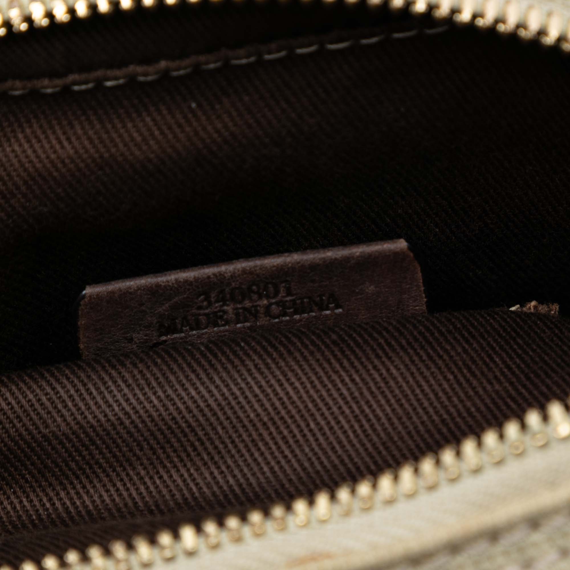Product Details: Brown LOEWE Mini Canvas Anagram Crossbody. This crossbody bag features a canvas body with leather trim, a flat canvas shoulder strap, a top zip closure, and an exterior back slip pocket. 5.1" L x 5.5" W x 1.6" D. Serial number 340801.
