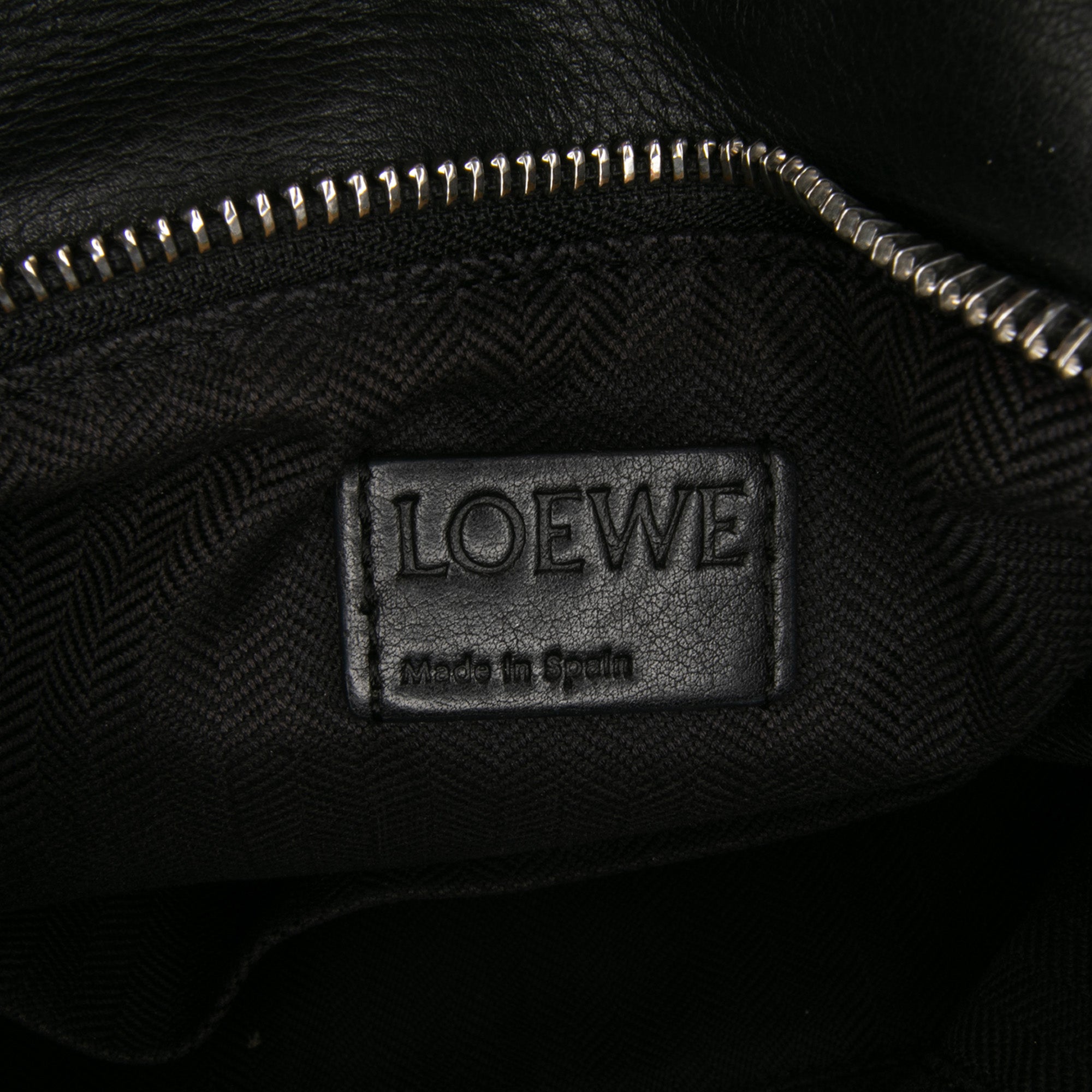 Product Details: Brown LOEWE Small Calfskin Graphic Puzzle Satchel. The Puzzle satchel features a leather body, a rolled top handle, an adjustable flat leather strap, a top zip closure, and an exterior zip pocket. 6.5" L x 9.6" W x 4.1" D, 2.8" drop. Serial number 061839.