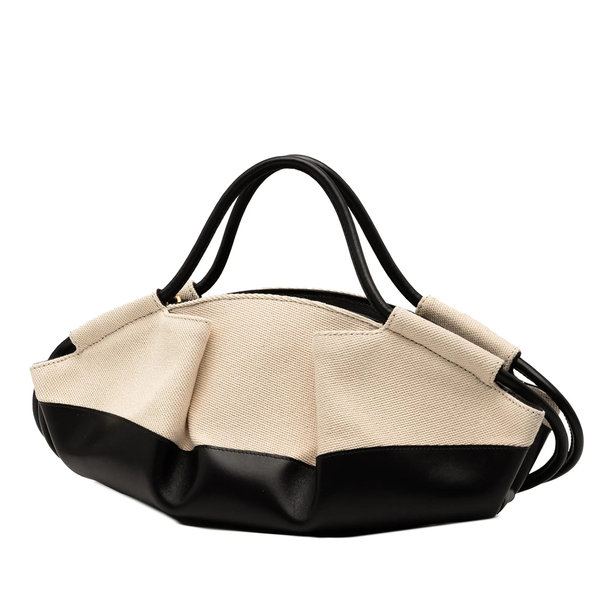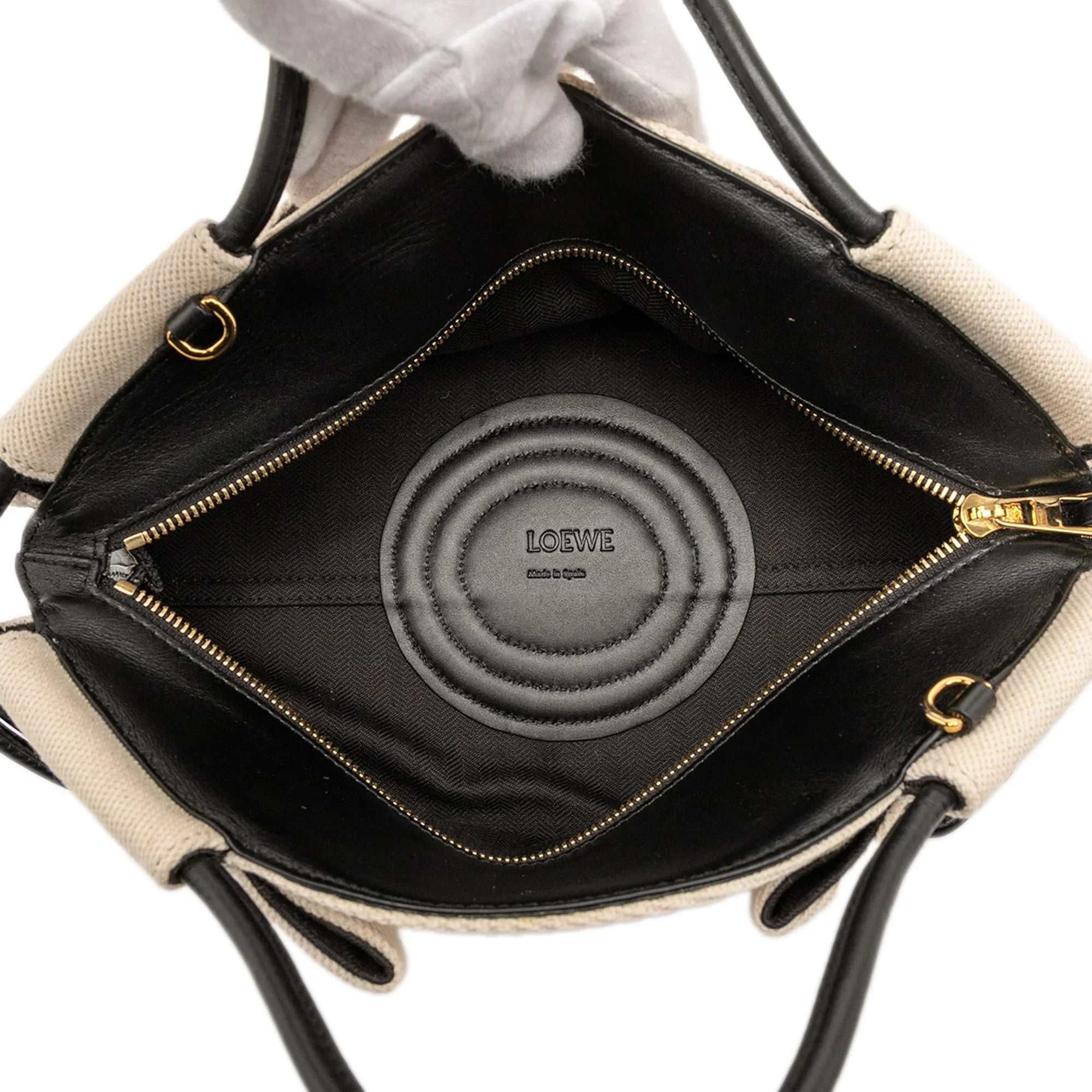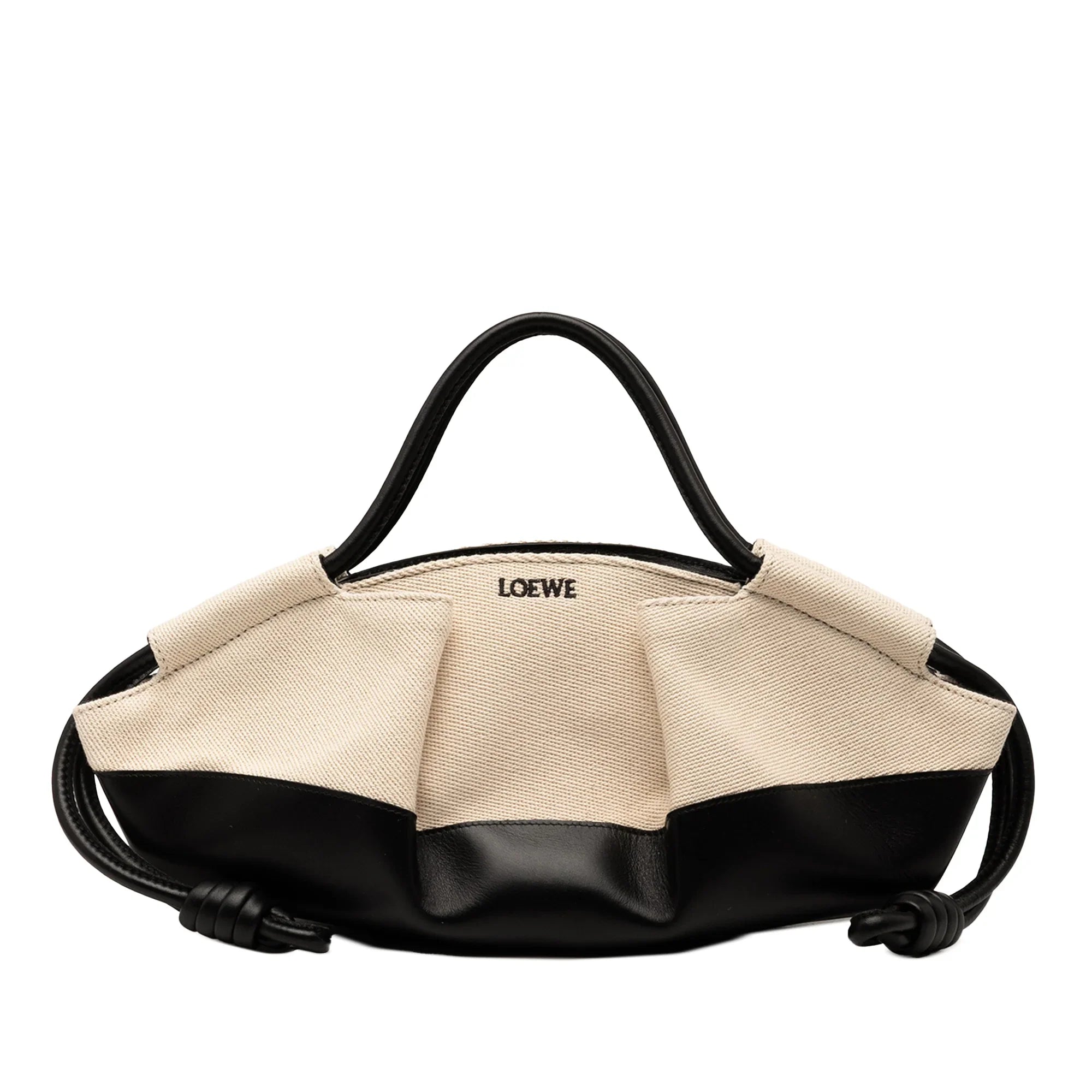 Product Details: Brown LOEWE Small Shiny Calfskin and Canvas Paseo Satchel. This satchel features a leather and canvas body, rolled leather handles with knot details, and a top zip closure. 6.1" L x 11.8" W x 5.9" D, 3.5" drop. Serial number 062329.