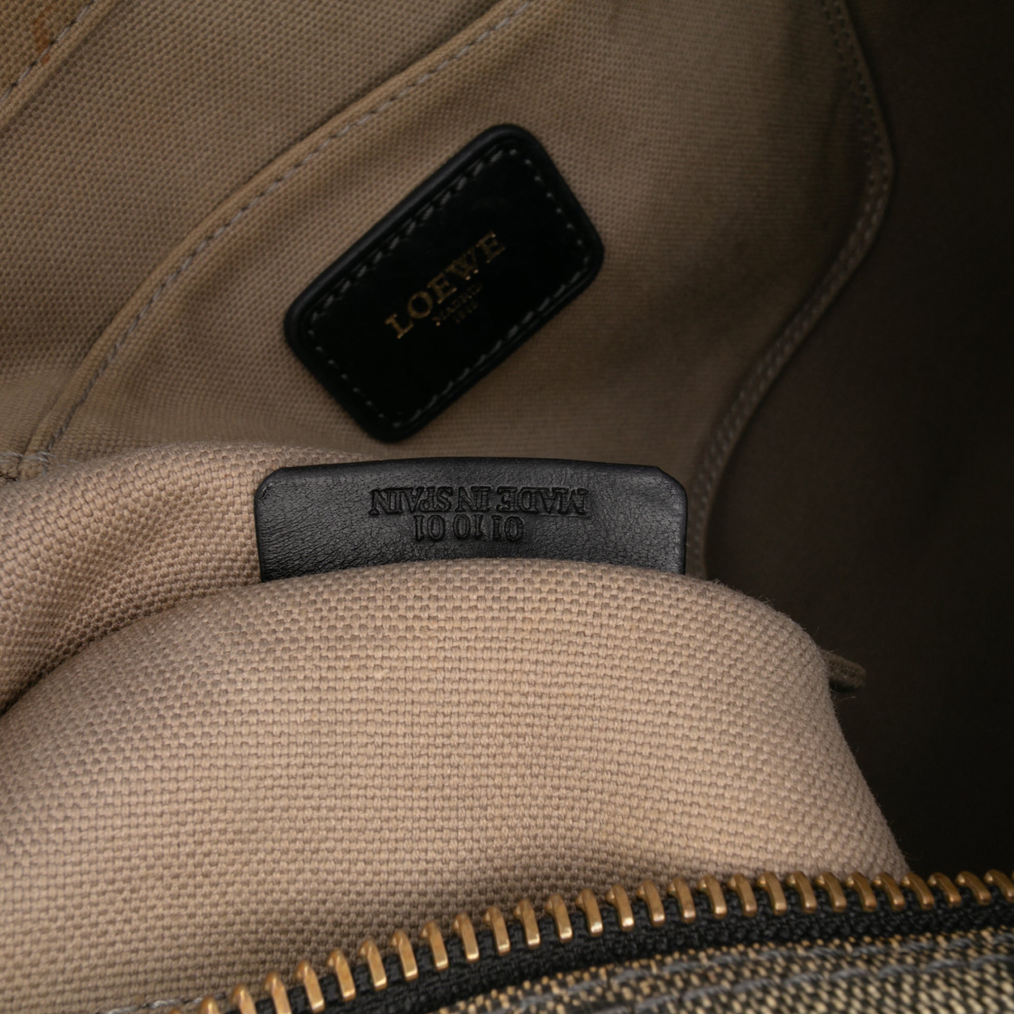 Product Details: Gray LOEWE Anagram Coated Canvas Handbag. This handbag features a coated canvas body with leather trim, rolled leather handles, a top zip closure, and an interior zip pocket. 6.7" L x 12.2" W x 5.1" D, 5.1" drop. Serial number 011001.