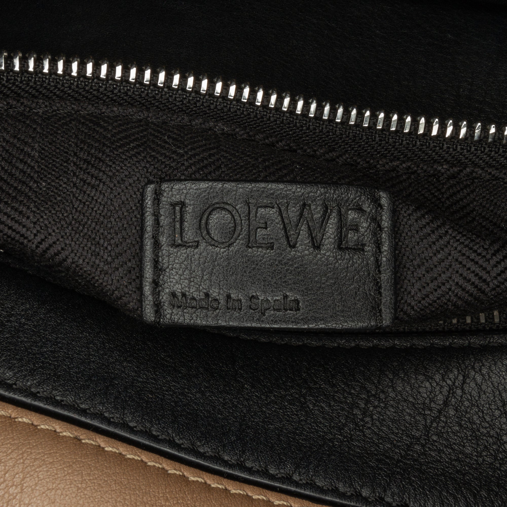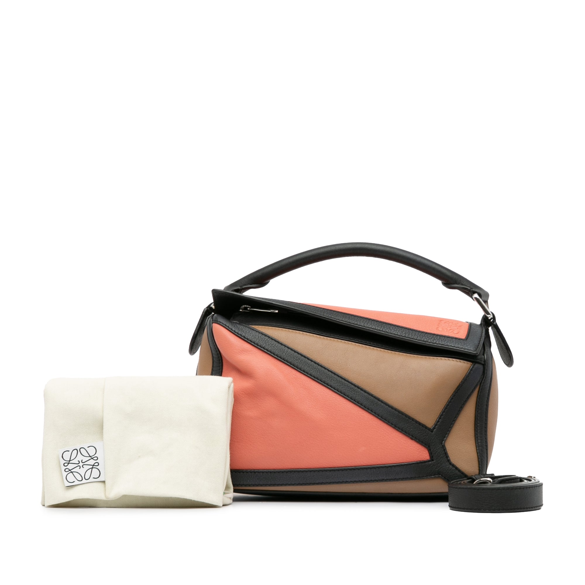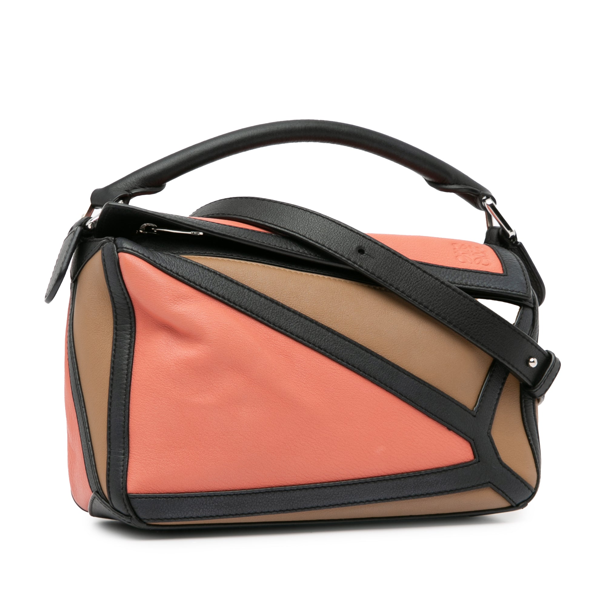 Product Details: Brown LOEWE Small Calfskin Graphic Puzzle Satchel. The Puzzle satchel features a leather body, a rolled top handle, an adjustable flat leather strap, a top zip closure, and an exterior zip pocket. 7.1" L x 9.8" W x 4.3" D, 2.8" drop. Serial number 061840.