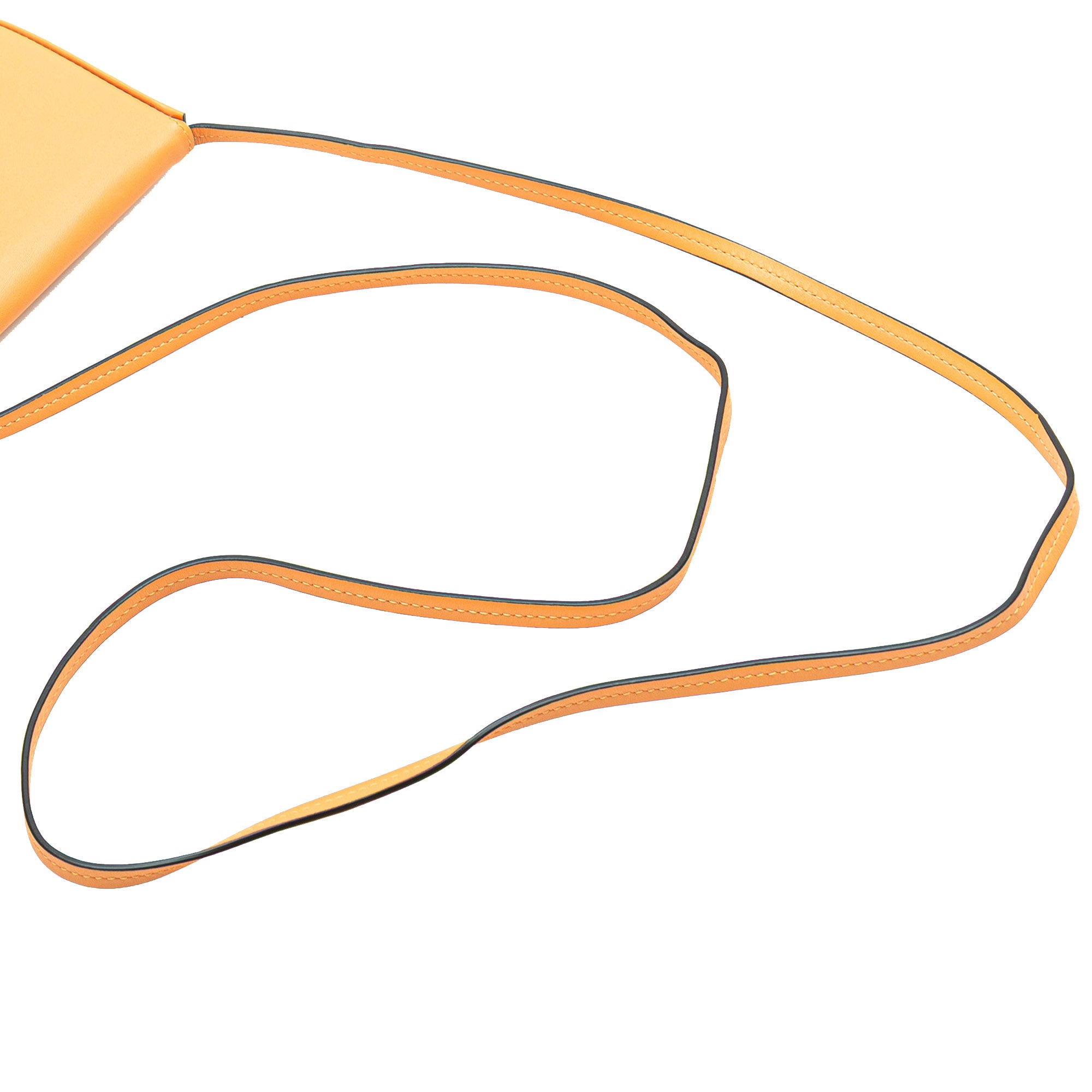 Product Details: Orange LOEWE Small Soft Calfskin Heel Pouch Crossbody Bag. The Heel crossbody bag features a leather body, a flat shoulder strap, a flap closure, and interior card slots. 4.7" L x 4.9" W x 0.8" D. Serial number 102004.