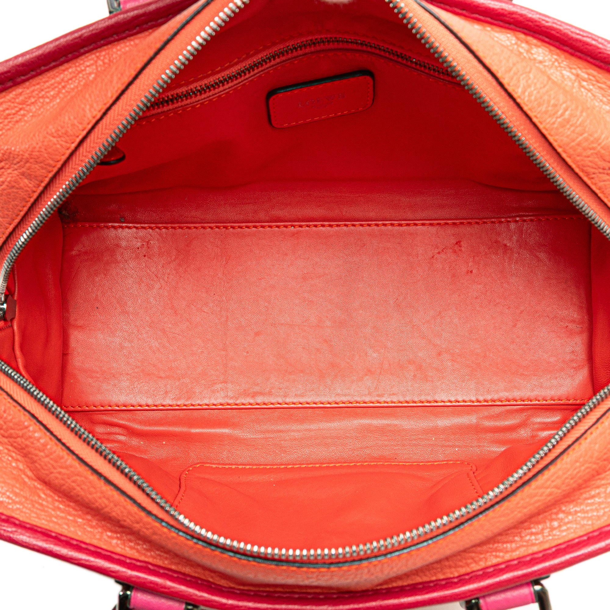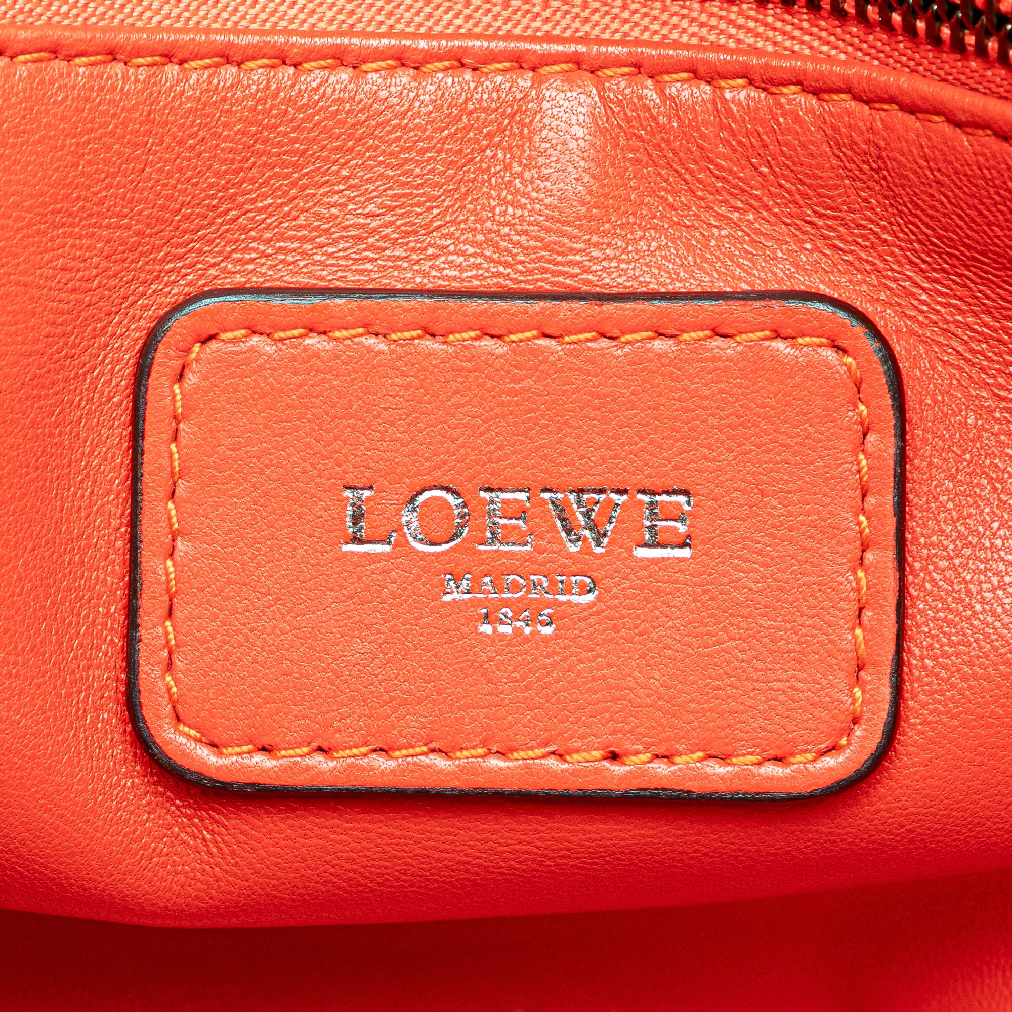 Product Details: Orange LOEWE Tricolor Goatskin Amazona 28 Handbag. The Amazona 28 features a goatskin leather body, rolled leather handles, a top zip closure, and interior zip and slip pockets. 6.3" L x 11.4" W x 5.1" D, 3.9" drop. Serial number 061109.