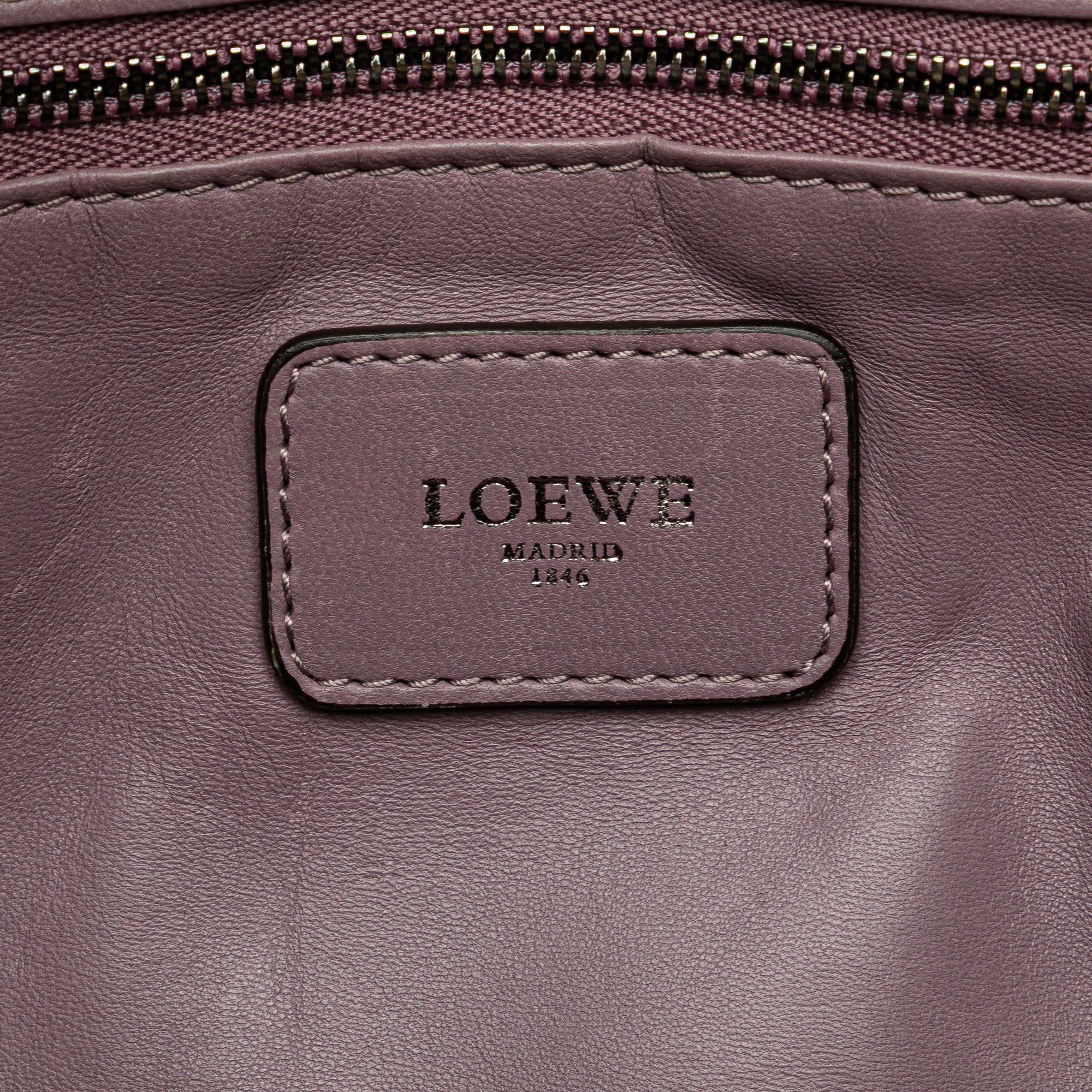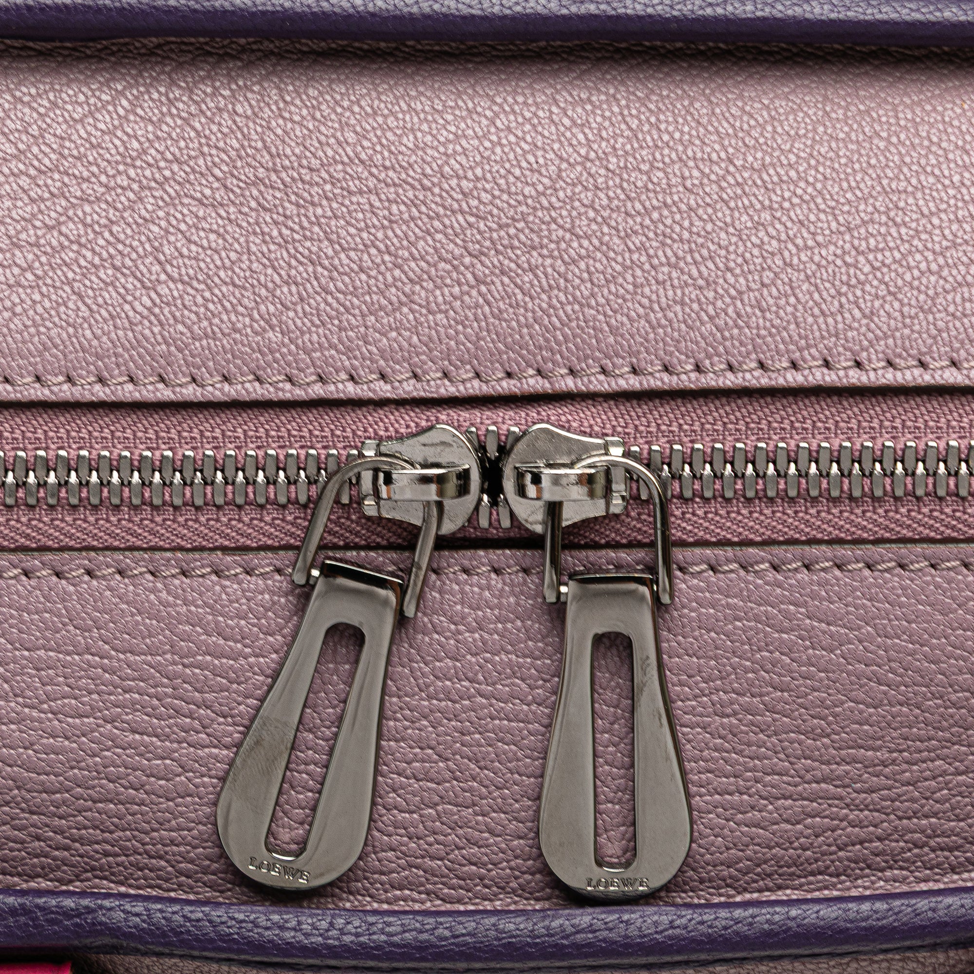 Product Details: Purple LOEWE Tricolor Goatskin Amazona 28 Handbag. The Amazona 28 features a goatskin leather body, rolled leather handles, a top zip closure, and interior zip and slip pockets. 6.5" L x 11.4" W x 5.1" D, 3.9" drop. Serial number 061206.