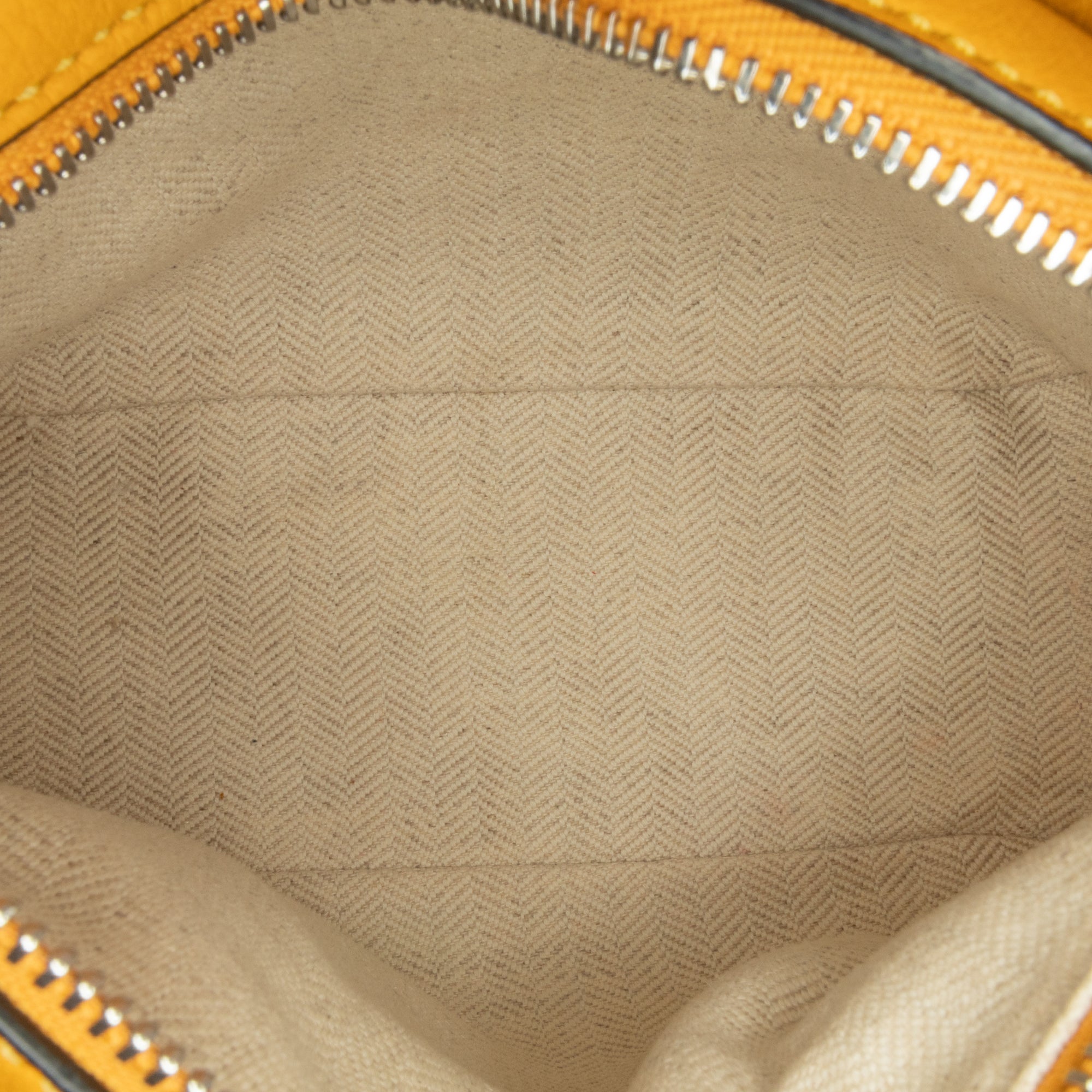 Product Details: Yellow LOEWE Mini Calfskin Puzzle Satchel. The Puzzle features a leather body, a rolled leather top handle, an adjustable and detachable flat leather strap, and a top flap and zip closure. 4.3" L x 6.7" W x 2.8" D, 2.6" drop. Serial number C 012019.