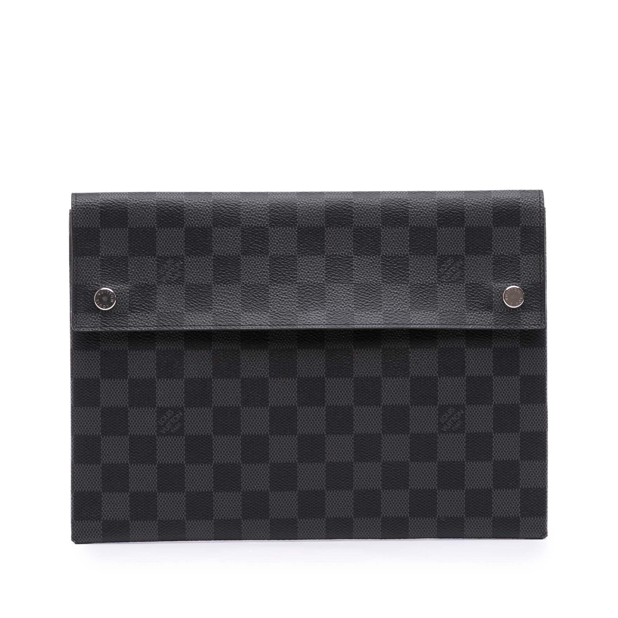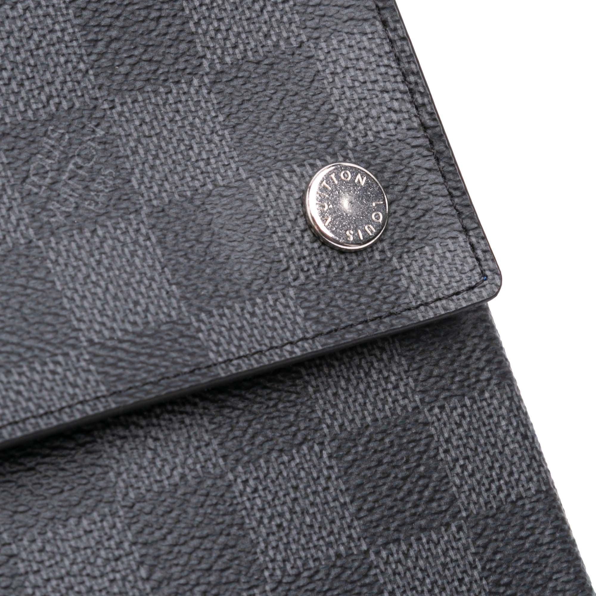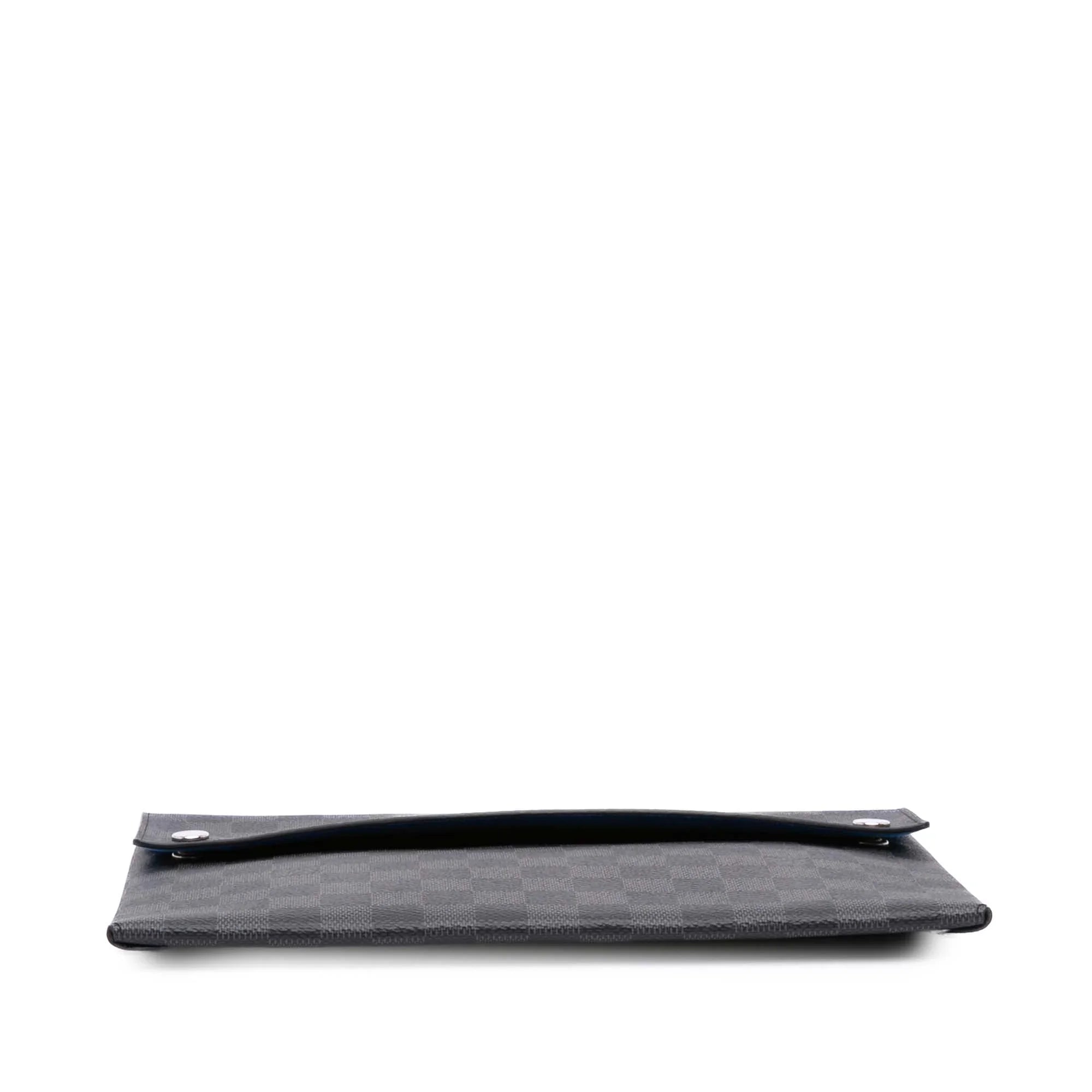 Product Details: Black Louis Vuitton Damier Graphite Alpha Pochette GM Clutch Bag. These Alpha Pochette features a damier graphite canvas body, and a front flap with snap button closures. 7.9" L x 11" W x 0.2" D. Serial number RA2169.