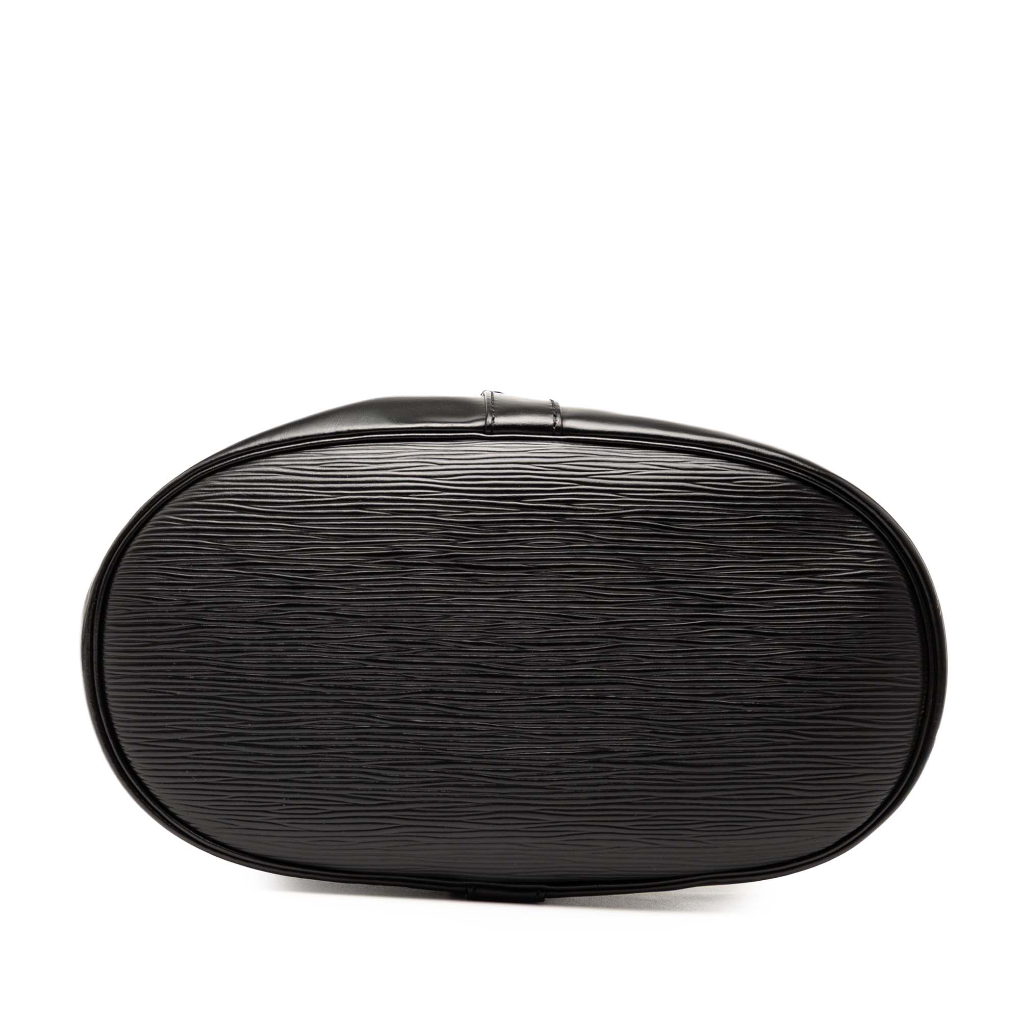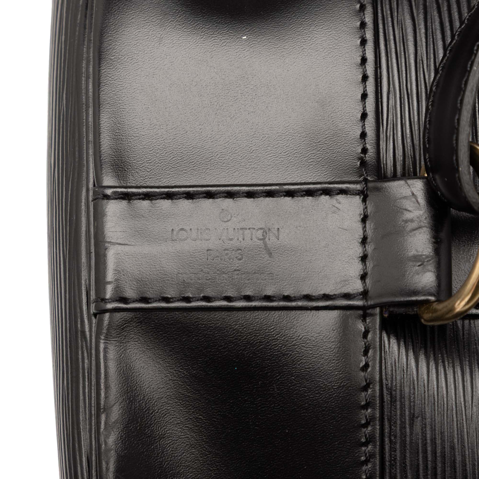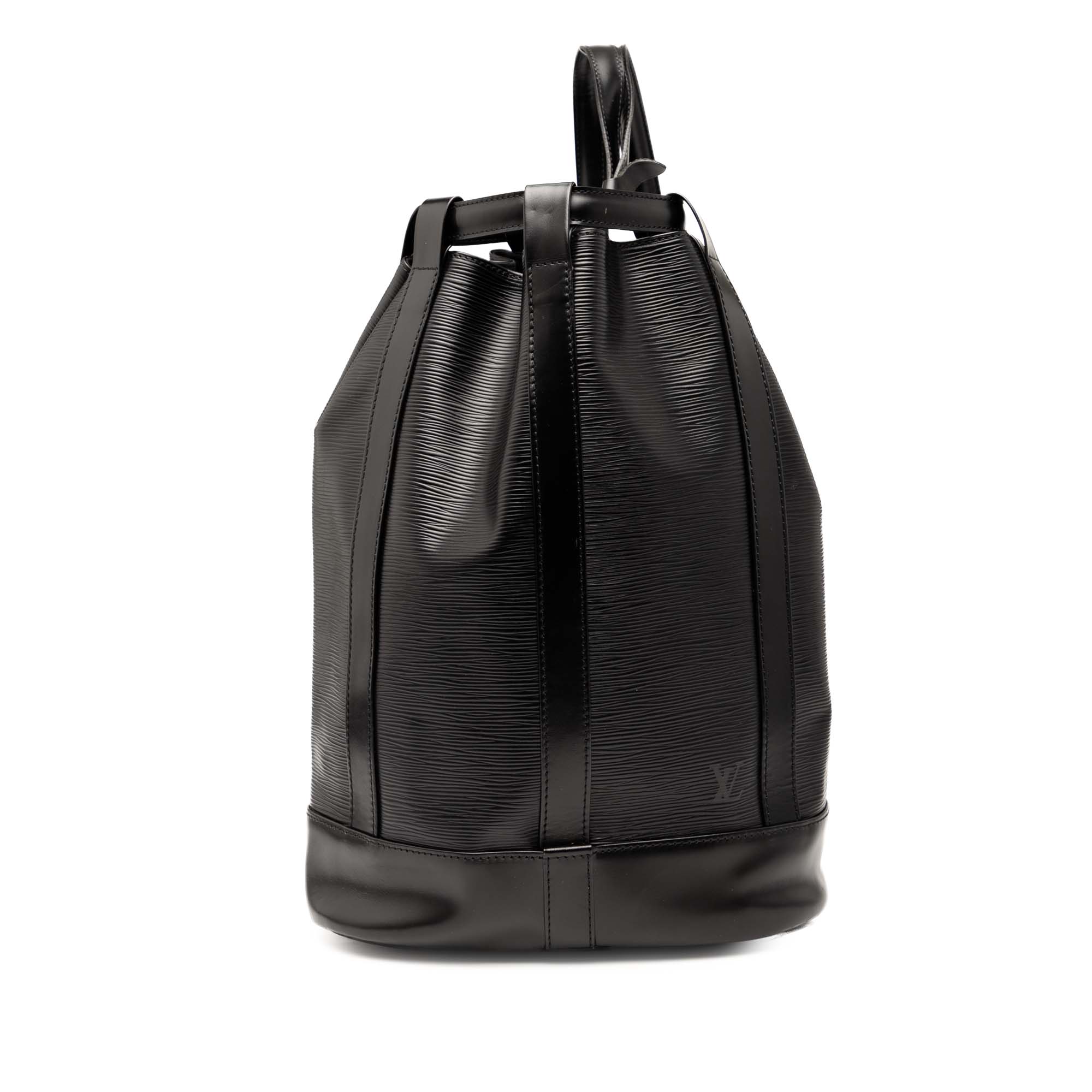 Product Details: Black Louis Vuitton Epi Randonnee PM Backpack. The Randonnee PM features an epi leather body, flat leather straps, and an open top with a drawstring closure. The straps were reglued. 14.2" L x 11" W x 5.9" D. Serial number AR0935.